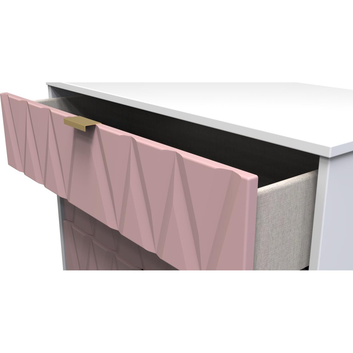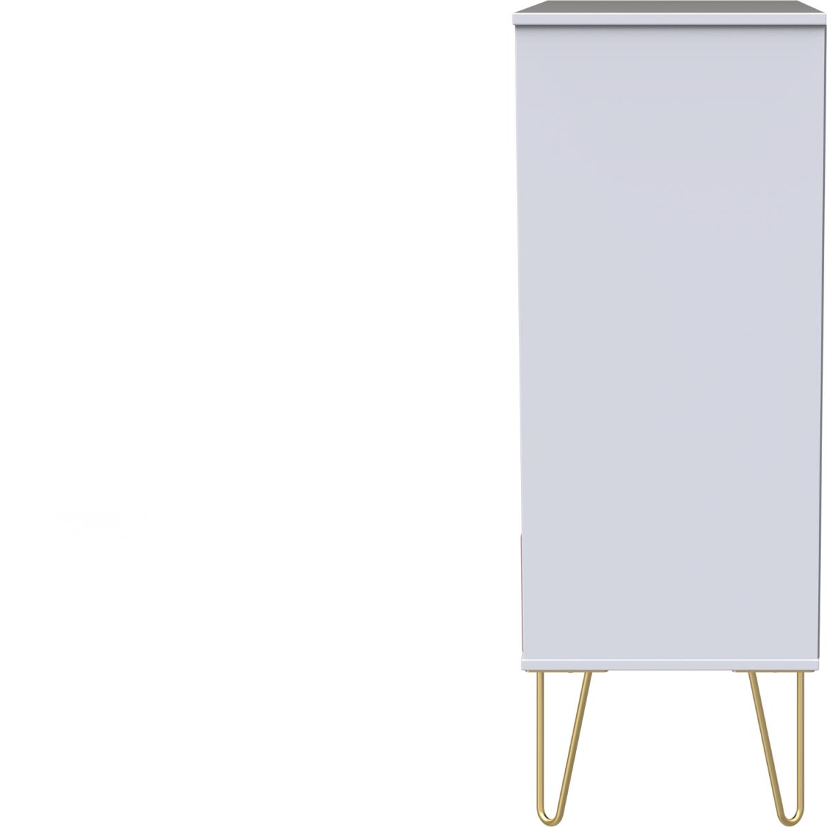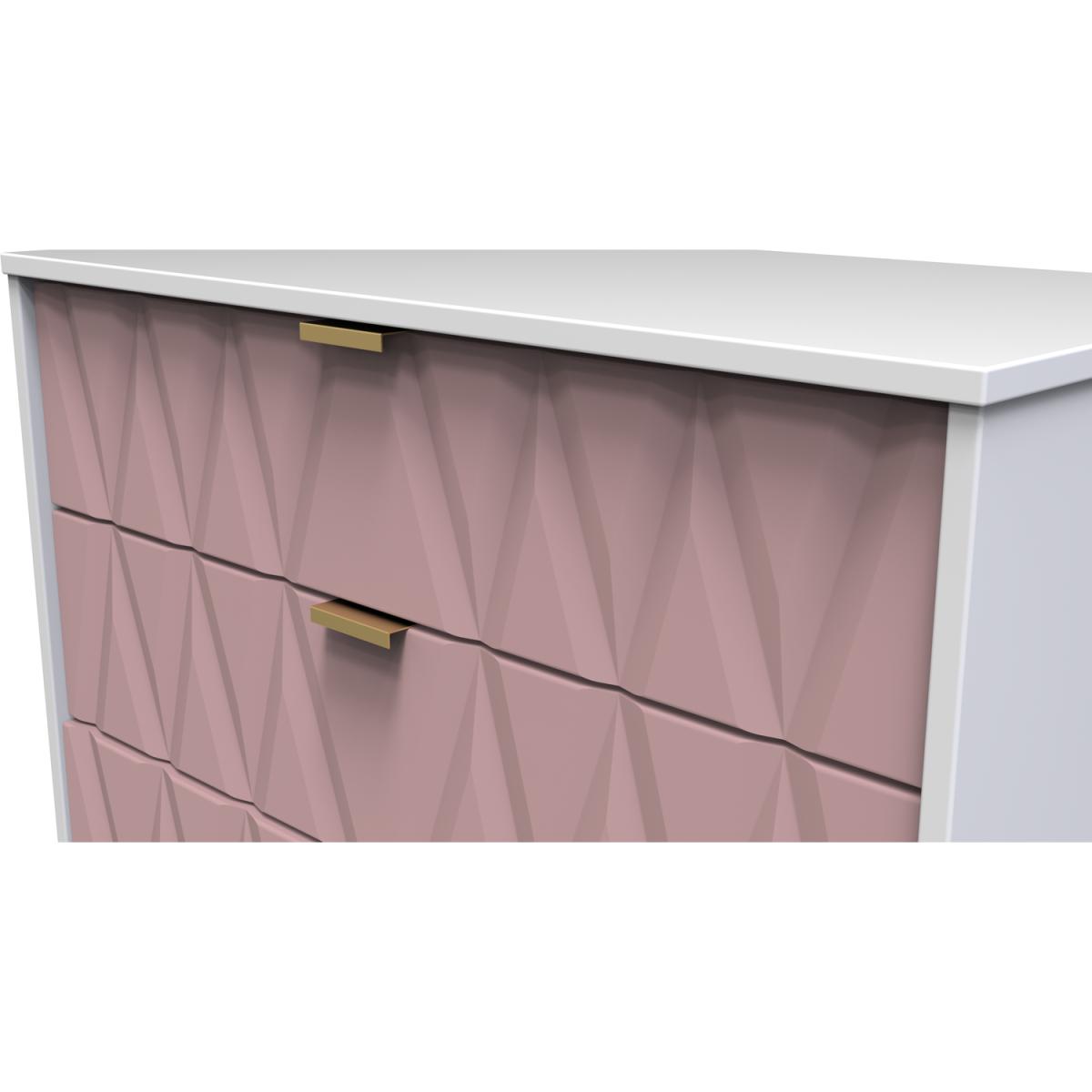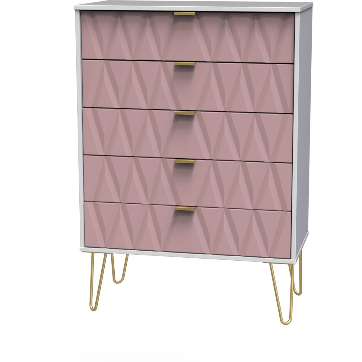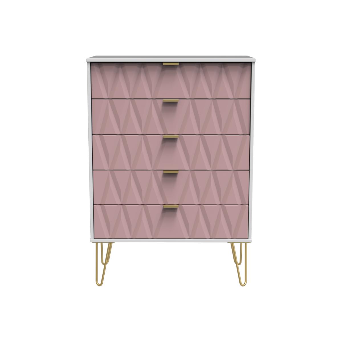 This wide 5 drawer chest of drawers is practical and stylish. Perfect for any home as a free standing storage unit. Say hello to contemporary cool with the Diamond range, with distinctive patterned drawers and a variety of colour options available to compliment any interior design. Gold metal handles and sturdy hairpin legs complete the storage solution. All our furniture is made in the United Kingdom, to the highest quality. It is delivered direct to your location of choice by one of our two man delivery teams, and come full assembled (although legs may be removed to prevent damage in transit).