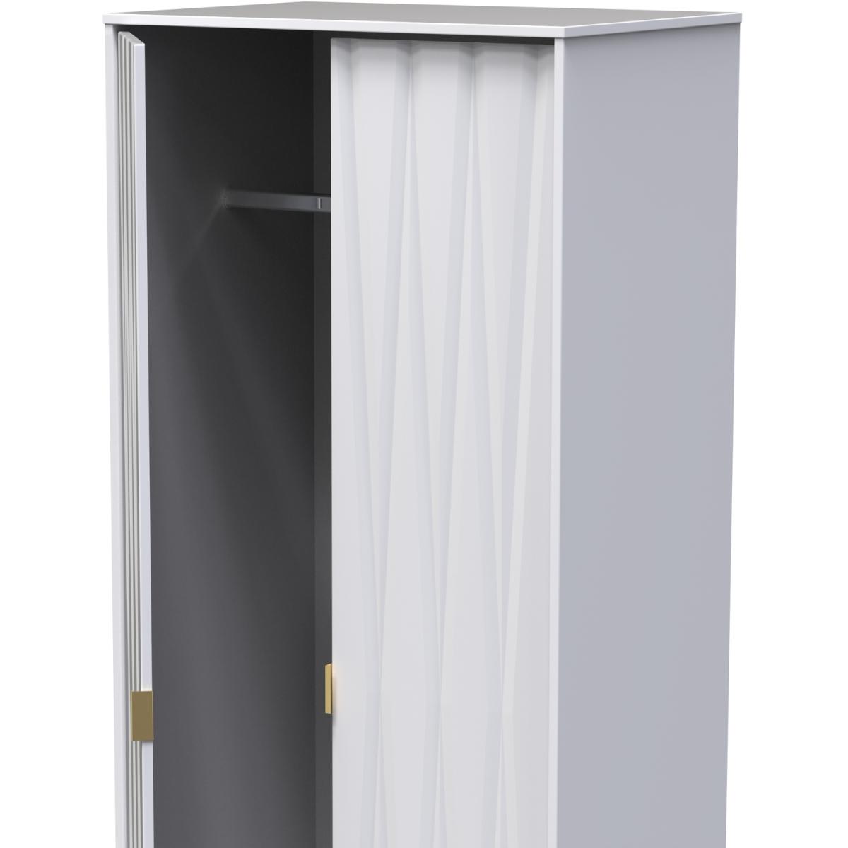 This tall double door wardrobe is perfect for any bedroom.. Say hello to contemporary cool with the Diamond range, with distinctive patterned drawers and a variety of colour options available to compliment any interior design. Gold metal handles and sturdy hairpin legs complete the storage solution. All our furniture is made in the United Kingdom, to the highest quality. It is delivered direct to your location of choice by one of our two man delivery teams, and come full assembled (although legs may be removed to prevent damage in transit).