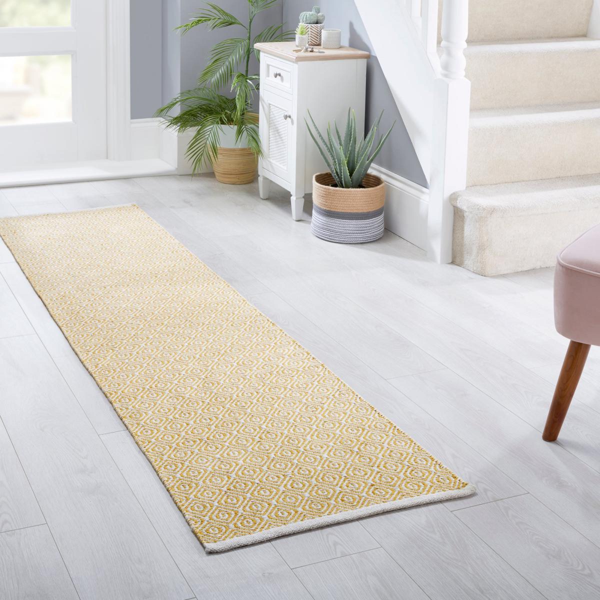 I love this yellow runner for its bright, uplifting tone that can instantly energise a space. It works particularly well in contemporary or Scandinavian interiors, where its clean pattern and vibrant colour can add a cheerful touch without overwhelming the room. Practical styling tips include pairing it with neutral or pastel furniture to let the yellow really pop, and layering with other textured accessories like cushions or throws for added depth. Its slim profile makes it ideal for narrow hallways or alongside a sleek dining table, offering both function and a stylish splash of colour.