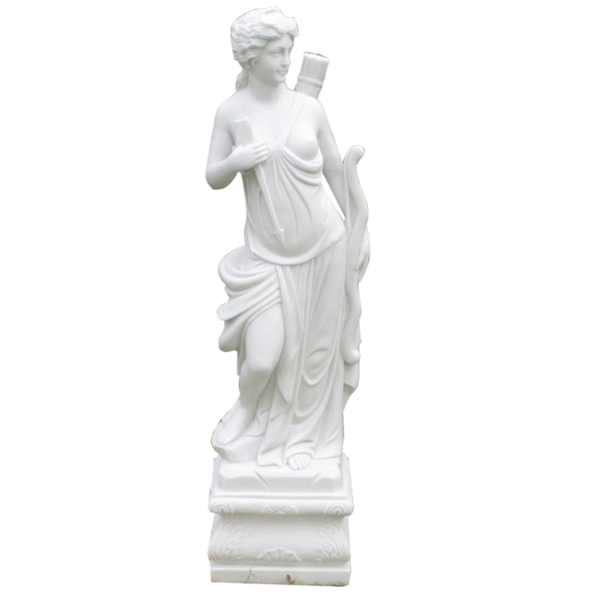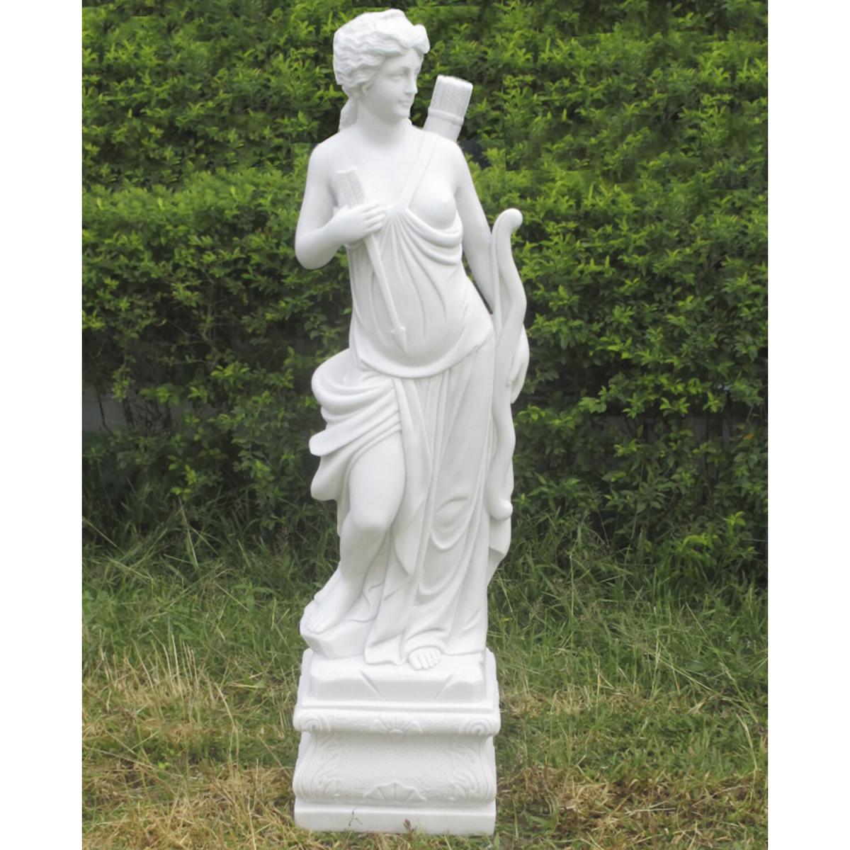 The Diana Huntress Statue depicts the Roman Goddess of The Hunt and The Moon. Draped in traditional roman garb, she holds an arrow in one hand with a quiver slung across her back. Made from marble resin to bring that classical art aesthetic, while also remaining frost-resistant, this tall statue will look absolutely regal placed in your garden or on your patio.