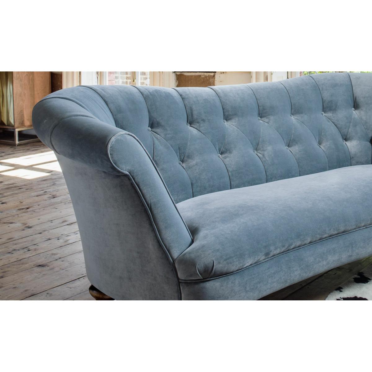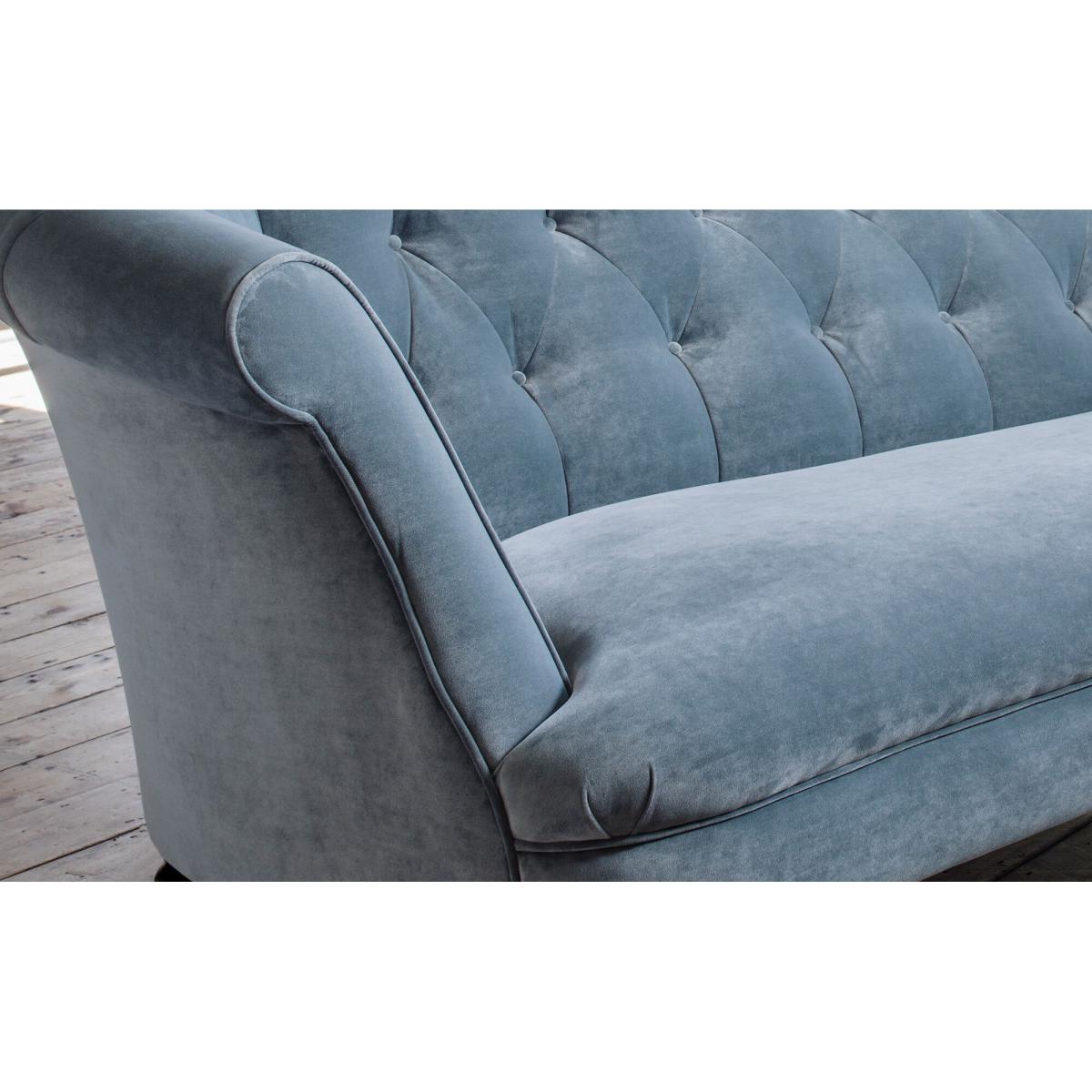 Handcrafted in the UK by a lovely family business, our Diana sofa is an elegant sofa with a tall curved button back and an enveloping feel. A contemporary take on the classic Chesterfield style, each supportive sofa is handcrafted with a tall, curved button back and arms. The Diana is available in two sofas sizes and an ottoman which are made to order in an array of fabrics. Pictured: two and a half seater sofa in Blue Savoy Stain Guarded Velvet. Handmade in 8-12 weeks and then delivered usually within 10 working days.