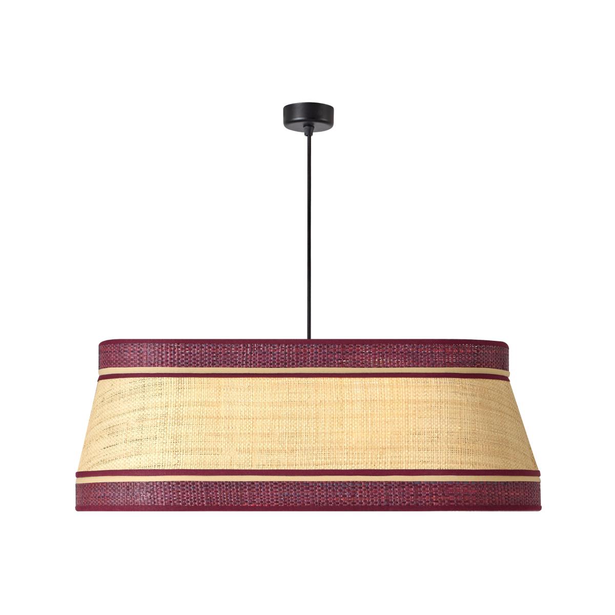 Diana is a Pendant in Raffia with an oblong shape and imposing dimensions. Soft curves and graphic lines take center stage for a balanced diffusion of light. The Lampshade features a bold color combination of Natural and Blackcurrant. The Lampshade is trimmed with matching cotton bias in blackcurrant.