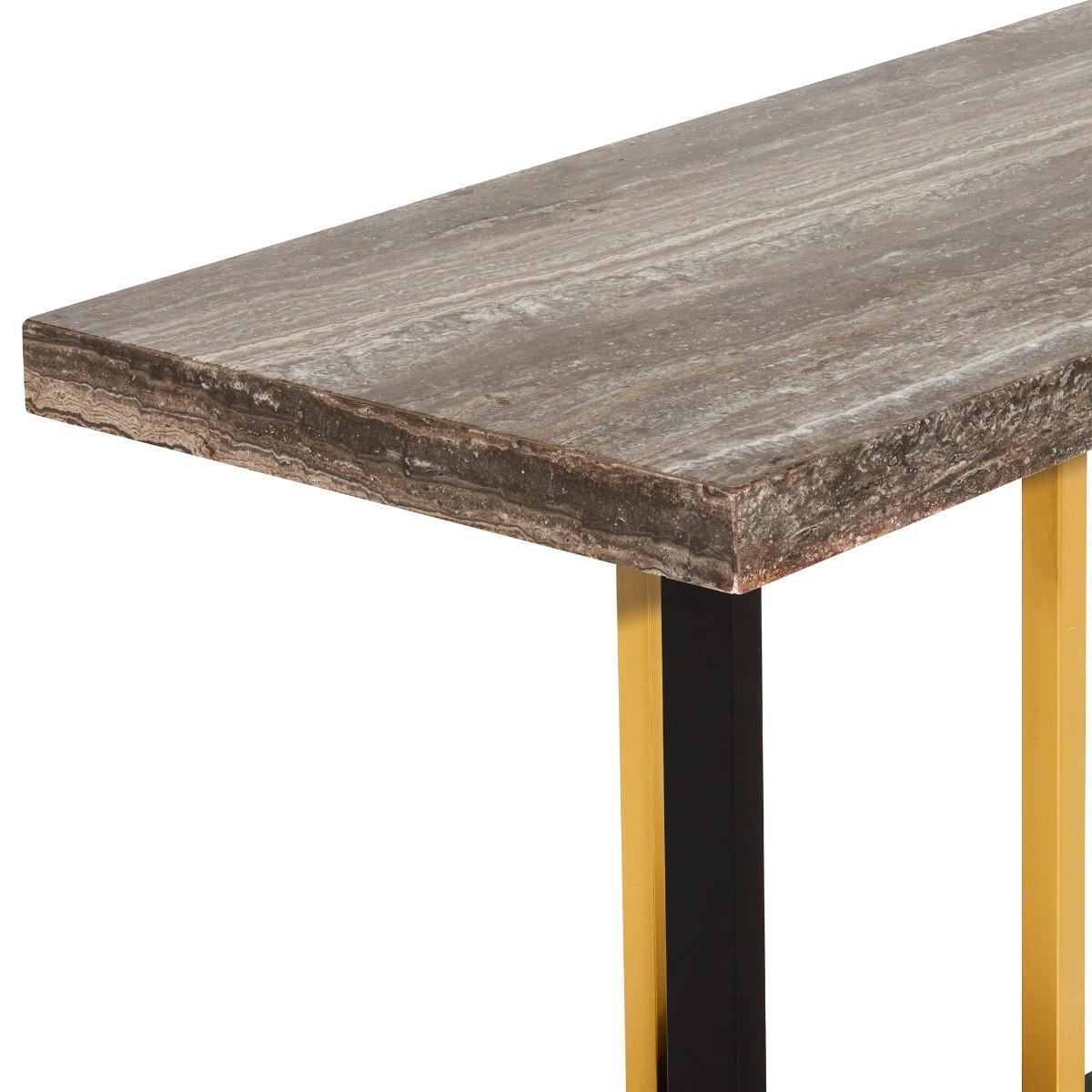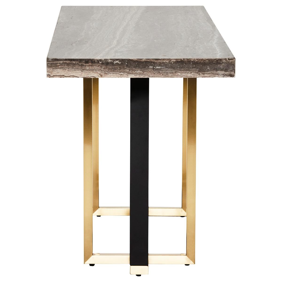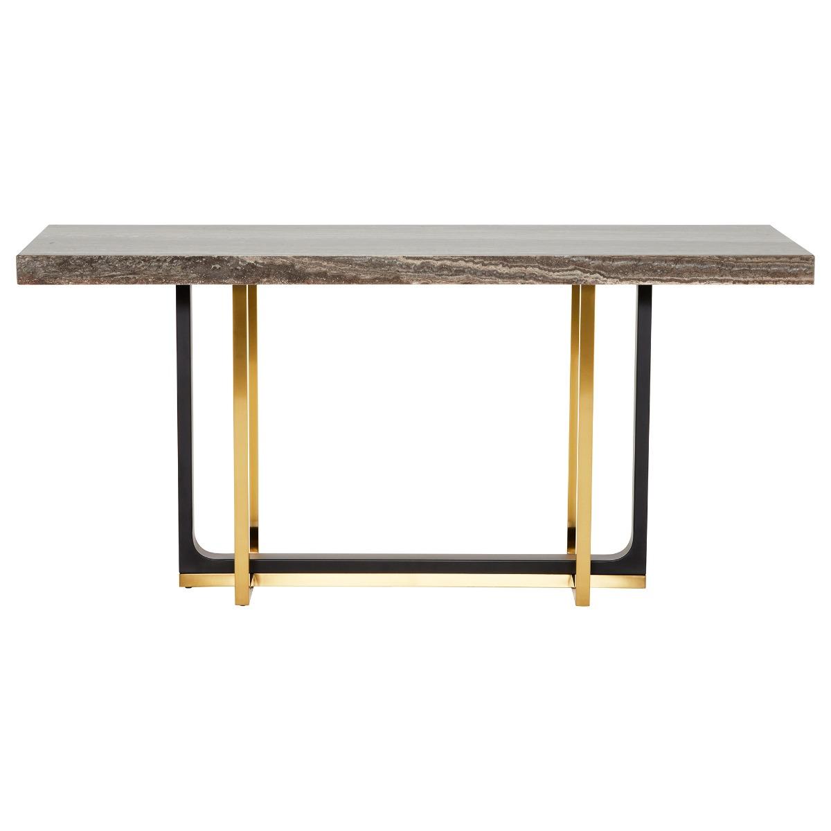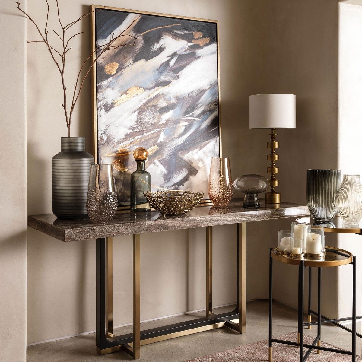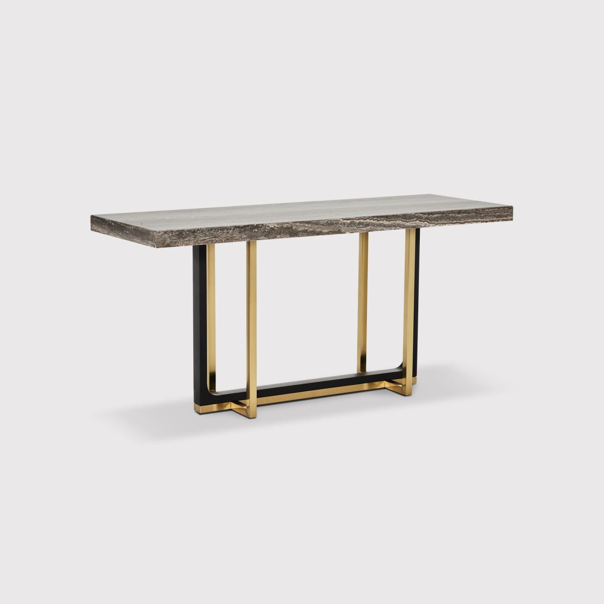 Showcase your favourite accessories and fresh flowers atop the Dice Console Table. Featuring slim legs and luxurious grey table top to keep your room feeling spacious, yet featuring bold blacknbsp;and gold shades to dominate the style of the room and draw the eye, the Dice Console Table gives you the best of both.