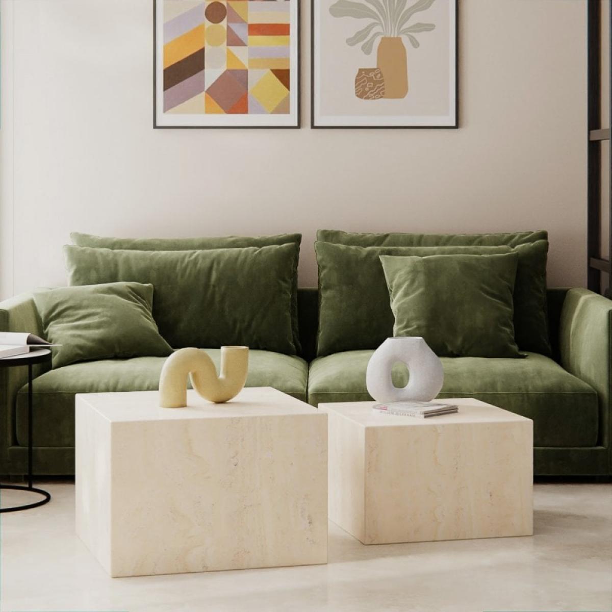 The Dice coffee table set is a modern, functional furniture option. Its cubist design with natural travertine stone effect will add an elegant touch to your living space. The coffee tables aren't limited to just coffee tables; they also make great conversation pieces, or use them as a surface for plants and home decor. Easy to clean and truly unique, the Dice is an eye-catching piece of design.