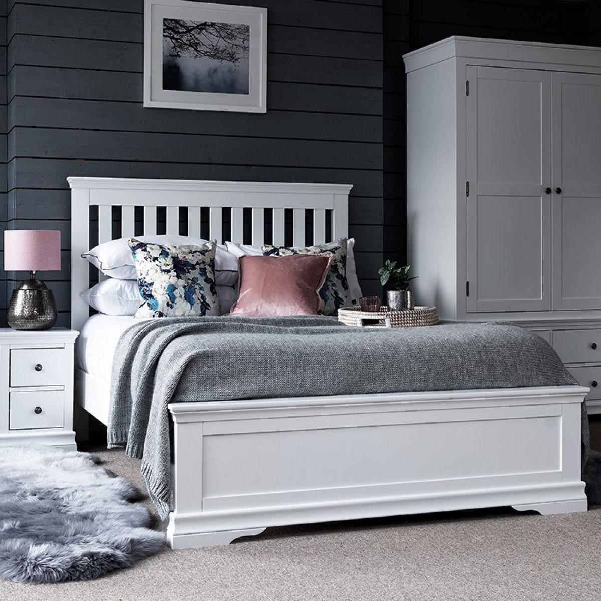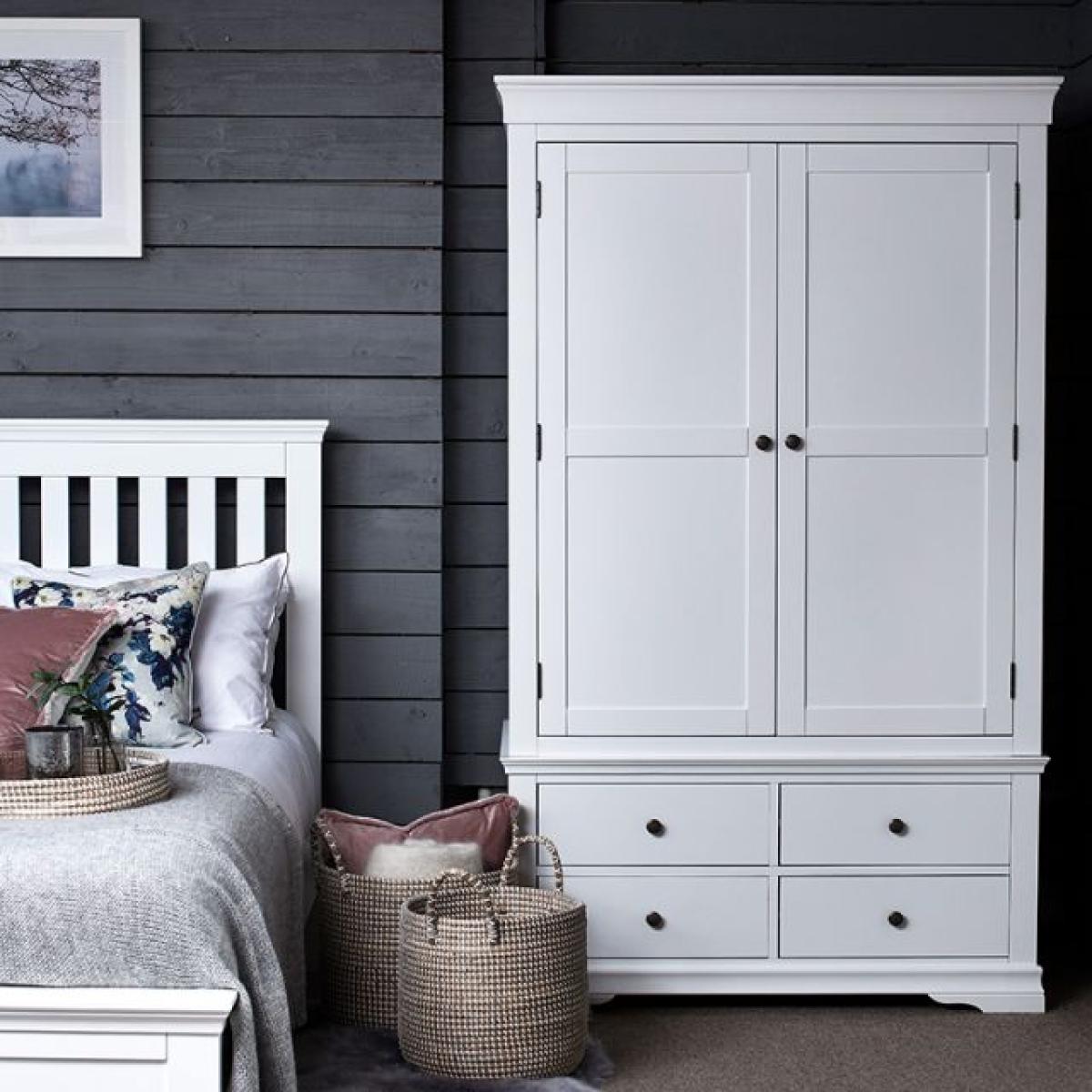 The Didcot 2 door. White wardrobe with drawers. Is a timeless piece of bedroom furniture. This 2 door white wardrobe with drawers is elegantly painted in classic white and complemented with dark contrasting handles, it will look truly stylish in any bedroom. A stunning example of classic white bedroom furniture, the Didcot 2 door white wardrobe has plenty of space for you to hang up your clothes and also features 4 drawers for foldable garments. Team this stylish white wardrobe with the rest of the Didcot white wood bedroom furniture collection to complete the look.