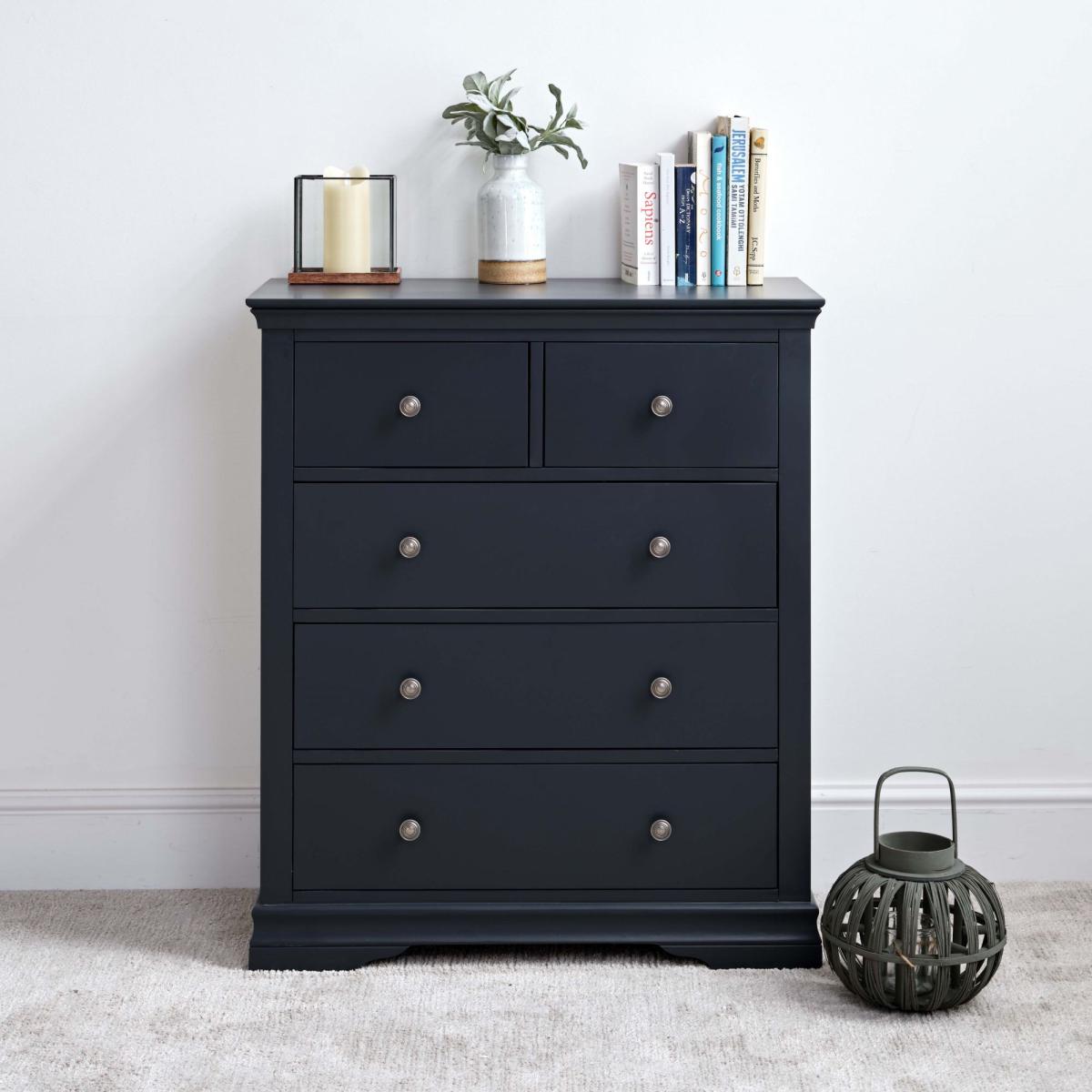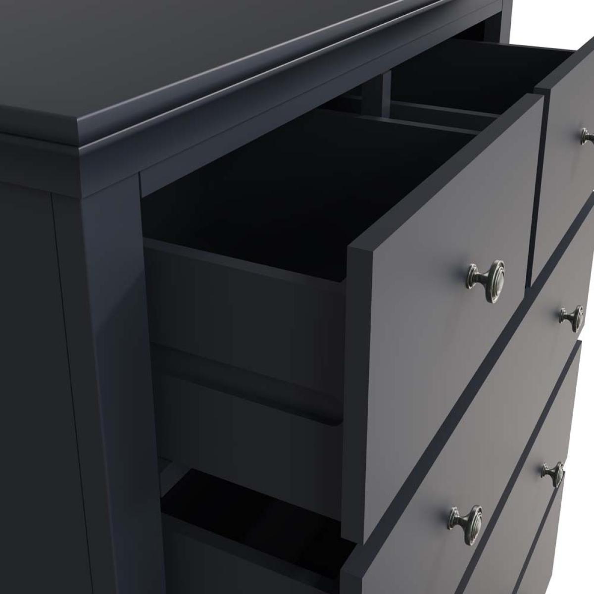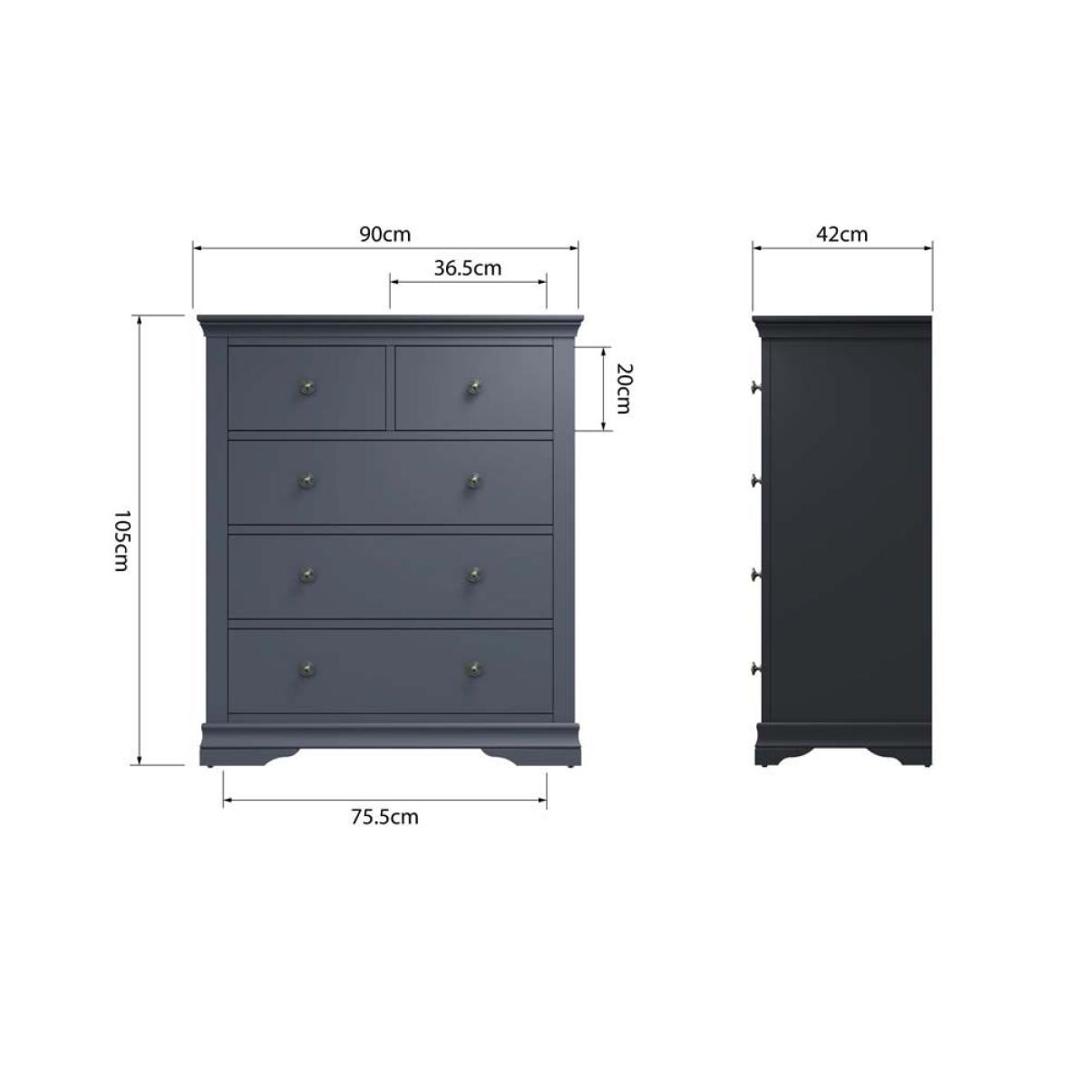 The Didcot 2 over 3 Drawer Chest features five drawers in a configuration where the top row has two smaller drawers with three larger full width drawers below. All drawers are fronted by antiqued brass knobs and the signature wood design features around the top and base which the Didcot ranges are famous for. Great in the bedroom but also perhaps in the sitting room or hallway. The Didcot Collection in Midnight Blue is a sophisticated twist on the traditional style.