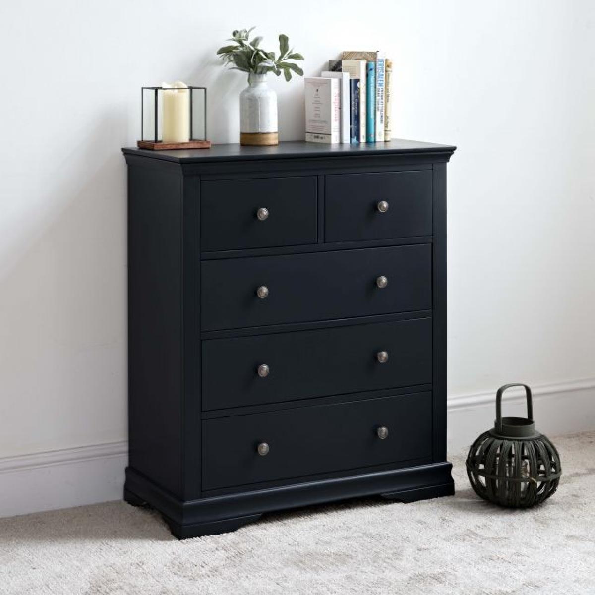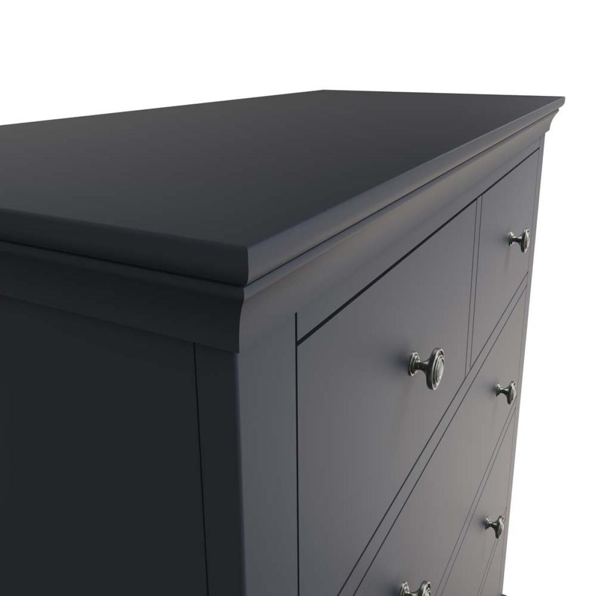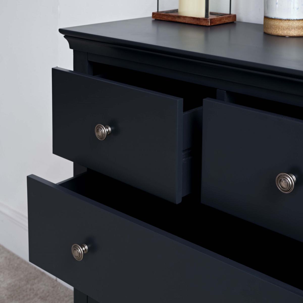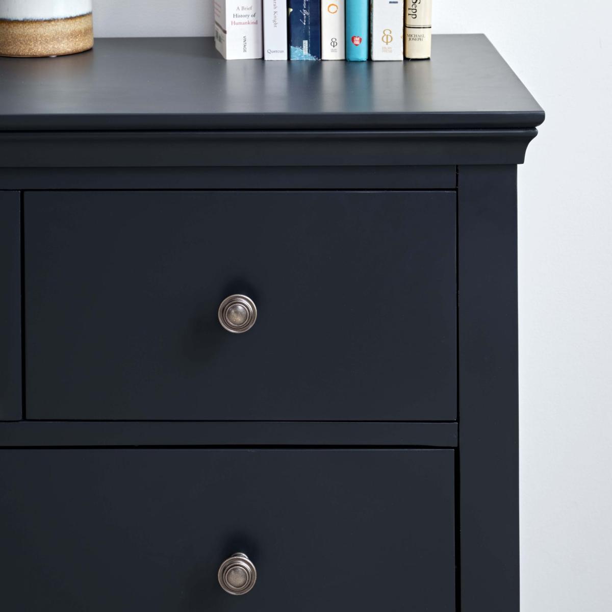 The Didcot 2 over 3 Drawer Chest features five drawers in a configuration where the top row has two smaller drawers with three larger full width drawers below. All drawers are fronted by antiqued brass knobs and the signature wood design features around the top and base which the Didcot ranges are famous for. Great in the bedroom but also perhaps in the sitting room or hallway. The Didcot Collection in Midnight Blue is a sophisticated twist on the traditional style.