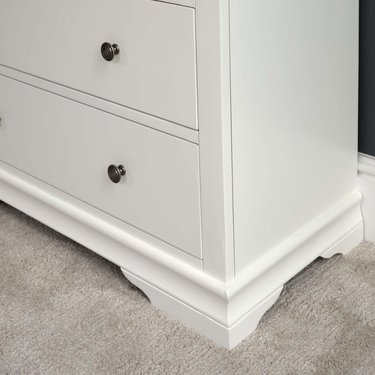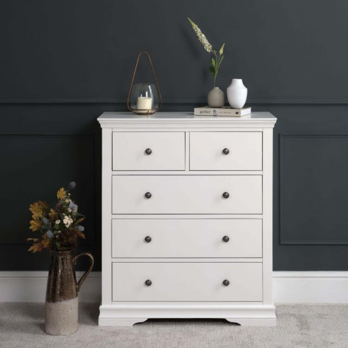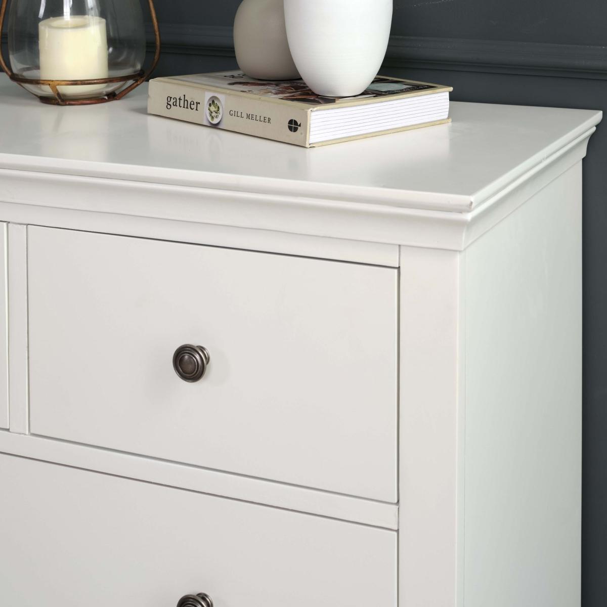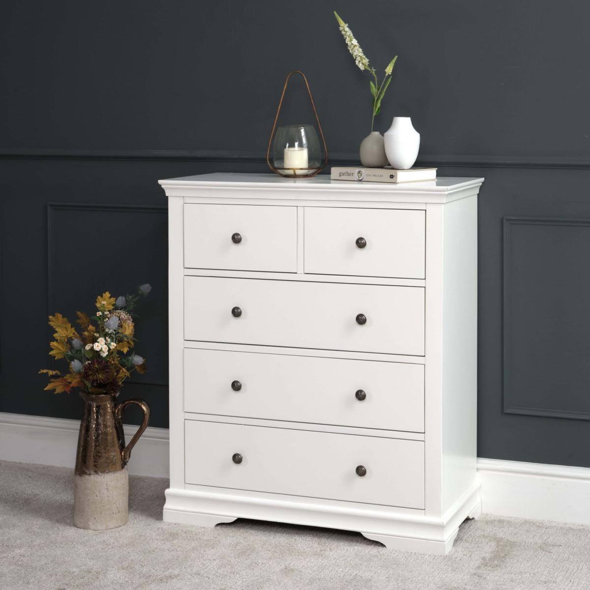 The Didcot 5 drawer chest of drawers is a timeless piece of bedroom furniture. This. White chest of drawers. Has 2 small drawers at the top and 3 full width drawers underneath. Beautifully painted in classic white and complemented with dark contrasting handles, it will look truly stylish in any bedroom. A stunning example of classic white bedroom furniture, the Didcot 5 drawer chest of drawers is the perfect storage solution for your bedroom, providing you with ample space to store away all of your clothes. Team this white chest of drawers with the rest of the Didcot white wood bedroom furniture collection to complete the look. Dimensions: 90cm x 42cm x 105cm.
