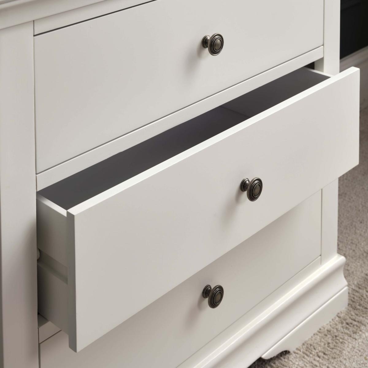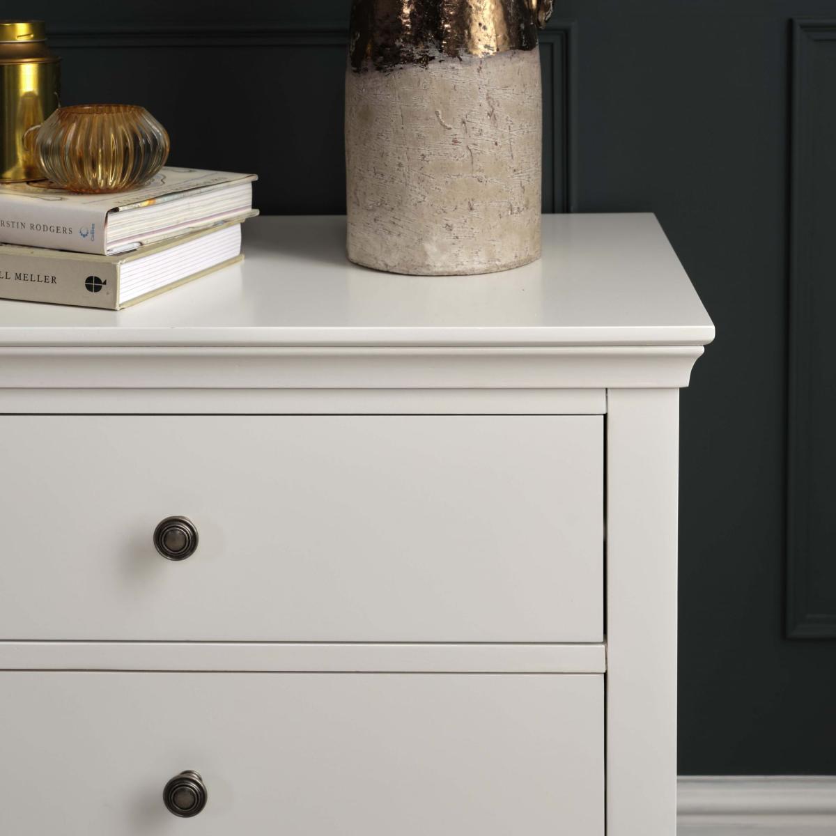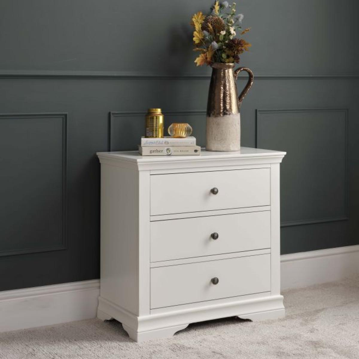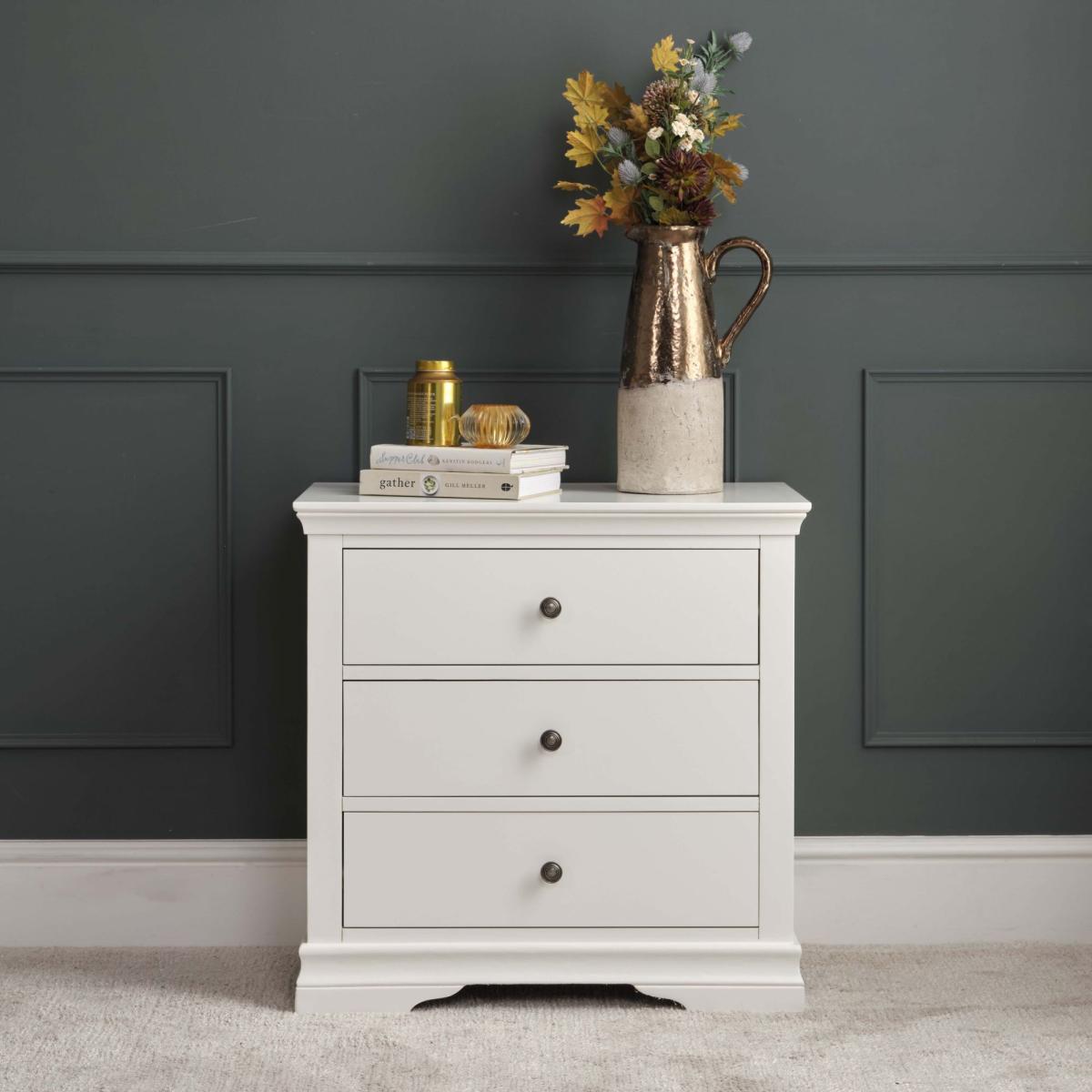 The Didcot 3 drawer chest of drawers is a timeless piece of bedroom furniture. This. White chest of drawers. Is beautifully painted in classic white and complemented with dark contrasting handles, it will look truly stylish in any bedroom. A stunning example of classic white bedroom furniture, the Didcot white 3 drawer chest of drawers is the perfect size for a guest room for your visitors to store away their clothes. Team this white chest of drawers with the rest of the Didcot white wood bedroom furniture collection to complete the look. Dimensions: 75cm x 42cm x 75cm.