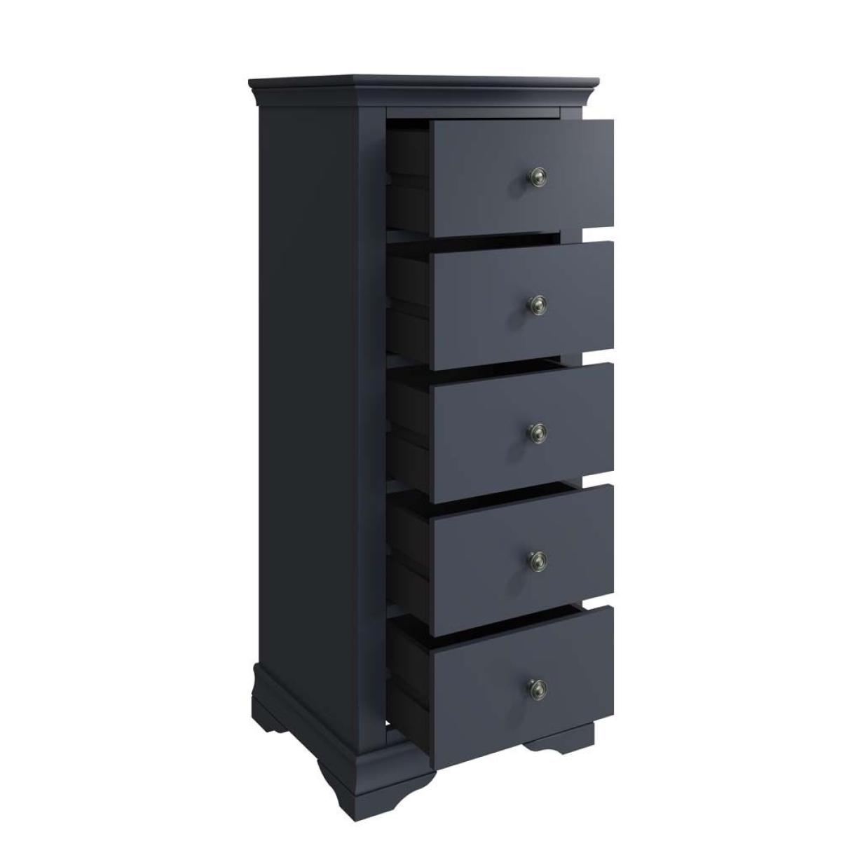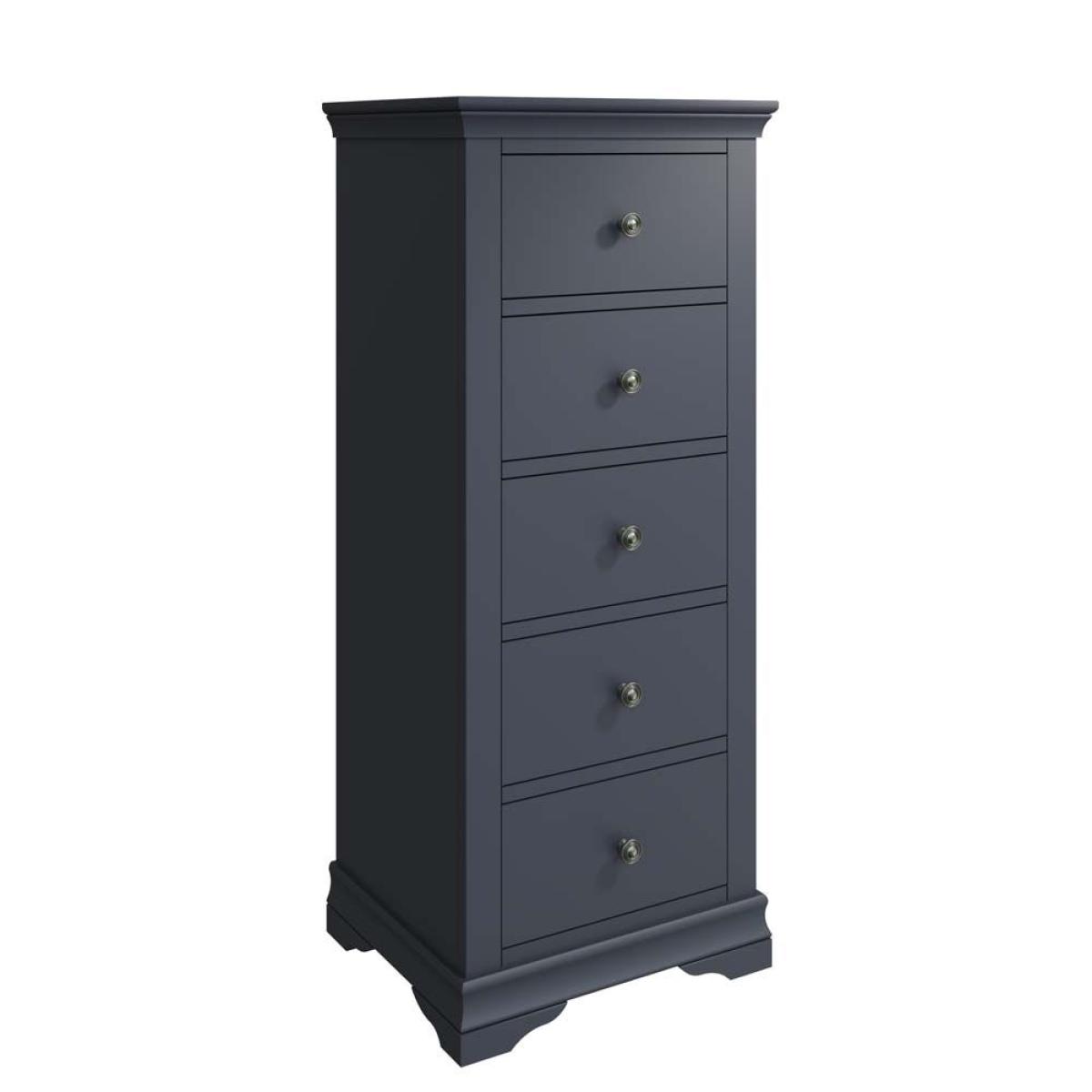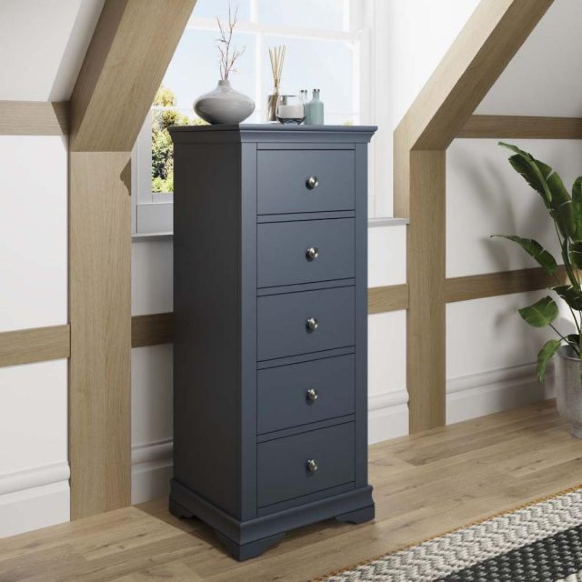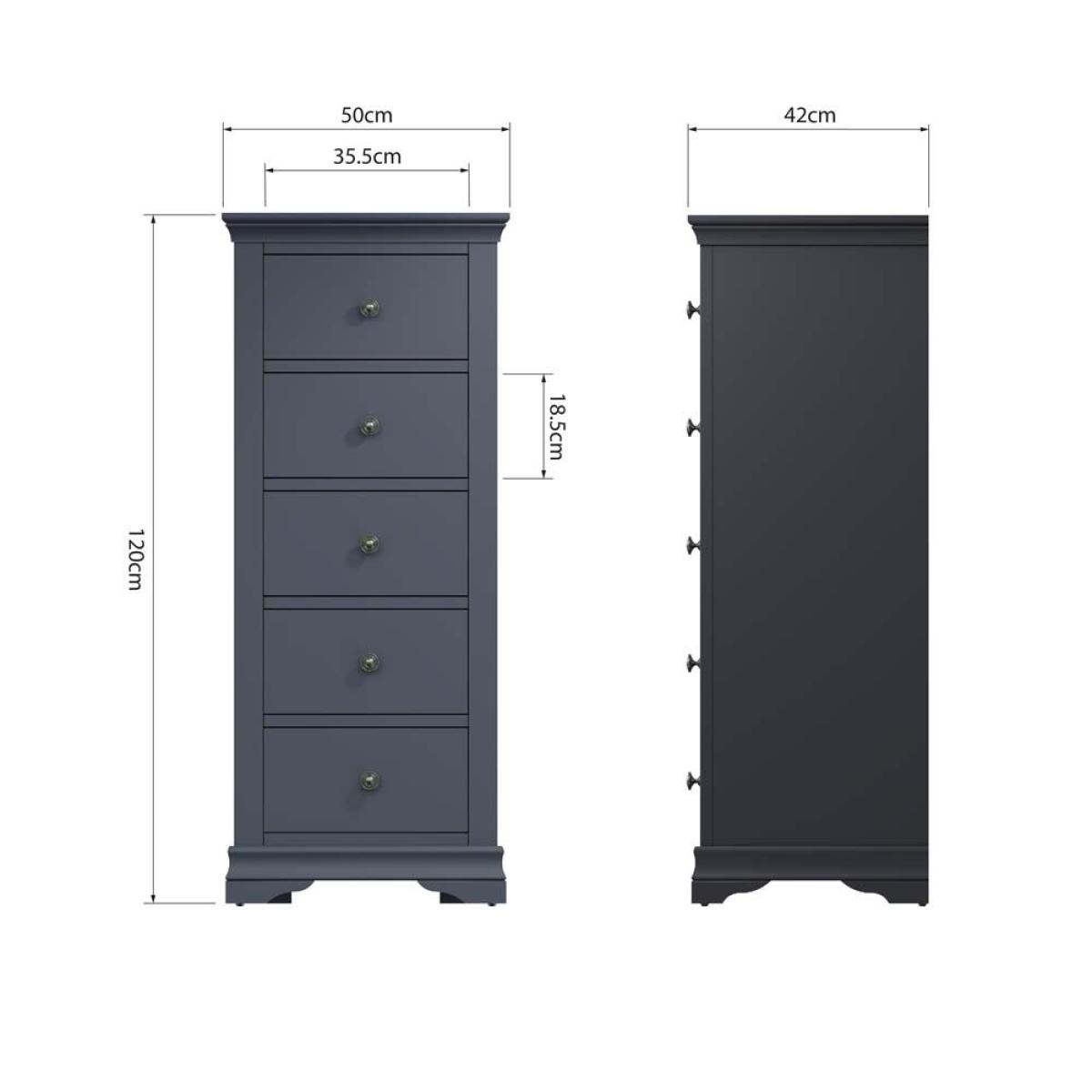 The Didcot 5 Drawer Narrow Chest or Wellington Chest features five drawers fronted by antiqued brass knobs and the signature wood design features around the top and base which the Didcot ranges are famous for. The smaller footprint of this chest is perfect for when space is a premium in the bedroom and storage is a must. The Didcot Collection in Midnight Blue is a sophisticated twist on the traditional style. Dimensions: W50cm x H120cm x D42cm5 drawers Antique effect brass knobs Deep blue paint finish. Simple self assembly