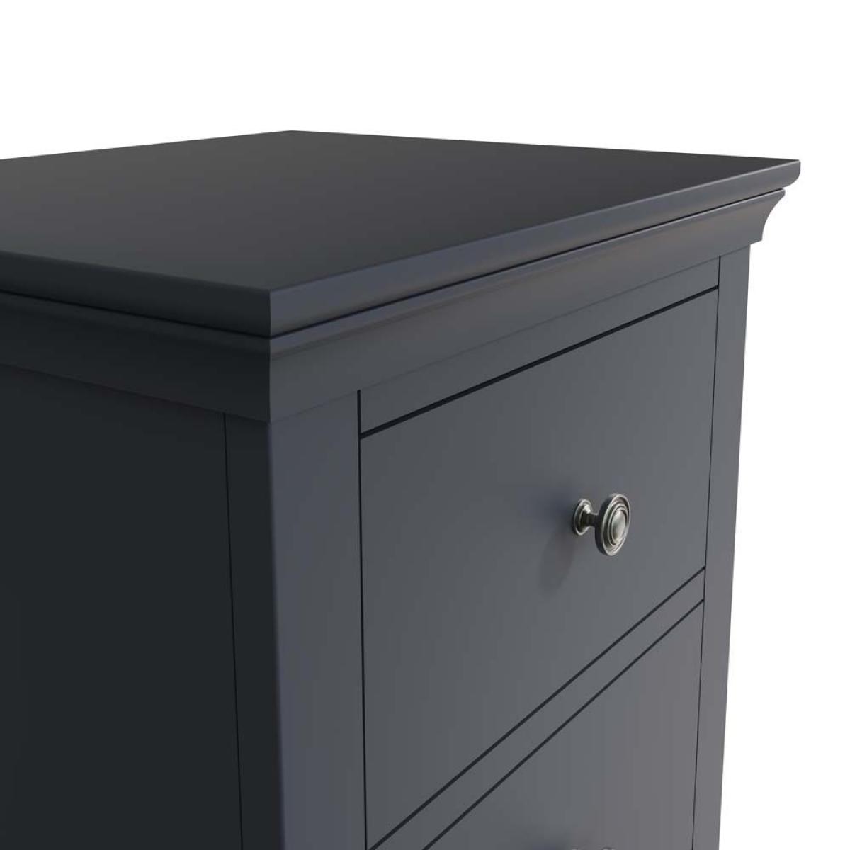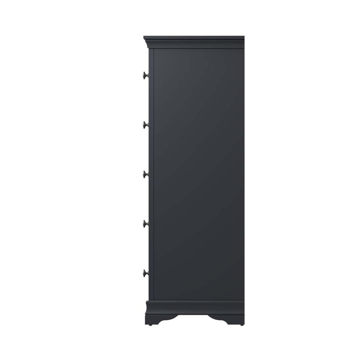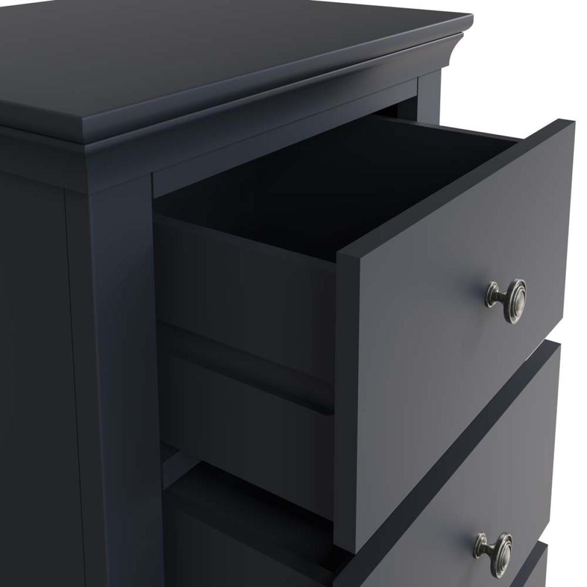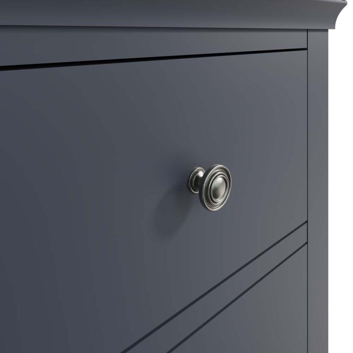 The Didcot 5 Drawer Narrow Chest or Wellington Chest features five drawers fronted by antiqued brass knobs and the signature wood design features around the top and base which the Didcot ranges are famous for. The smaller footprint of this chest is perfect for when space is a premium in the bedroom and storage is a must. The Didcot Collection in Midnight Blue is a sophisticated twist on the traditional style. Dimensions: W50cm x H120cm x D42cm5 drawers Antique effect brass knobs Deep blue paint finish. Simple self assembly