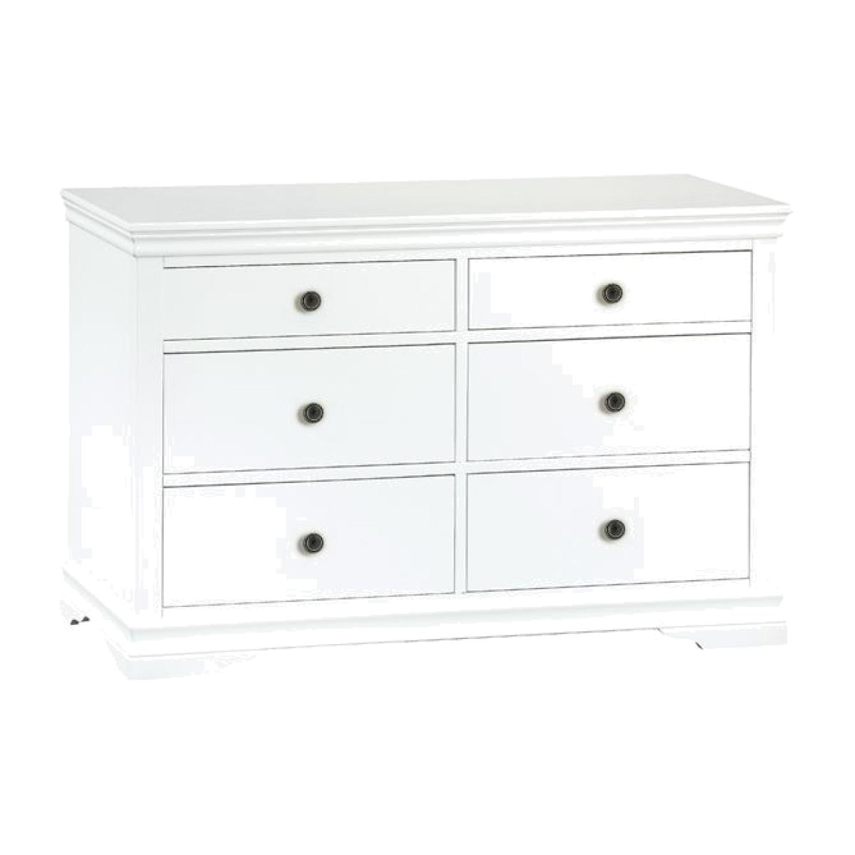 The Didcot 6 drawer chest of drawers is a timeless piece of bedroom furniture. This. White chest of drawers. Has 2 shallow drawers at the top and 4 deep drawers underneath. Beautifully painted in classic white and complemented with dark contrasting handles, it will look truly stylish in any bedroom. A stunning example of classic white bedroom furniture, the Didcot 6 drawer chest of drawers is the perfect storage solution for your bedroom, providing you with ample space to store away all of your clothes. Team this white chest of drawers with the rest of the Didcot white wood bedroom furniture collection to complete the look. Dimensions: 125cm x 42cm x 80cm.