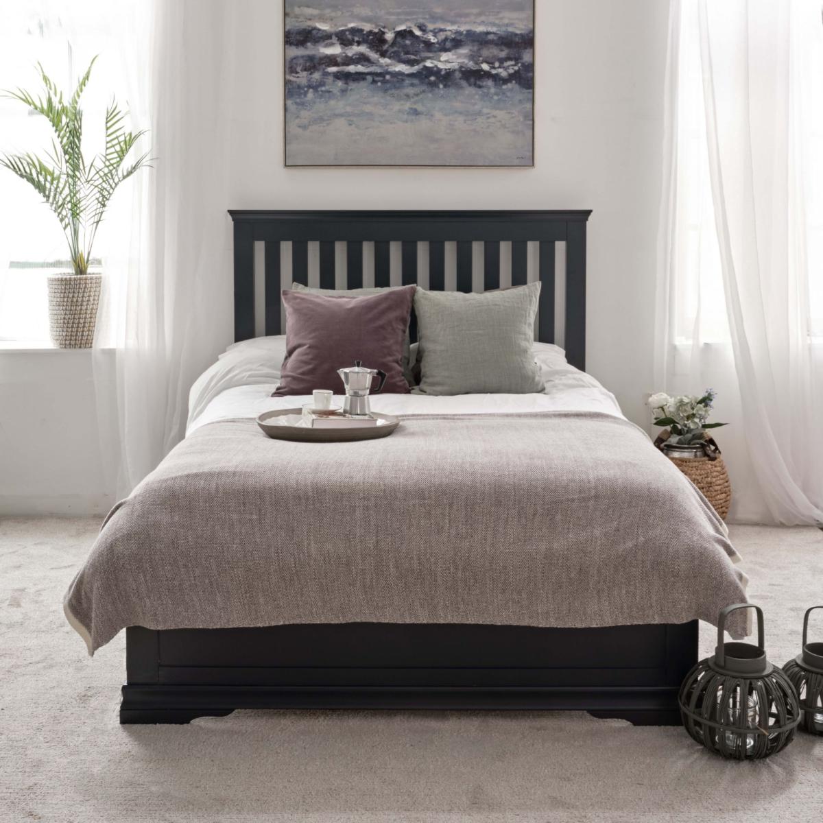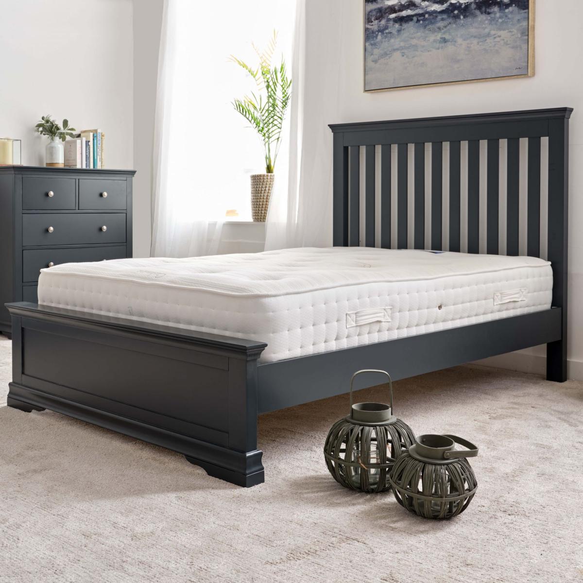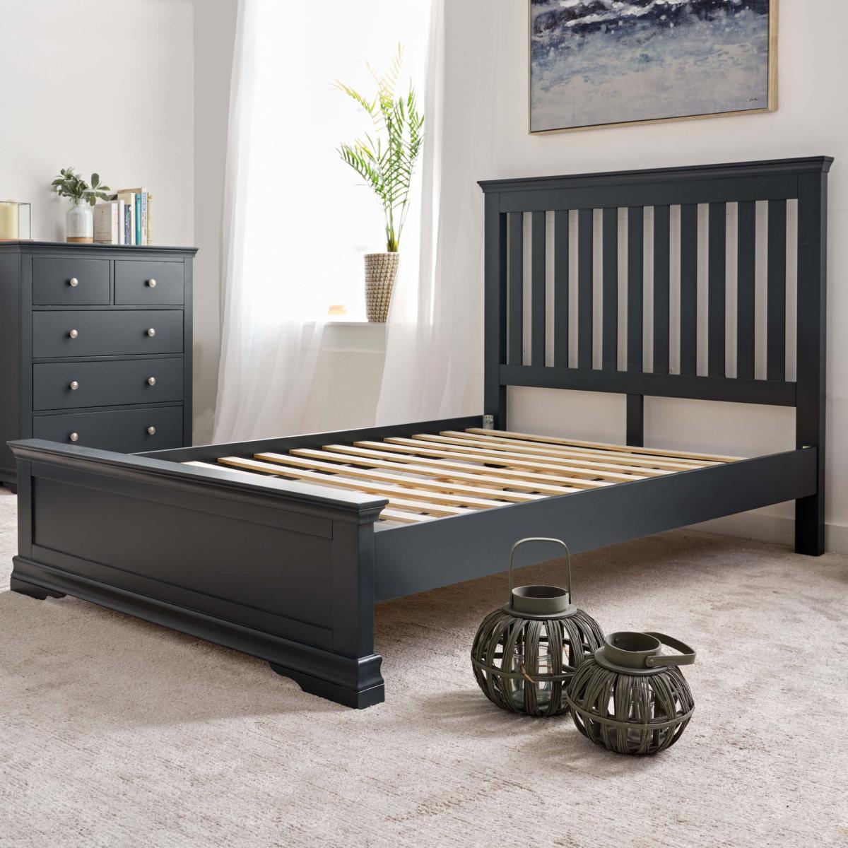 The Didcot Bedframe is a georgous indulgent design with a timeless simplicty that gives the bed a versatile design. The bed has a traditional slatted headboard with beaded top rail, and comes complete with a slatted base. The deep blue paintwork has a smooth finish and gives this otherwise traditional design a modern twist. Availble in both Double and King Size. Dimensions Double Outer: W149cm x H128cm x L207cm - To fit Mattress W135cm x L190cm. Dimensions King Outer: W164cm x H128cm x L220cm - To fit Mattress W150cm x L200cm. Slatted headboard style. Slatted base included. Simple self assembly