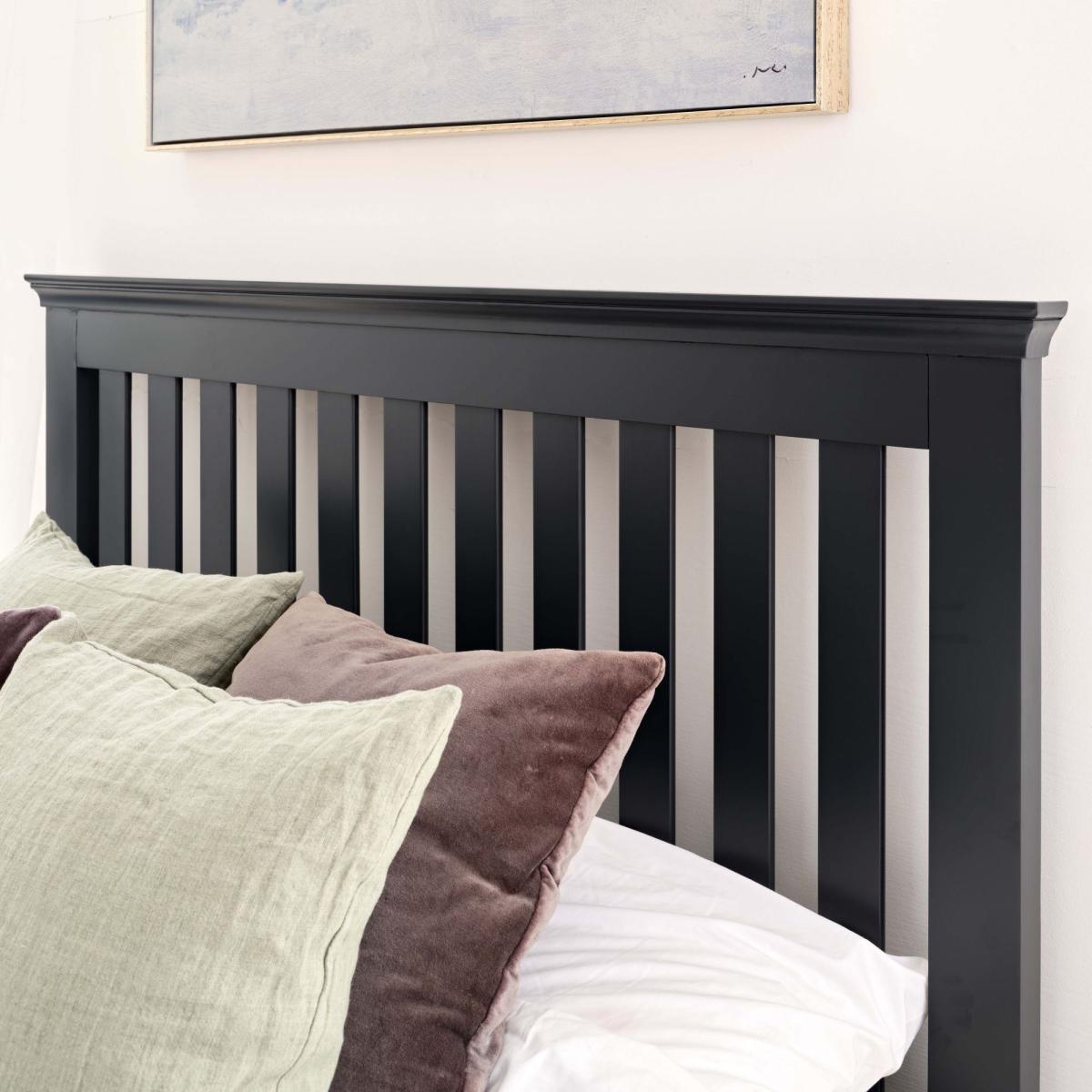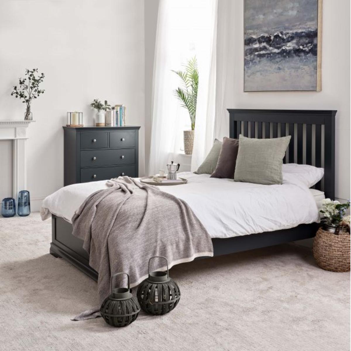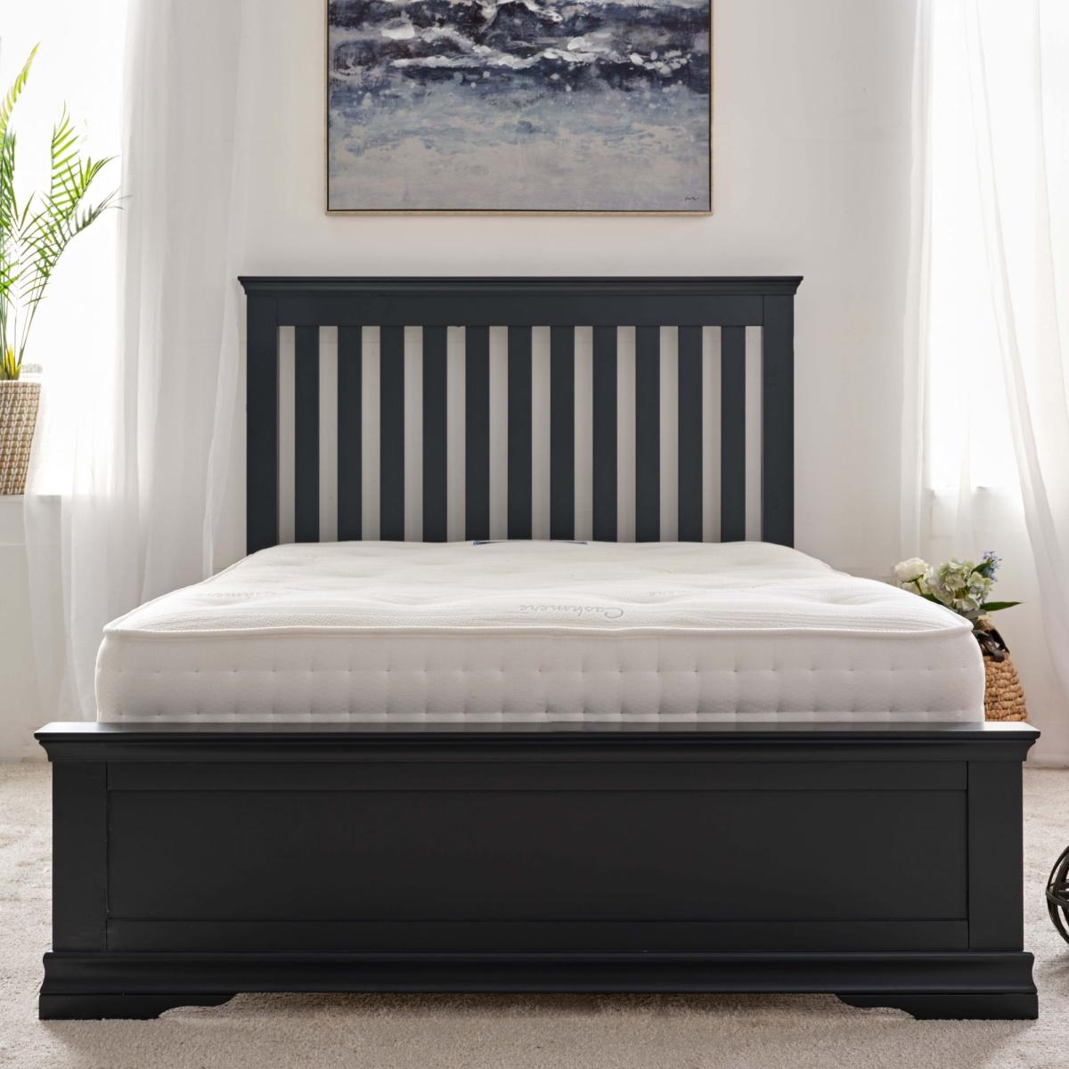 The Didcot Bedframe is a georgous indulgent design with a timeless simplicty that gives the bed a versatile design. The bed has a traditional slatted headboard with beaded top rail, and comes complete with a slatted base. The deep blue paintwork has a smooth finish and gives this otherwise traditional design a modern twist. Availble in both Double and King Size. Dimensions Double Outer: W149cm x H128cm x L207cm - To fit Mattress W135cm x L190cm. Dimensions King Outer: W164cm x H128cm x L220cm - To fit Mattress W150cm x L200cm. Slatted headboard style. Slatted base included. Simple self assembly