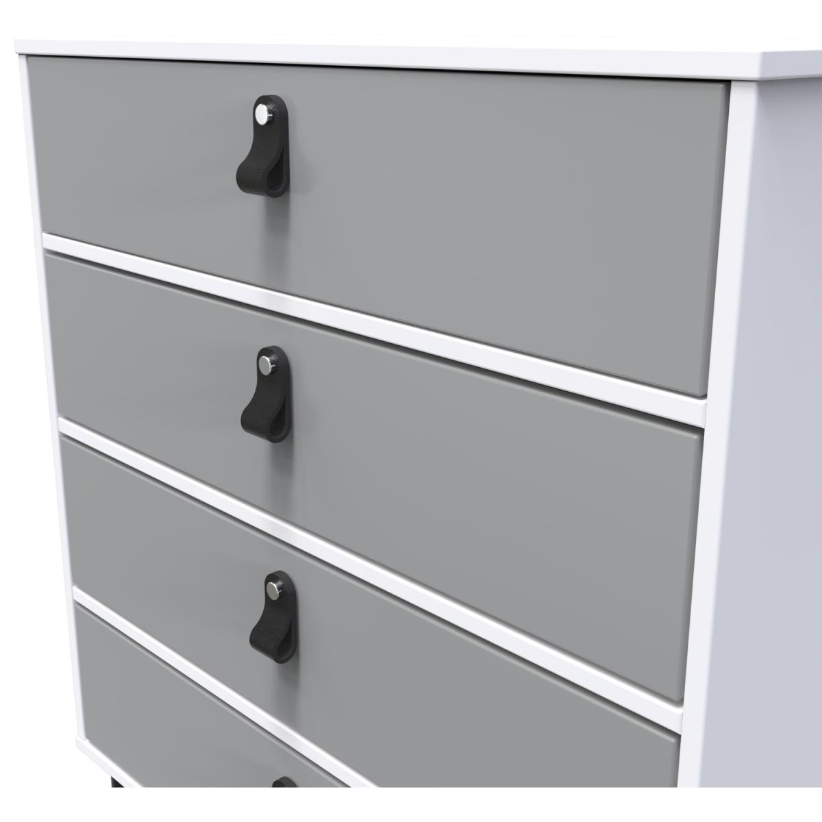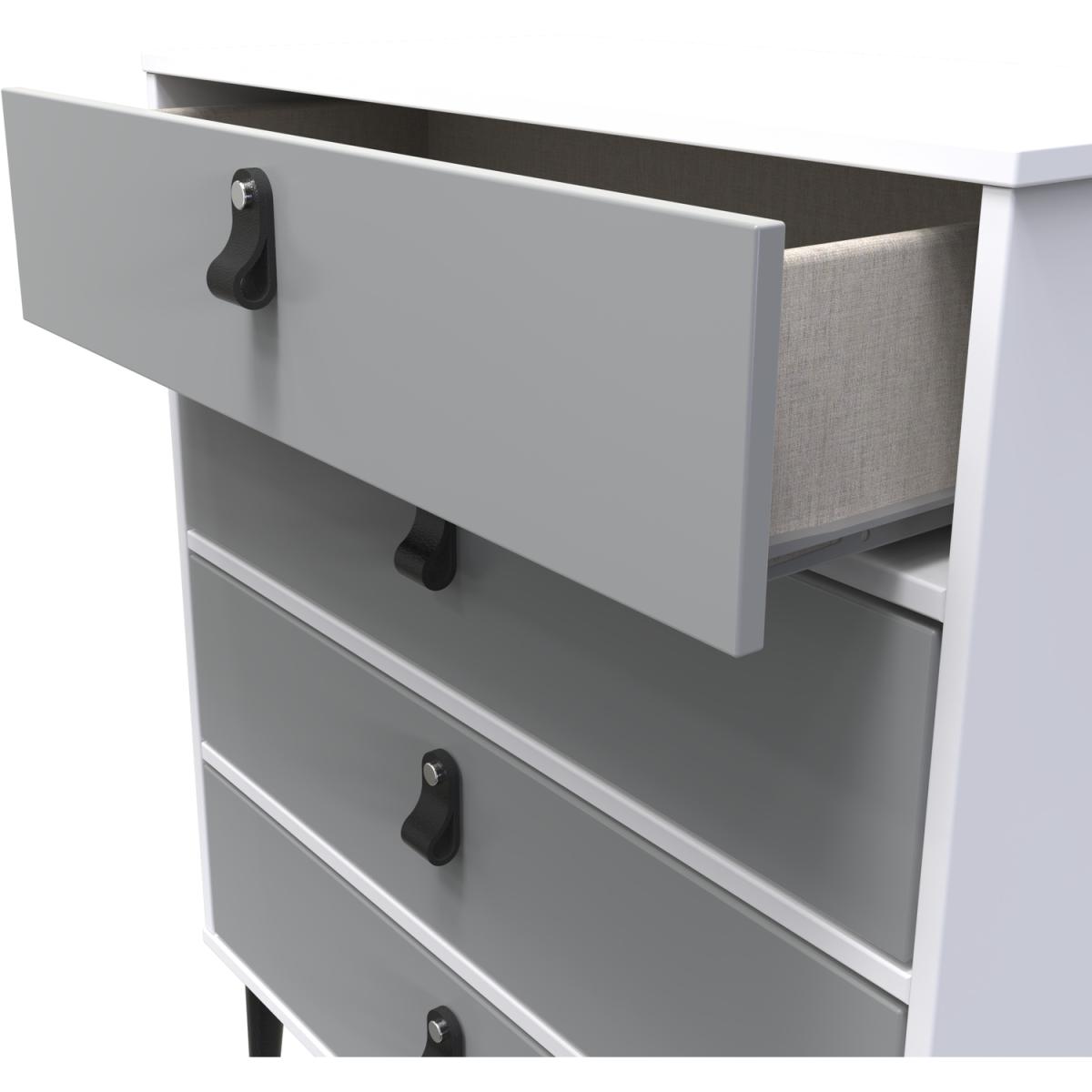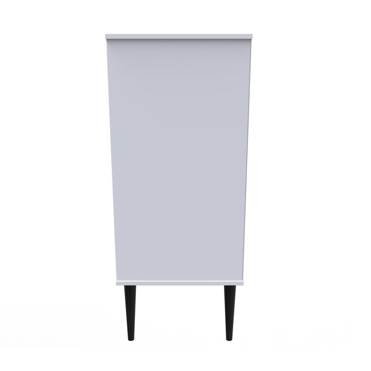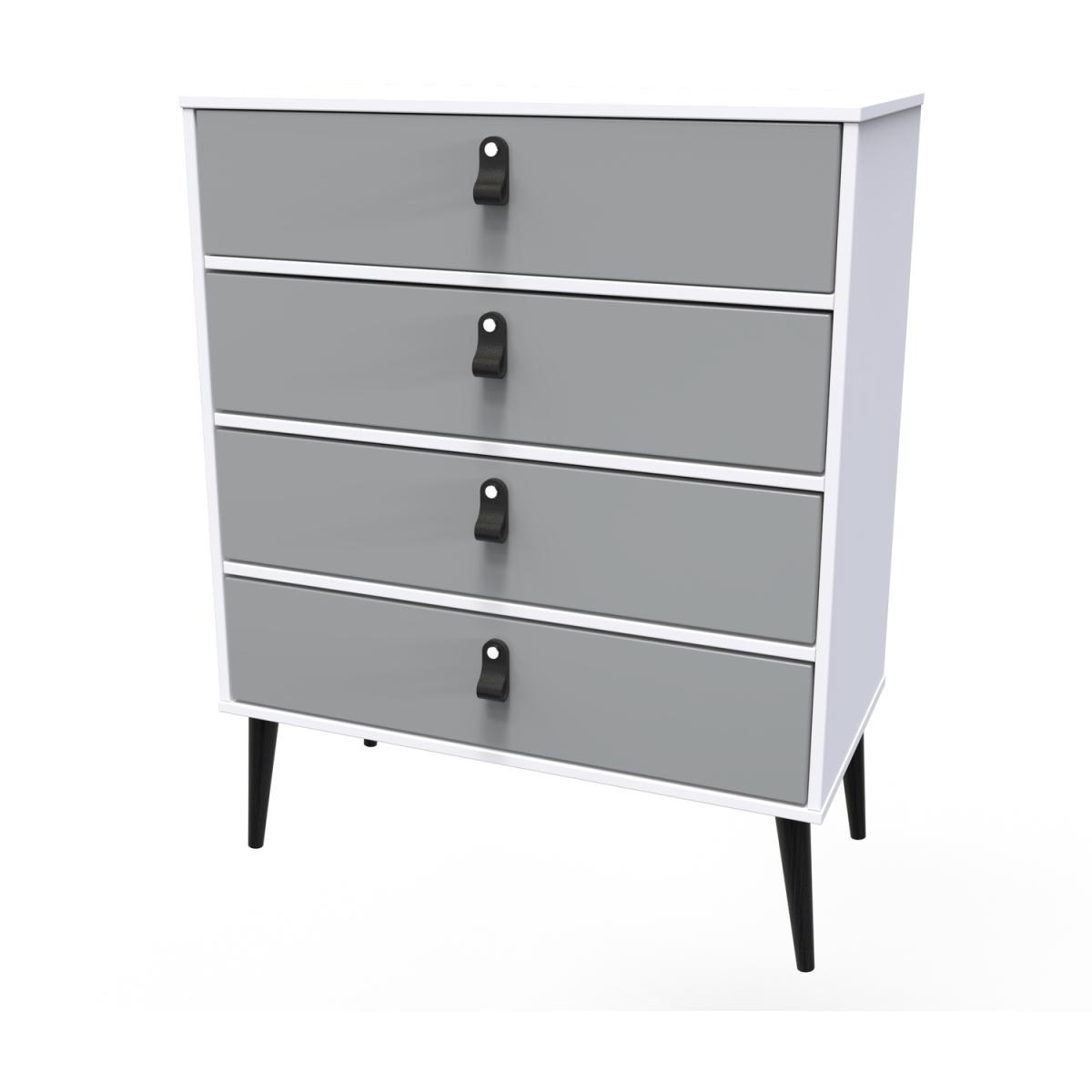 This modern storage cabinet features 4 large storage drawers. A truly unique style that will be the highlight of any bedroom. This furniture set is popular for its Scandinavian style and industrial feel. Constructed from sturdy materials with black leather handles and black wooden legs. Elevate your space with this range, featuring plenty of storage, so it incredibly practical for keeping rooms clutter free and tidy. All our furniture is made in the United Kingdom, to the highest quality. It is delivered direct to your location of choice by one of our two man delivery teams, and come full assembled (although legs may be removed to prevent damage in transit).