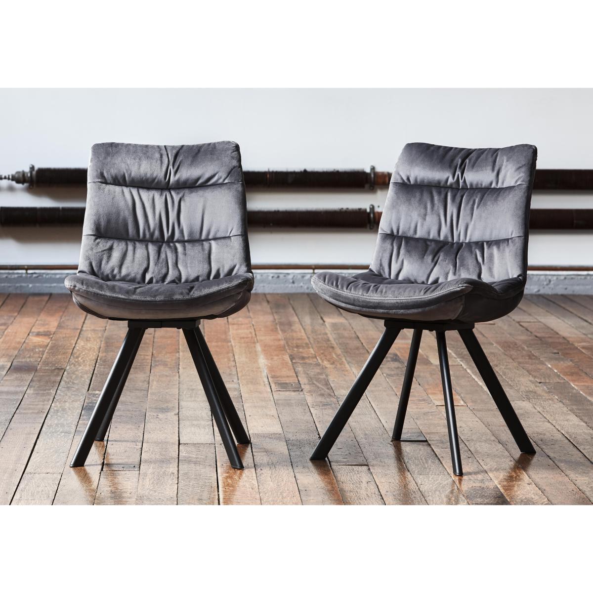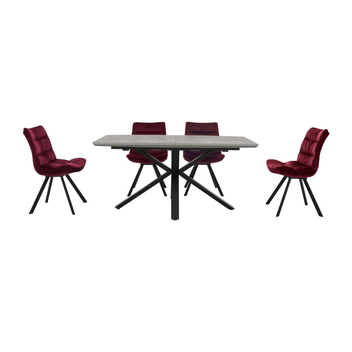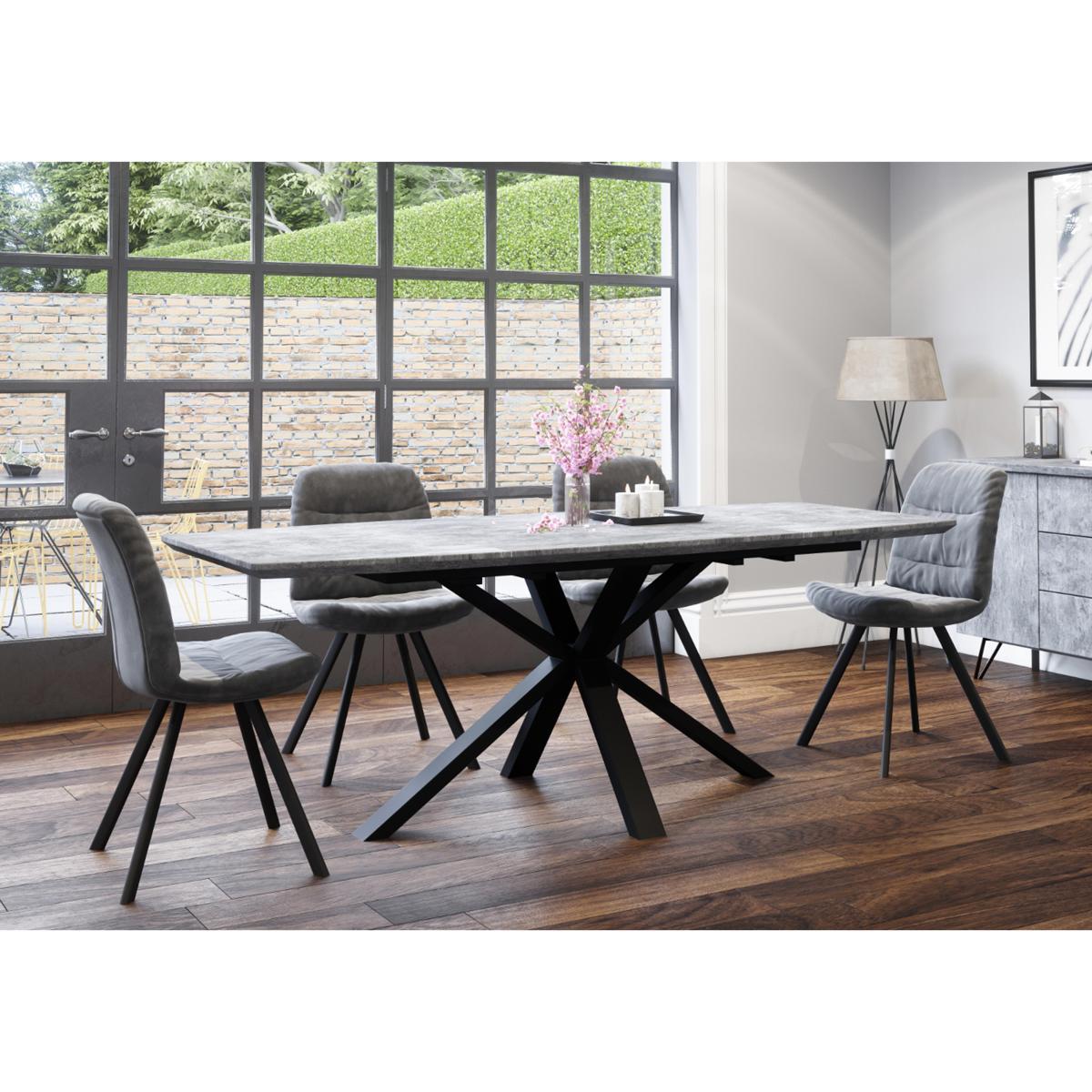 Bring stunning contemporary style to your home at an incredible value price with the Diego collection of dining room furniture and versatile occasional tables. Effortlessly channelling modern-industrial cool, Diego’s sturdily built and well finished pieces feature concrete-effect tops and black powder-coated metal bases. The collection includes round and rectangular dining tables and extending dining tables, and a bar table as well as storage furniture and occasional tables. Dining chairs and bar stools are fully upholstered in your choice of easy-care dark grey faux leather or sumptuously soft velvet. The Diego collection is only available online at Furniture Village. Contemporary space-saving dining style at a remarkable price. Concrete-effect dining table with 4 sumptuous velvet dining chairs. A Furniture Village online exclusive. Cool urban style at a remarkably affordable price – the Diego rectangle extending dining table and 4 dining chairs ticks all the boxes for practical and stylish compact dining. The sturdy and well-crafted industrial-look dining table in this dining set is absolutely stunning and features a boat-shaped top finished with an on-trend and very hard wearing concrete effect. Table top edges are slanted and have a contrasting matt grey finish. It’s set on a very striking black powder-coated metal starburst base. Seating six with ease, this table extends to seat eight – simply pull on the two table ends to reveal a hidden centre leaf that can be moved into place. The dining chairs in this set have black powder-coated metal angled legs. They’re deeply cushioned and beautifully upholstered in velvet with horizontal stitching that gives them a sumptuous padded appearance. Choose grey, teal, royal blue or red velvet upholstery for four chairs. The great-value Diego rectangle extending dining table and 4 dining chairs dining set is part of the extensive Diego collection at Furniture Village. Choose from a wide selection of dining sets or create your own. An online exclusive. Please note. The finish of each concrete-effect table top will display variations and unique markings. This should not be considered a fault. While hard wearing, this finish is not completely heat resistant. Be sure to use coasters and placemats at all times.