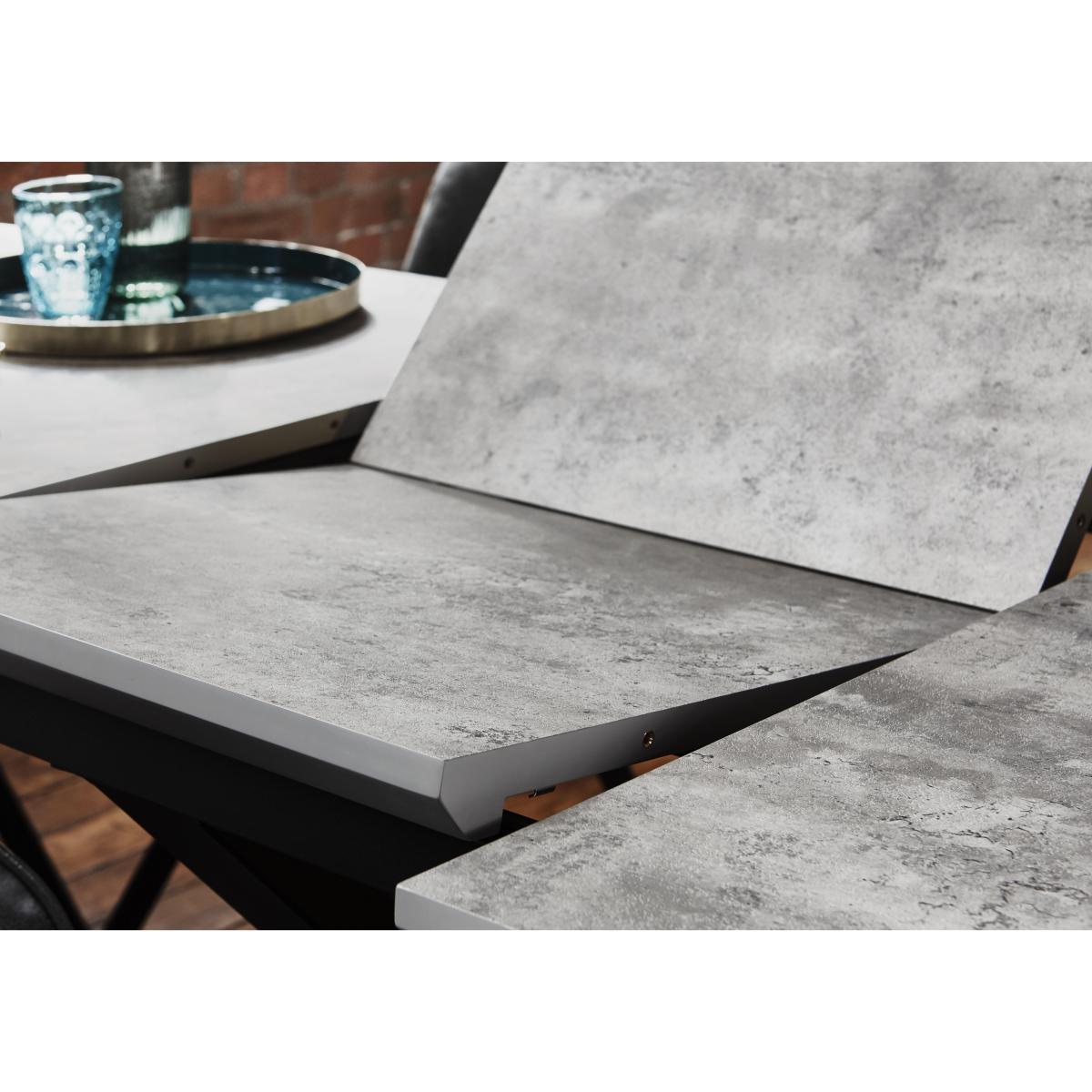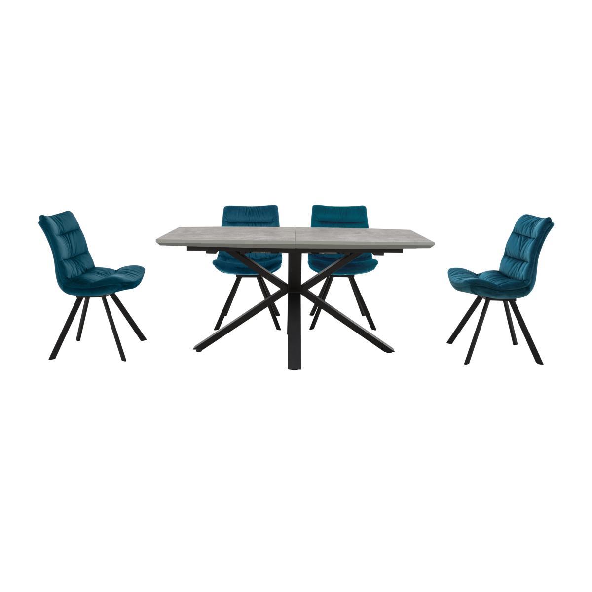 Bring stunning contemporary style to your home at an incredible value price with the Diego collection of dining room furniture and versatile occasional tables. Effortlessly channelling modern-industrial cool, Diego’s sturdily built and well finished pieces feature concrete-effect tops and black powder-coated metal bases. The collection includes round and rectangular dining tables and extending dining tables, and a bar table as well as storage furniture and occasional tables. Dining chairs and bar stools are fully upholstered in your choice of easy-care dark grey faux leather or sumptuously soft velvet. The Diego collection is only available online at Furniture Village. Contemporary space-saving dining style at a remarkable price. Concrete-effect dining table with 4 sumptuous velvet dining chairs. A Furniture Village online exclusive. Cool urban style at a remarkably affordable price – the Diego rectangle extending dining table and 4 dining chairs ticks all the boxes for practical and stylish compact dining. The sturdy and well-crafted industrial-look dining table in this dining set is absolutely stunning and features a boat-shaped top finished with an on-trend and very hard wearing concrete effect. Table top edges are slanted and have a contrasting matt grey finish. It’s set on a very striking black powder-coated metal starburst base. Seating six with ease, this table extends to seat eight – simply pull on the two table ends to reveal a hidden centre leaf that can be moved into place. The dining chairs in this set have black powder-coated metal angled legs. They’re deeply cushioned and beautifully upholstered in velvet with horizontal stitching that gives them a sumptuous padded appearance. Choose grey, teal, royal blue or red velvet upholstery for four chairs. The great-value Diego rectangle extending dining table and 4 dining chairs dining set is part of the extensive Diego collection at Furniture Village. Choose from a wide selection of dining sets or create your own. An online exclusive. Please note. The finish of each concrete-effect table top will display variations and unique markings. This should not be considered a fault. While hard wearing, this finish is not completely heat resistant. Be sure to use coasters and placemats at all times.