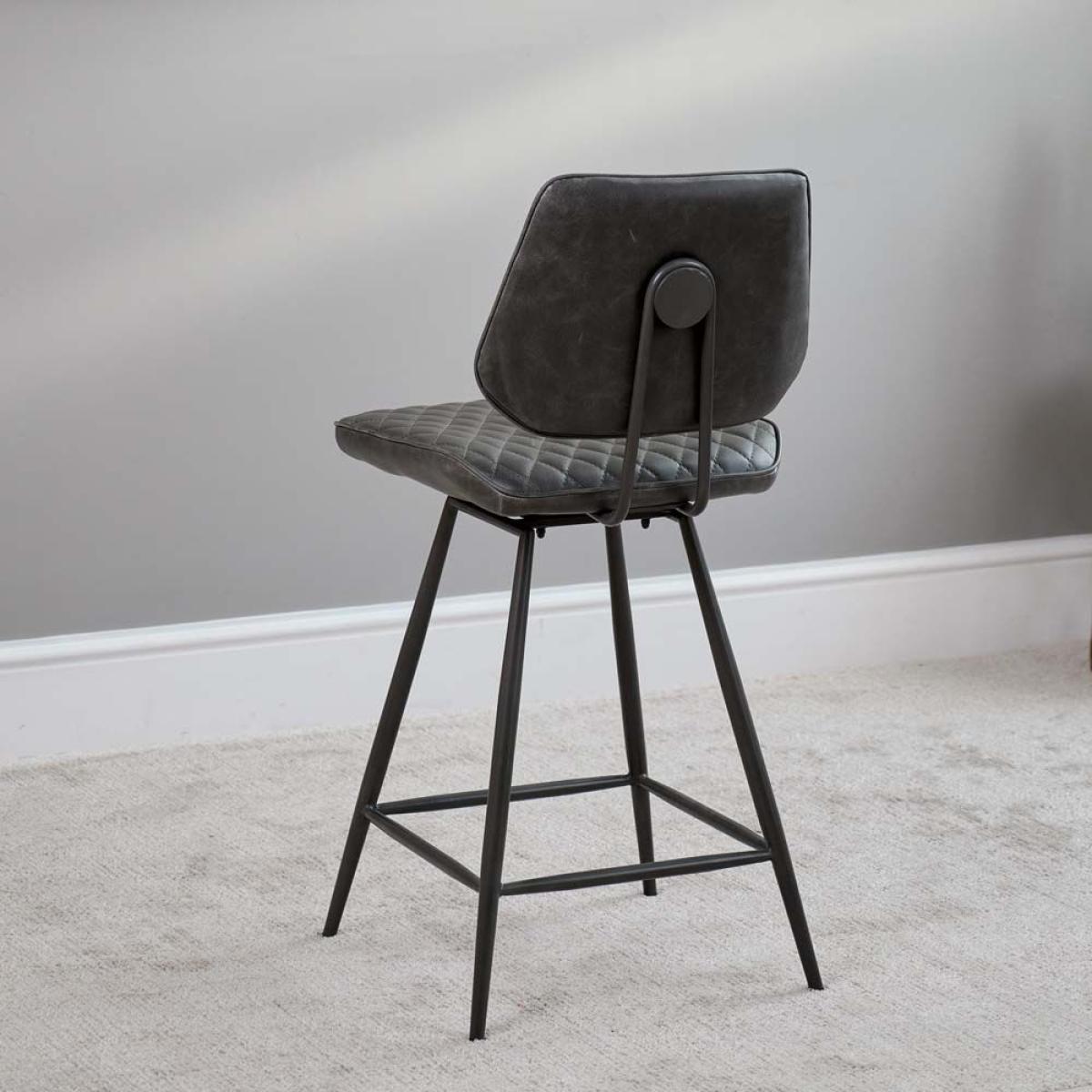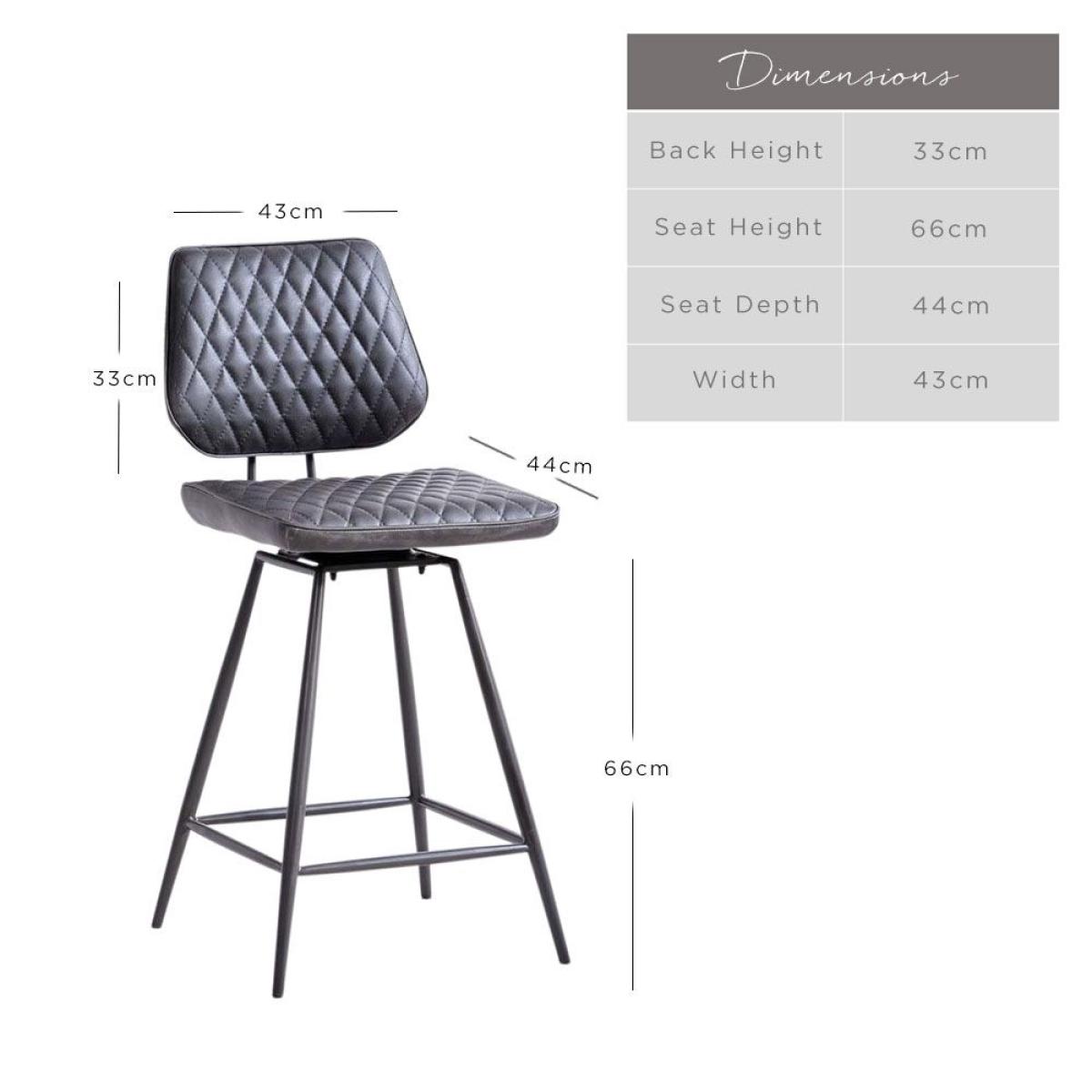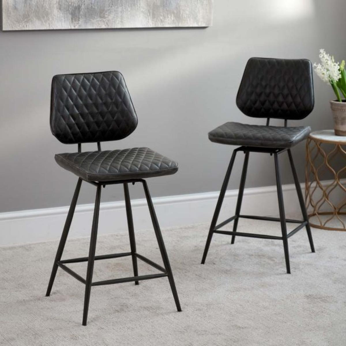 Simple and smart, the Digby bar stool brings an element of class and sophistication to your home with its understated retro design. Upholstered in a deep grey faux leather with dark grey metal framework and legs. The stool also includes a twist function allowing you to rotate with ease. Also available in Dark Blue, Tan and Dark Brown. Dimensions: W40cm x D53cm x H97.5cm Simple self assembly. Sold as a pair