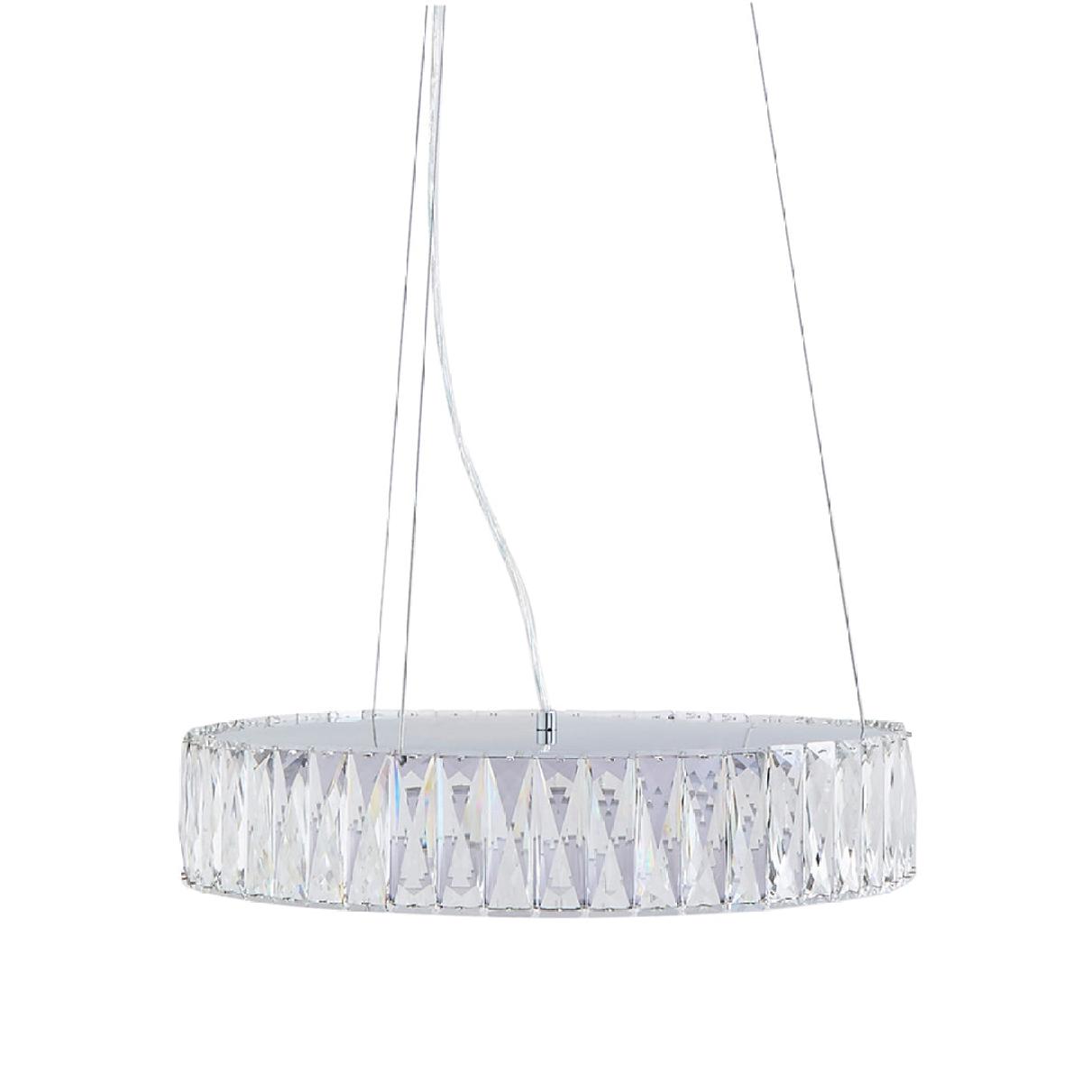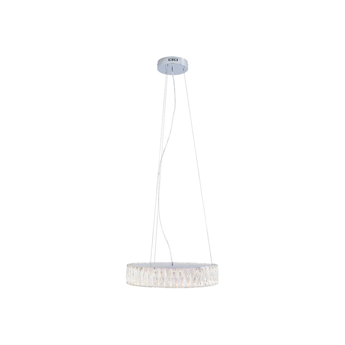 The Dilan Chrome LED Suspension Pendant is an exquisite centrepiece exclusive to Pagazzi Design. With no assembly required, this stunning fixture is simple to unpack and hang, suspended elegantly from fine silver wires attached to a sleek chrome ceiling plate. The pendant features a vertical ring of clear glass prism jewels that beautifully refract light, creating a dazzling effect. Inside, the integrated LED light source emits a radiant glow at 3000. K and 1681 lumens, while a frosted bottom diffuser softens the illumination for a warm, ambient finish. Combining glamour and practicality, this clear and chrome design offers brilliant light performance with modern sophistication. Complete with baton fixing for easy installation, the Dilan pendant makes a luxurious statement in any interior setting.