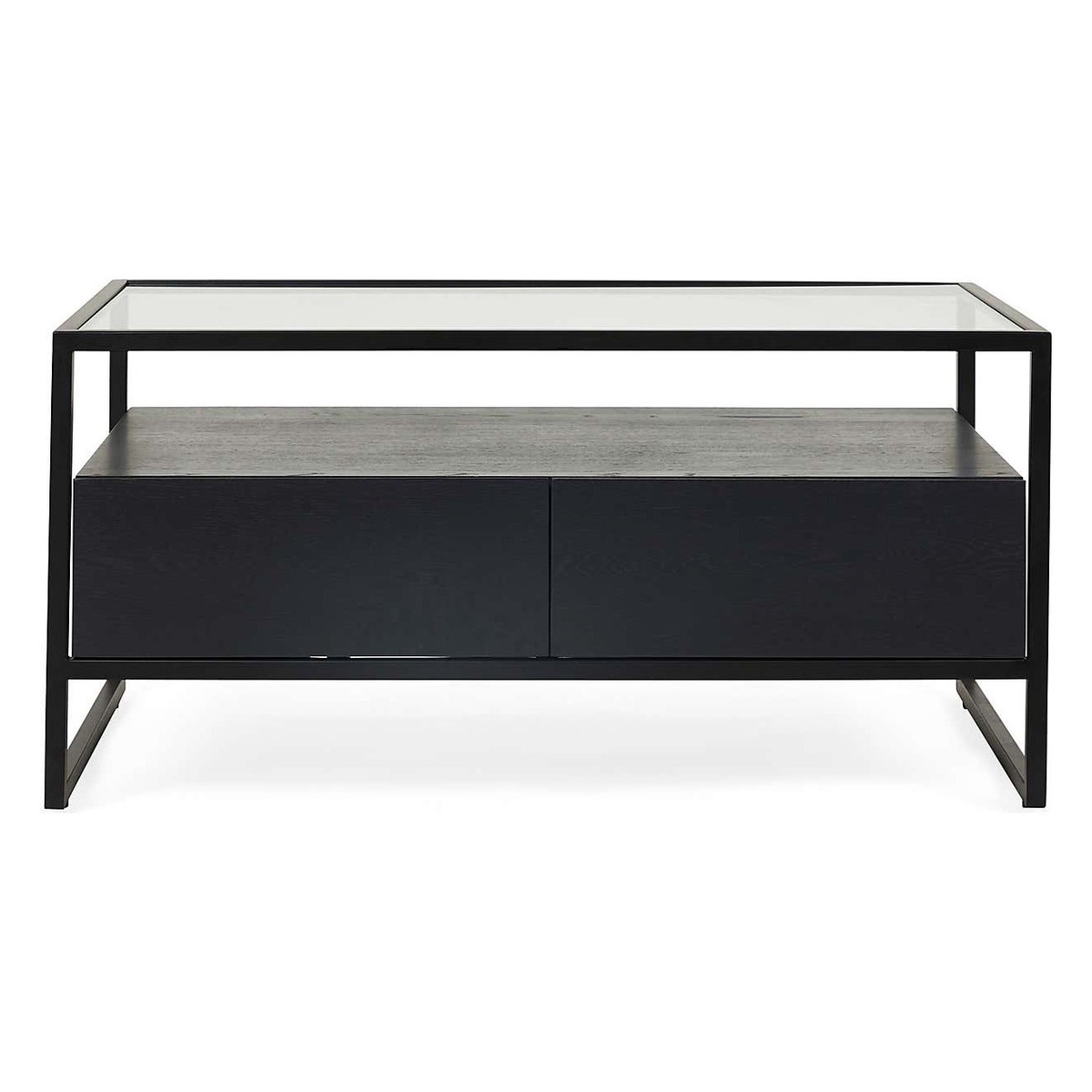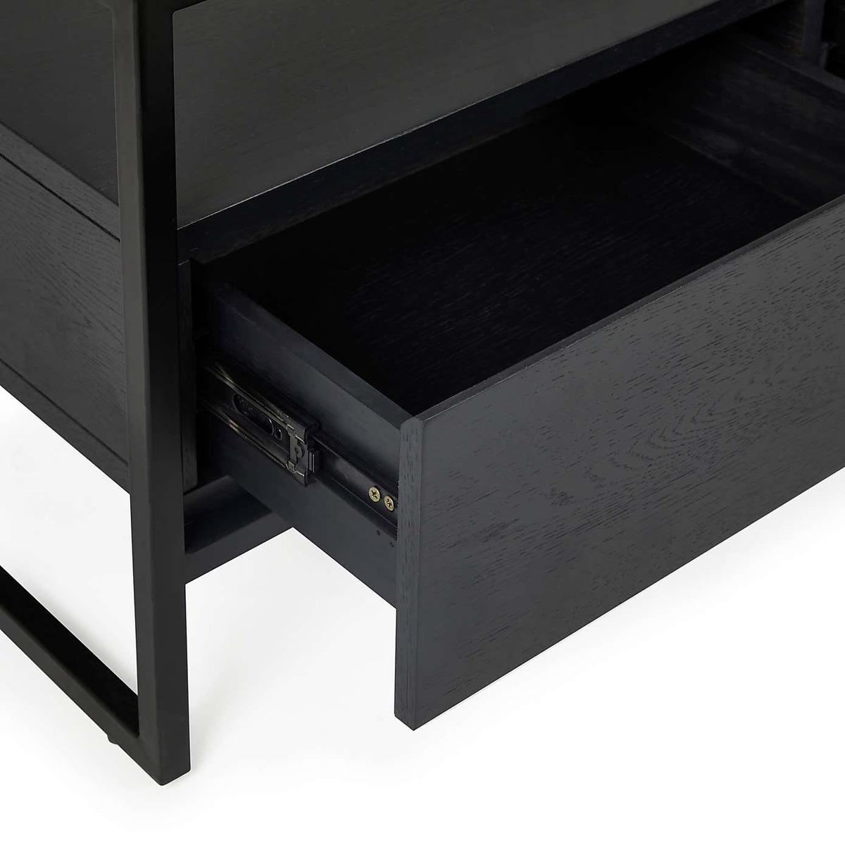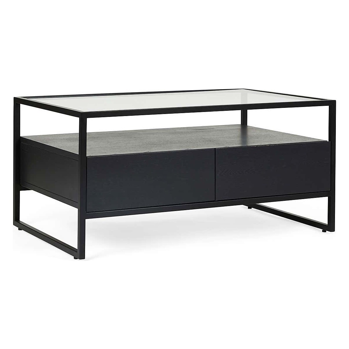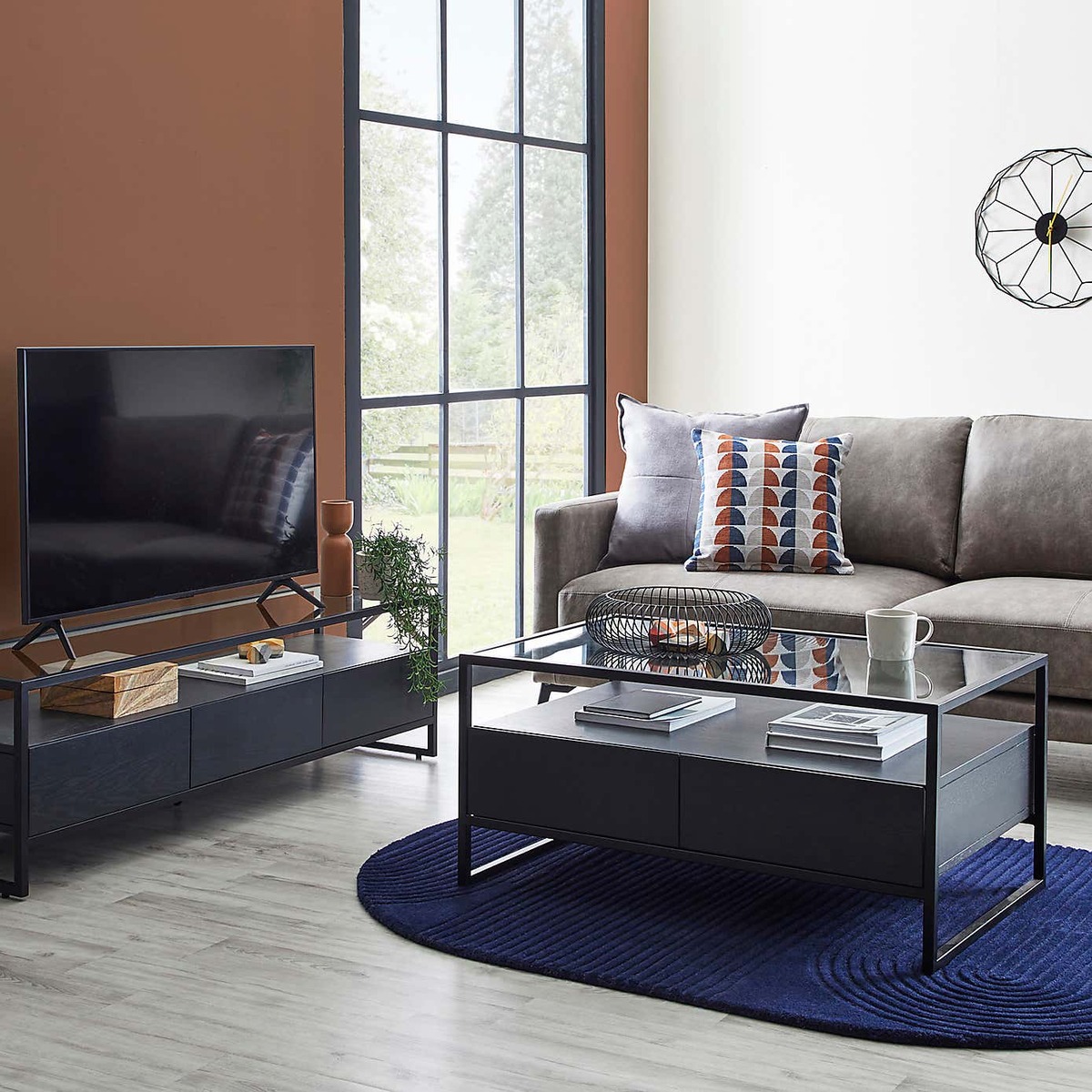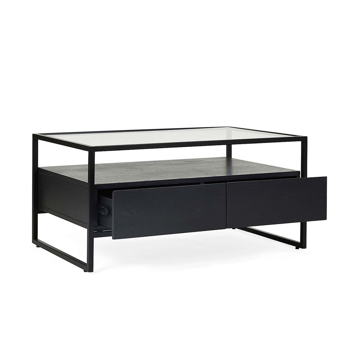 Dunelm Exclusive - Designed and Developed by Dunelm Characterised by the modern black finish and powder coated black metal legs, the Dillon collection brings a contemporary finish to an industrial-chic design. Complete with tempered glass tops and sleek handleless doors and drawers, this contemporary range would make a stunning addition to any modern home. Offering the perfect centrepiece for any modern living room, the Dillon coffee table is supplied fully assembled and features two spacious drawers with metal runners and a large open shelf. Care Instructions: Avoid common hazards such as harsh solvents or abrasives as this can damage the furniture and mop up any spills with a dry cloth. Avoid exposure to direct sunlight or extreme conditions. Don't put your furniture near heating sources or in highly air-conditioned spaces.