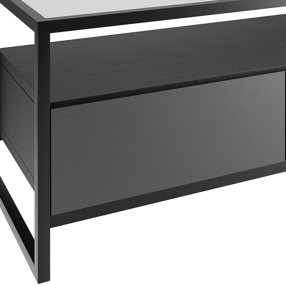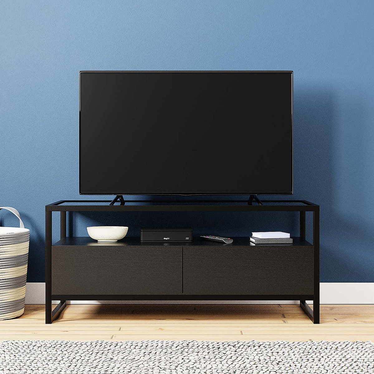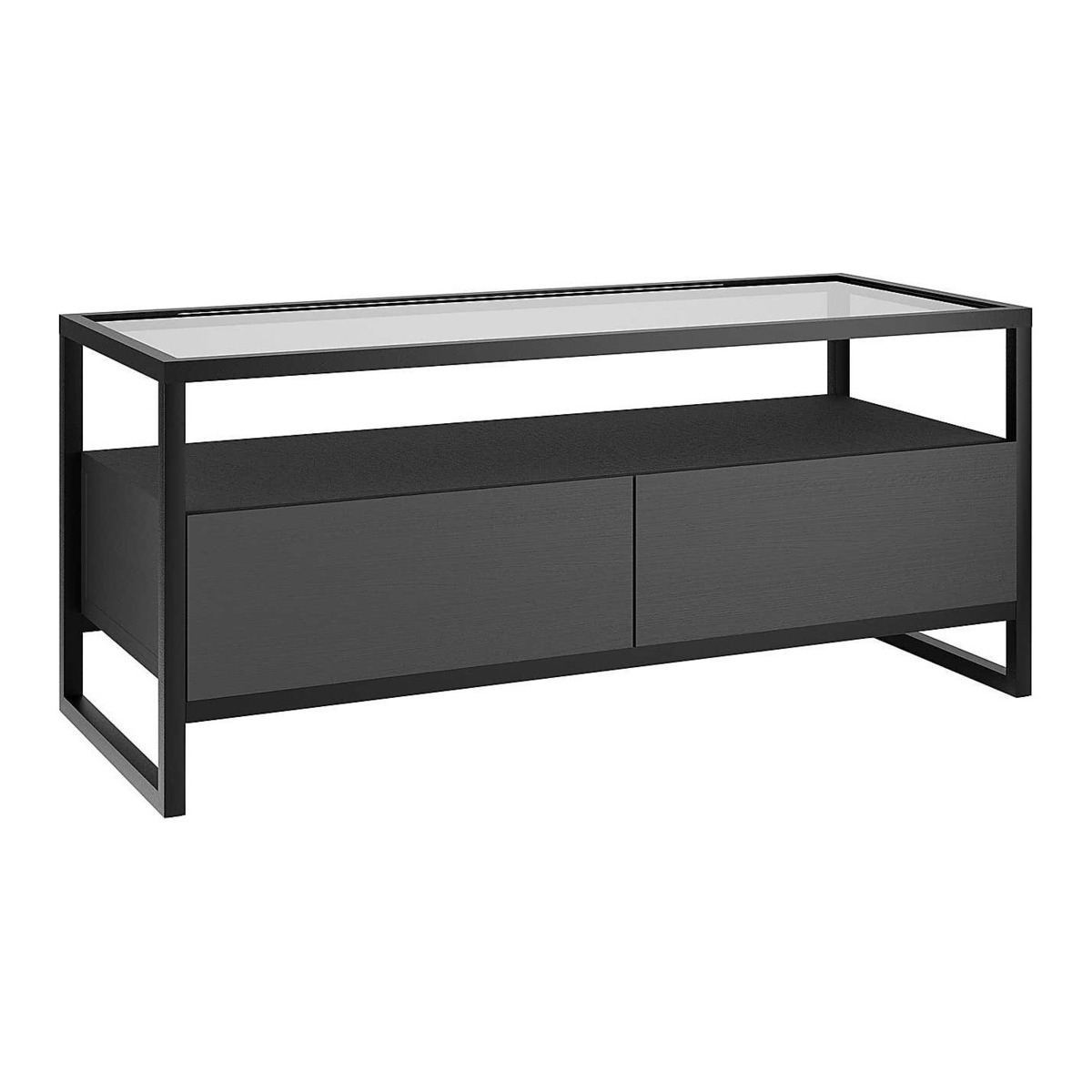Dunelm Exclusive - Designed and Developed by Dunelm Characterised by the modern black finish and powder coated black metal legs, the Dillon collection brings a contemporary finish to an industrial-chic design. Complete with tempered glass tops and sleek handleless doors and drawers, this contemporary range would make a stunning addition to any modern home. this fully assembled TV stand is designed with cable access in the back panel and comes complete with two generously sized drawers with metal runners and a large open shelf. Care Instructions: Avoid common hazards such as harsh solvents or abrasives as this can damage the furniture and mop up any spills with a dry cloth. Avoid exposure to direct sunlight or extreme conditions. Don't put your furniture near heating sources or in highly air-conditioned spaces.