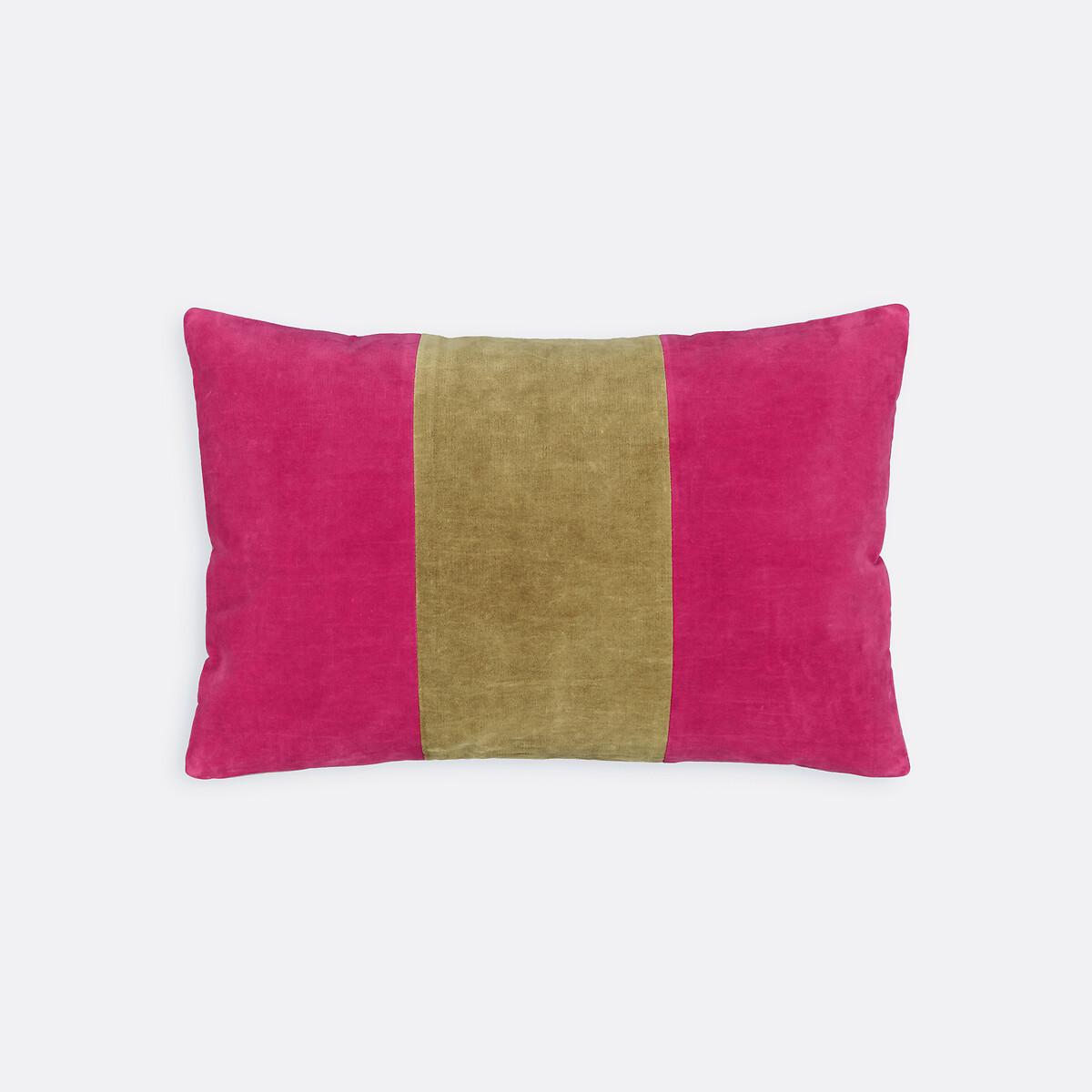 I really like this cushions' versatility; the rich velvet texture adds a touch of luxury without feeling too formal, making it suitable for both modern and traditional interiors. Its bold pink centre paired with neutral olive sides makes it a great accent piece that can bring colour and depth to a sofa or bed. For styling tips, I’d recommend mixing it with other textured cushions or layering it on a plain neutral base to let the colour pop. It works particularly well in spaces with a contemporary or eclectic vibe, but can also elevate classic interiors with a dash of personality. Keep in mind its size when pairing with other cushions to avoid overcrowding - it’s best as a statement piece or in a small cluster for added visual interest.