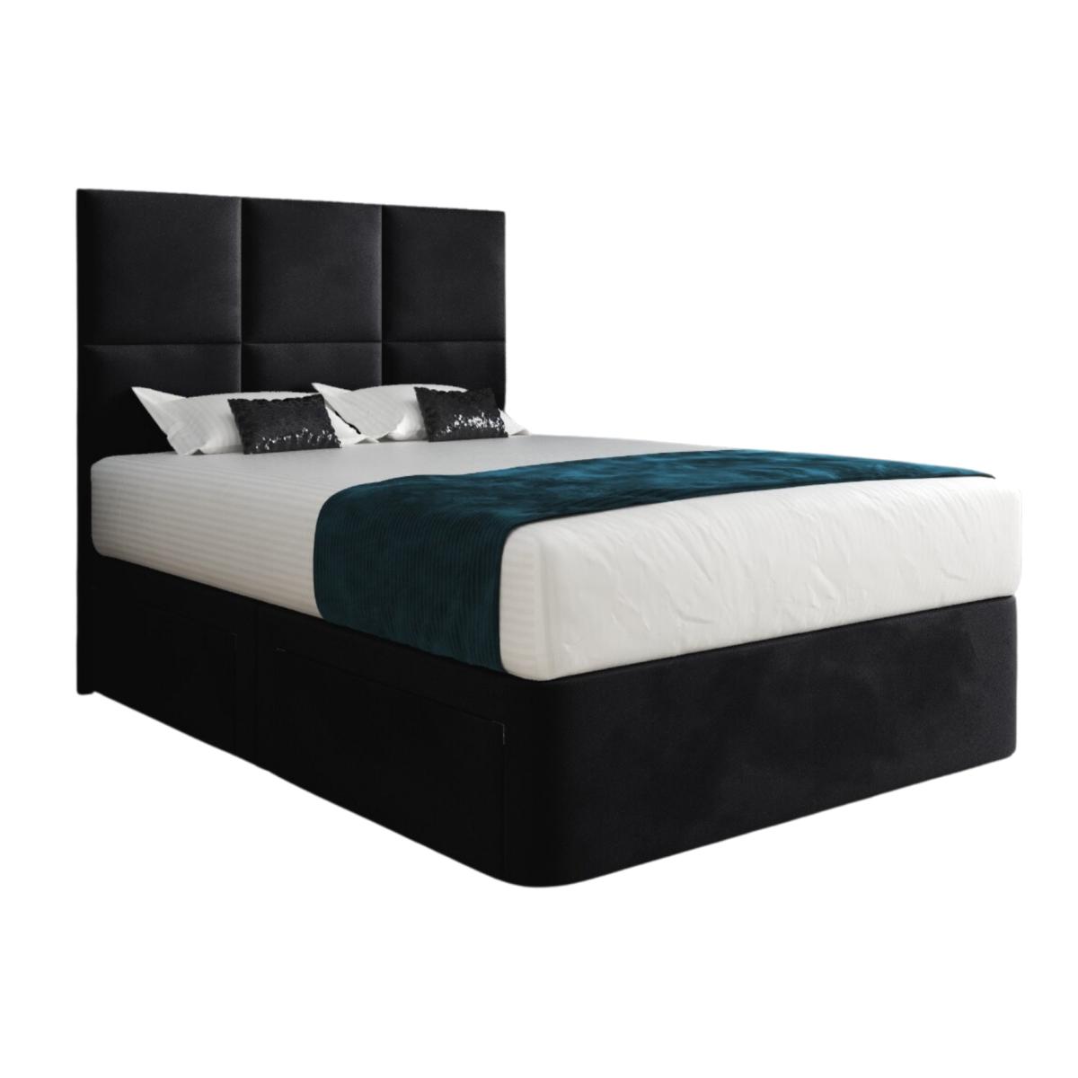 Cube design floor-standing headboard with a classic divan base. The divan base comes equipped with chrome gliders, and optional drawer configurations can be chosen for an added storage solution. The floor-standing headboard is solid and easy to affix to the base. Aesthetically clean and sleek with a contemporary cube panel design. Please Note- This item requires self-assembly with easy-to-follow instructions provided. The actual colour of the product may vary slightly as your screen display settings and lighting in your home environment may differ from our own.