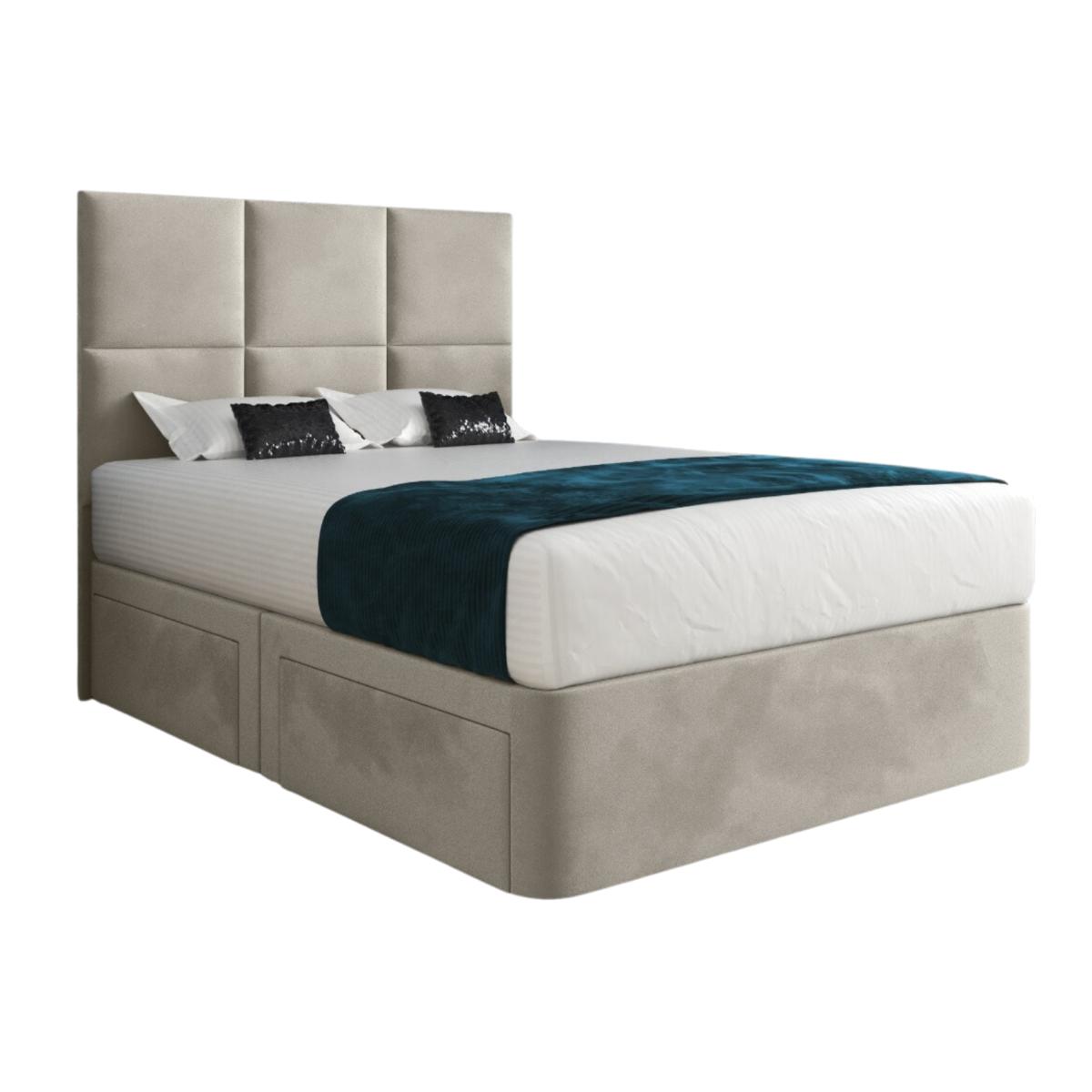 Cube design floor-standing headboard with a classic divan base. The divan base comes equipped with chrome gliders, and optional drawer configurations can be chosen for an added storage solution. The floor-standing headboard is solid and easy to affix to the base. Aesthetically clean and sleek with a contemporary cube panel design. Please Note- This item requires self-assembly with easy-to-follow instructions provided. The actual colour of the product may vary slightly as your screen display settings and lighting in your home environment may differ from our own.