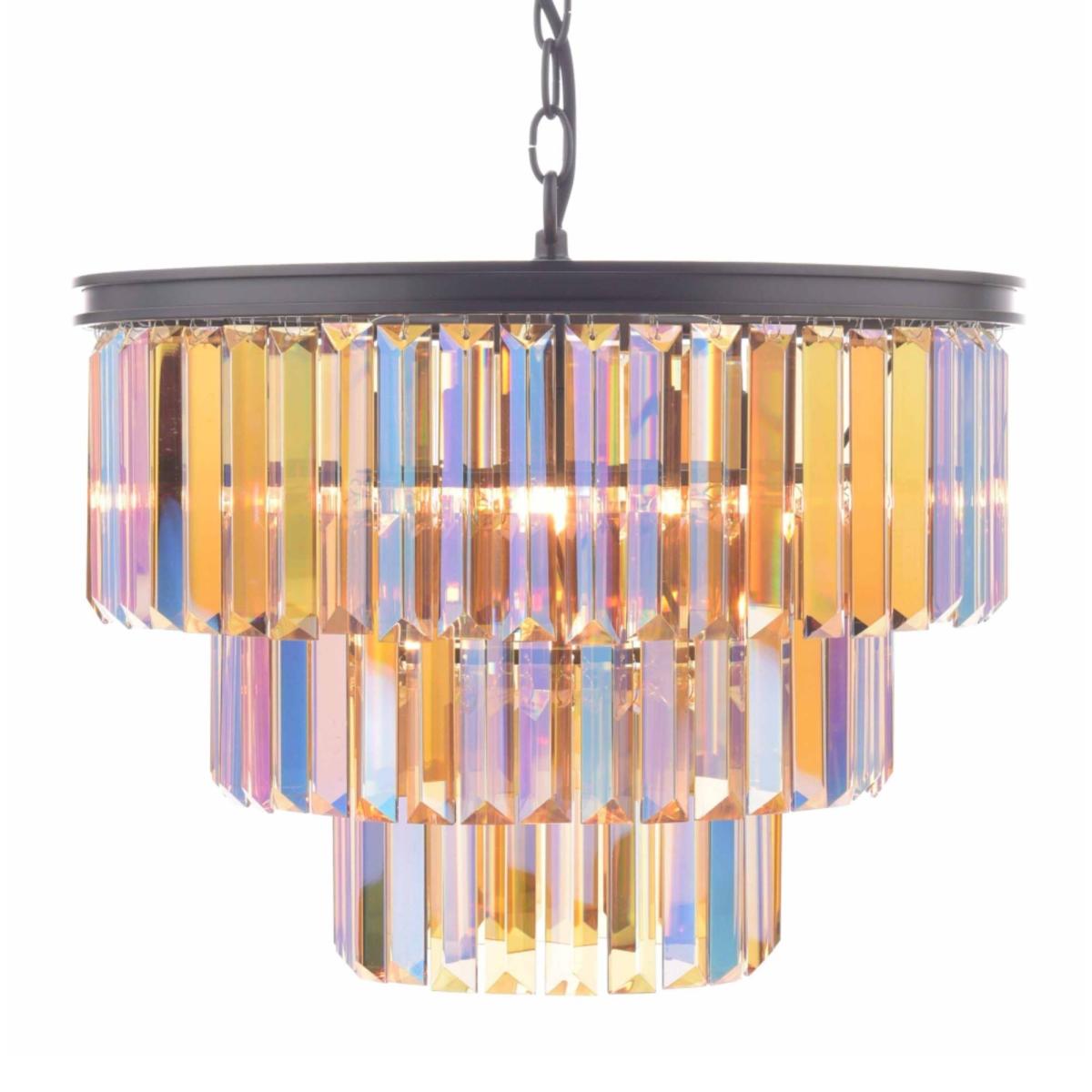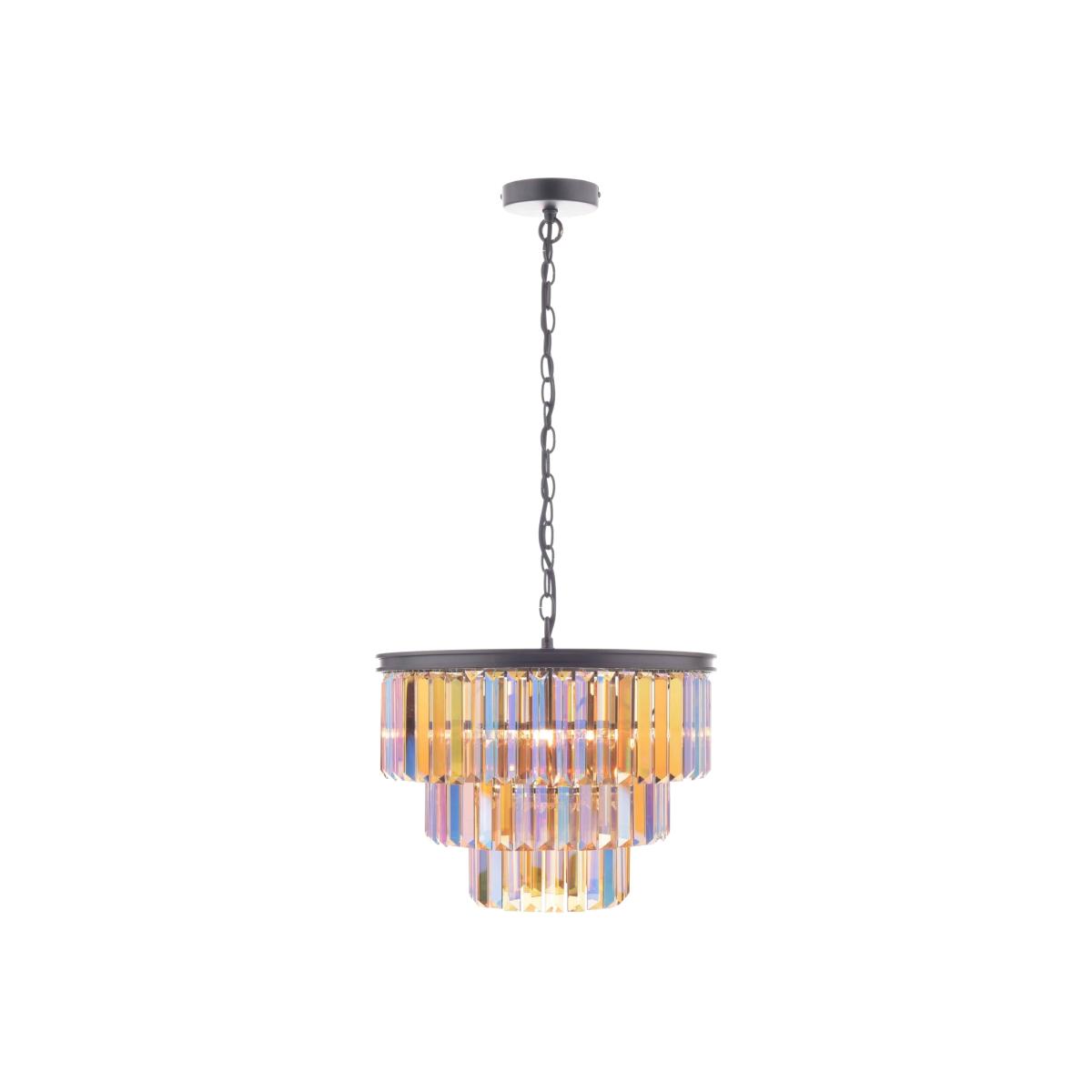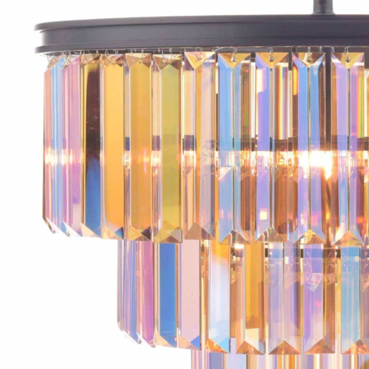 Stunning chandelier ceiling light boasting tiered iridescent glass prisms. A beautiful addition to your home, the Dimitri Chandelier Ceiling Light is a contemporary and elegant ceiling light, exclusive to Pagazzi. A bold black frame suspends 3 tiers of vibrant, iridescent glass prisms, which when lit creates a mesmerising shine of multi-colour. A statement feature light perfect for adding colour and style into any room, this light is perfect for a grand entranceway or staircase or as a showpiece above a dining table or kitchen island. We recommend using our 3w LED G9 Capsule bulbs which are a great replacement for standard halogen bulbs.