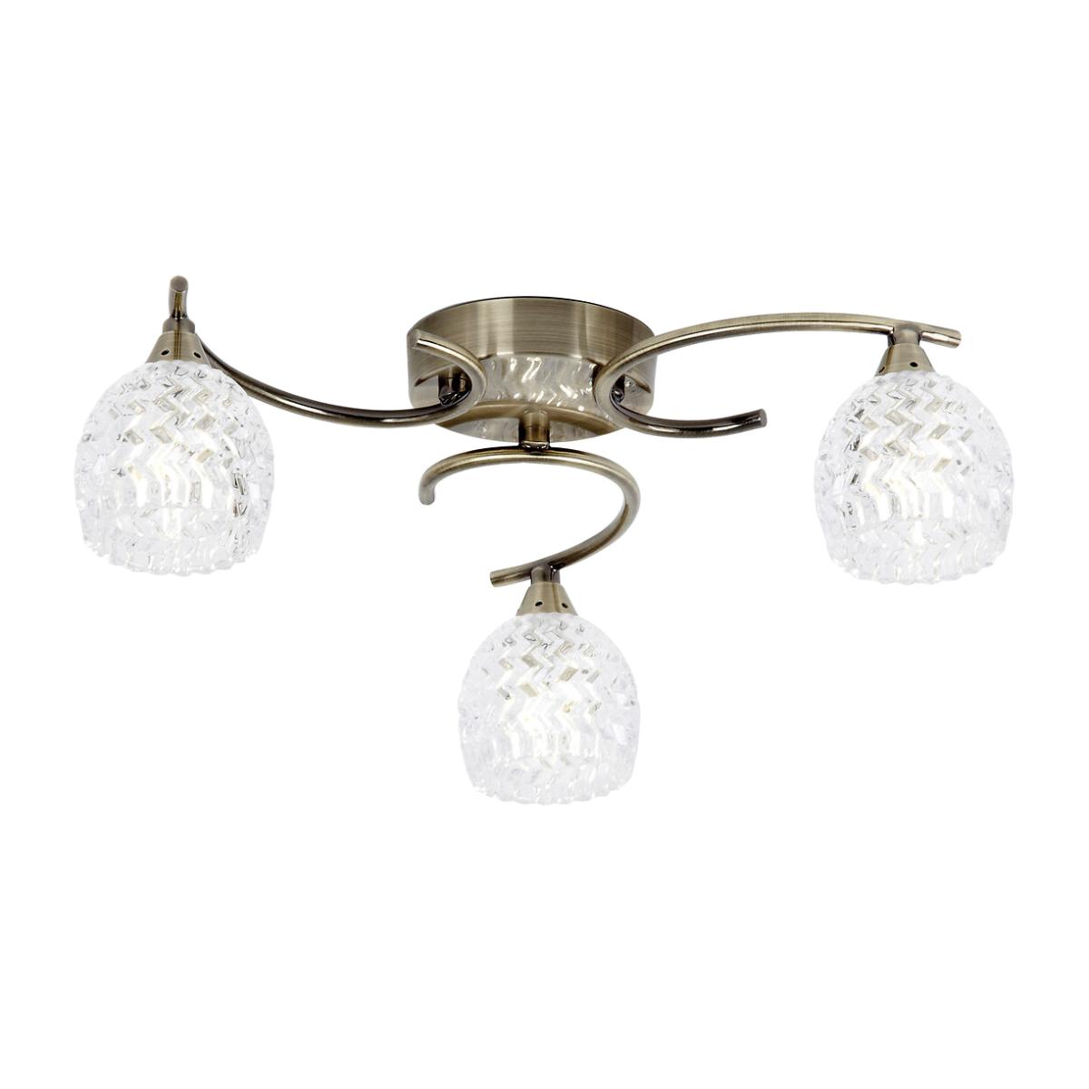 A 3 light flush ceiling fitting with curved metal arms in an antique brass finish, and cut glass shades. Suitable for use with LED lamps and dimmable. H13 X W40CM.. This product will be dispatched by one of our trusted suppliers. You’ll be contacted by their selected courier about your delivery.