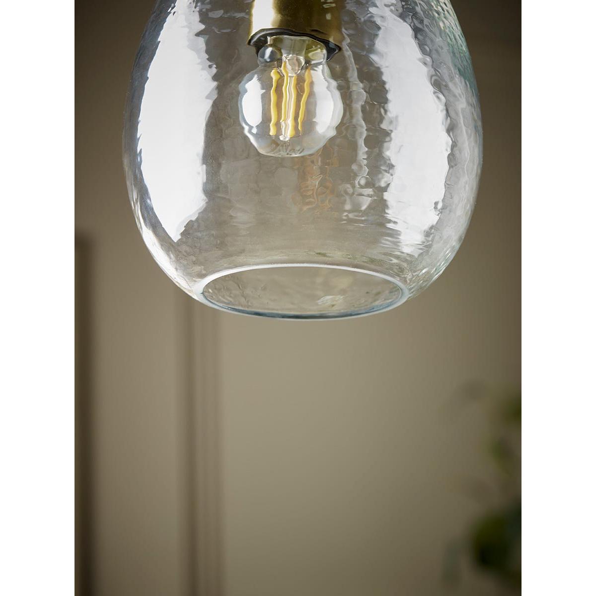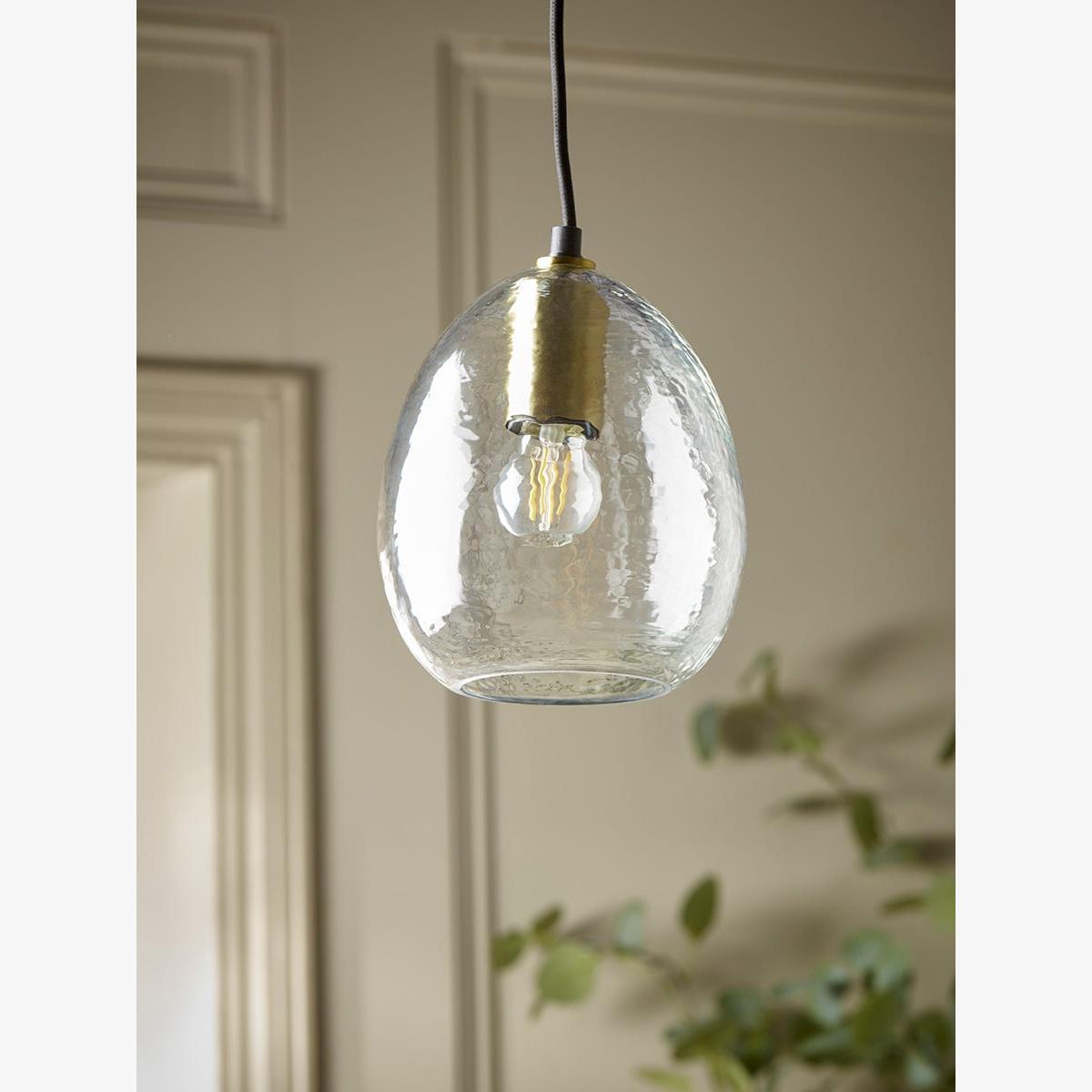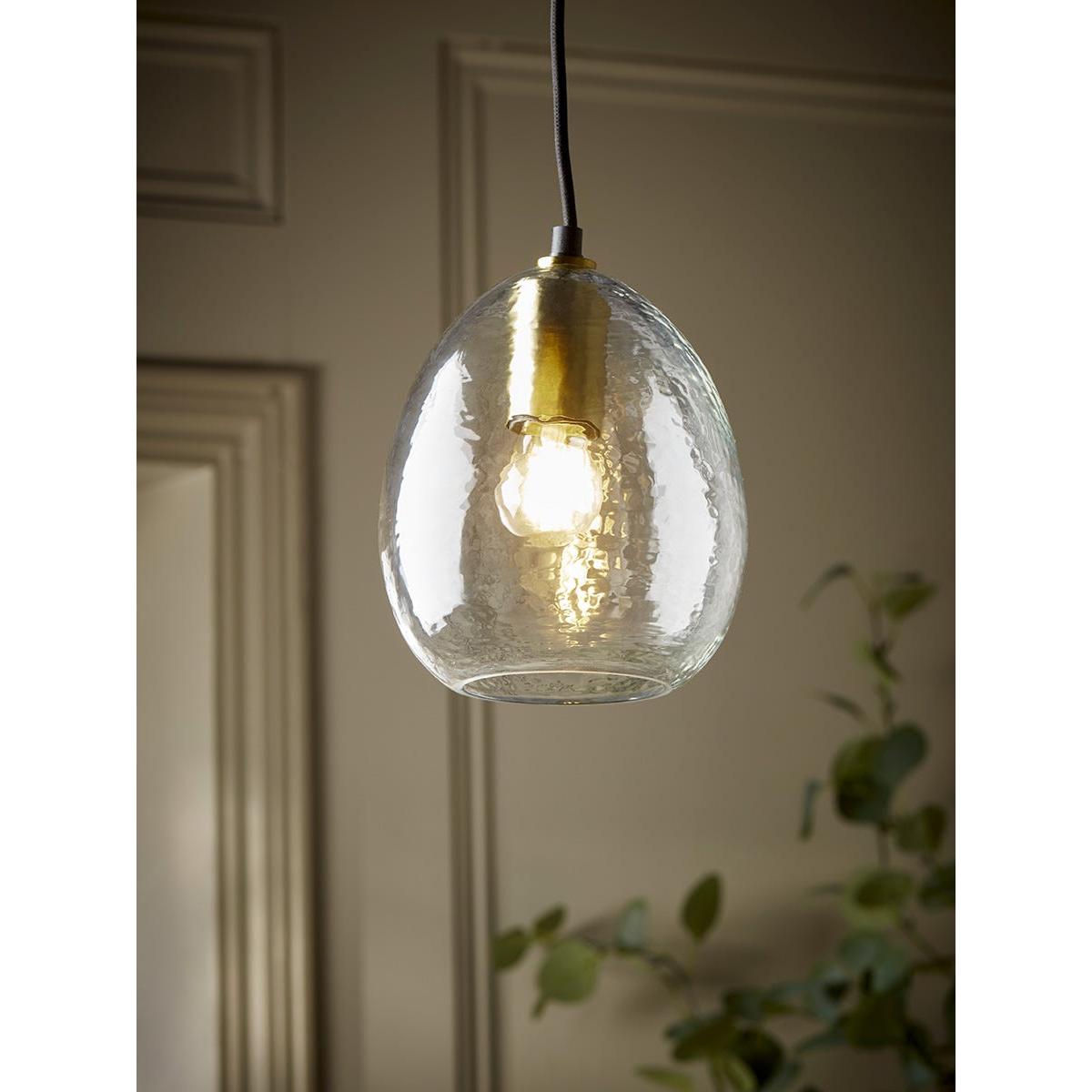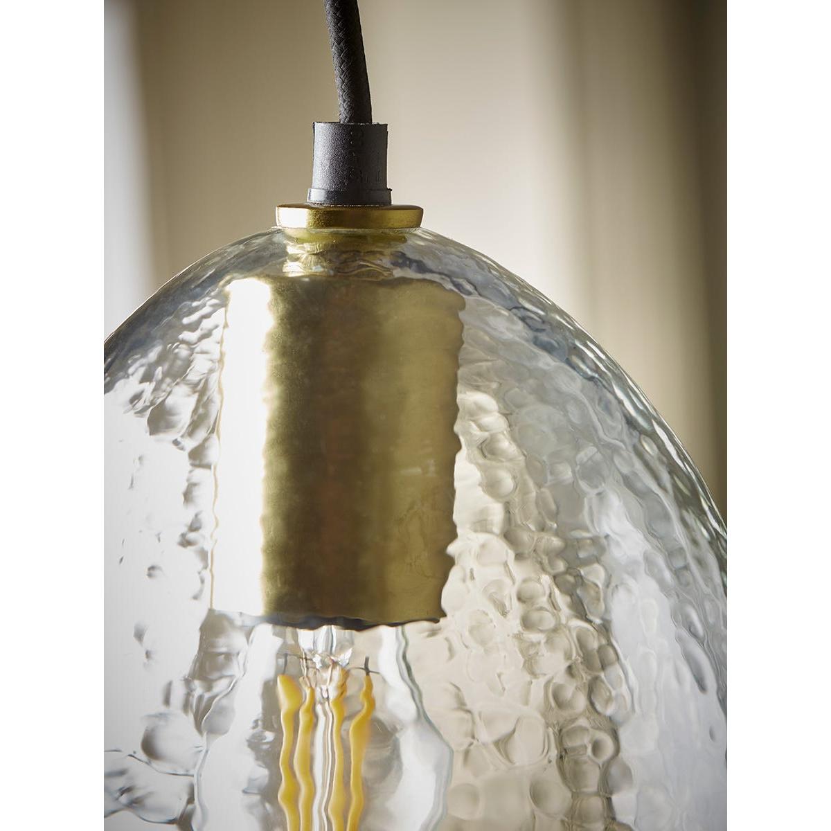 Fill your home with a heartwarming and homely atmosphere with this glass pendant. Dimpled glass creates this shade giving an antique and aged look. Black and brass fixings create modern appeal to the elegant voluminous dome shape, finishing your room with a touch of simple luxury.  Discover how to create the perfect lighting scheme for your home using our Lighting Buying Guide.