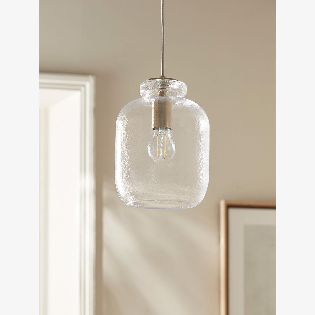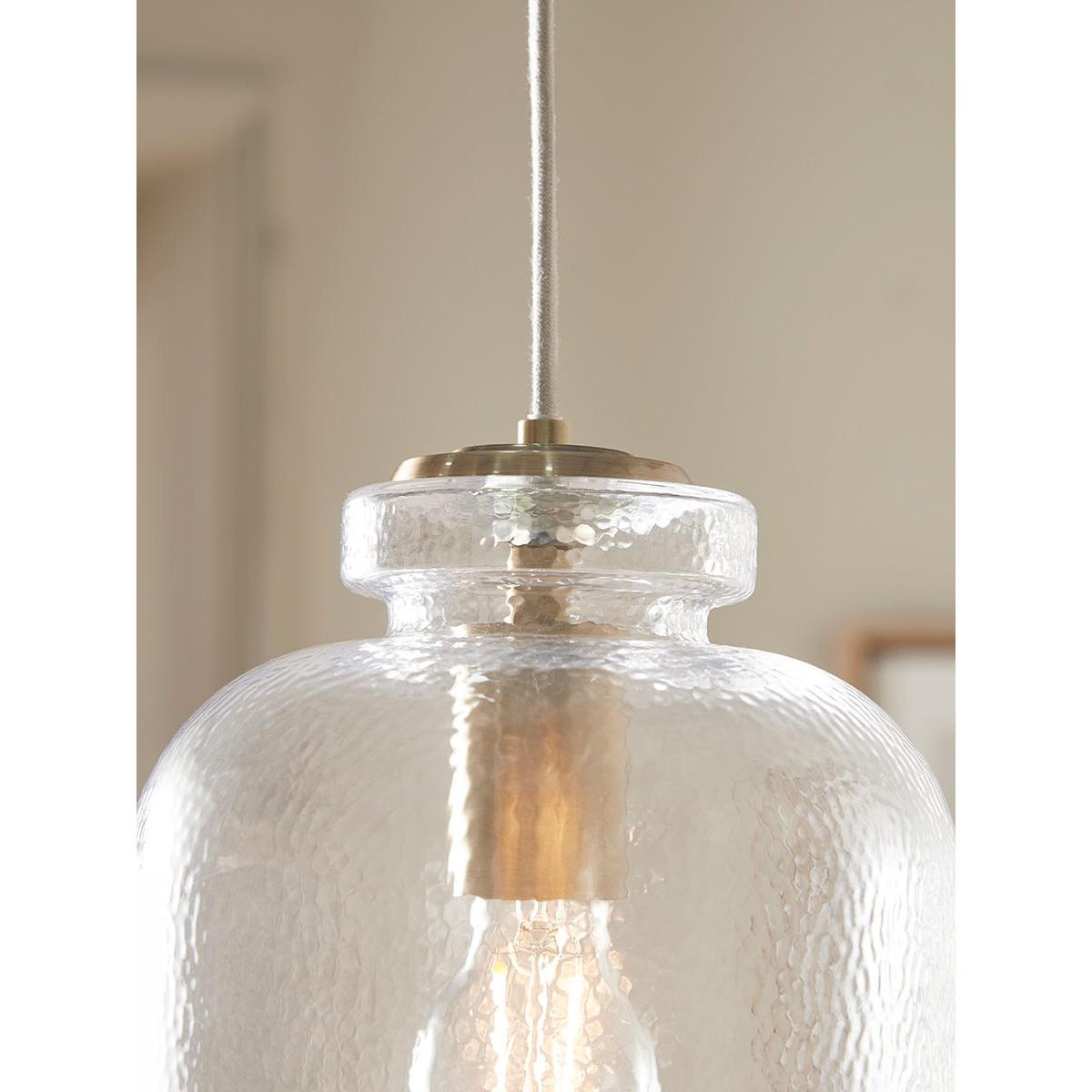 A simple but elegant pendant light featuring a jar shaped shade in dimpled clear glass with a brass metal rose and bulb holder.  A natural coloured fabric flex adds to the premium styling of this ceiling light.