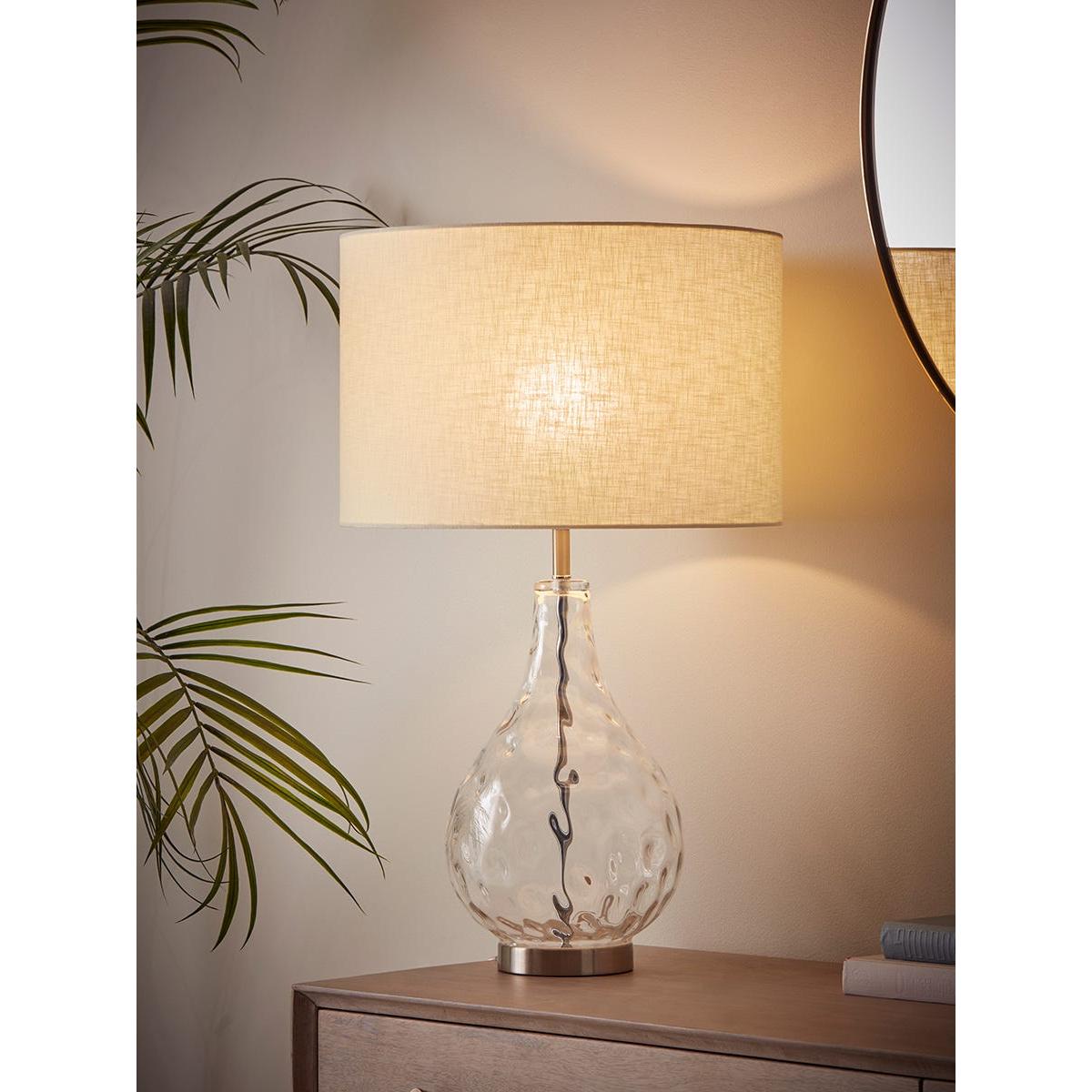 A teardrop shaped body of dimpled glass, set on a chrome coloured base gives this elegant table lamp an airy and reflective quality to elevate your lighting scheme. The table lamp is completed with a natural linen drum shade for a cohesive pairing that enrich both classic and contemporary rooms.