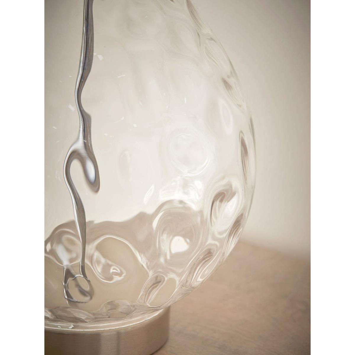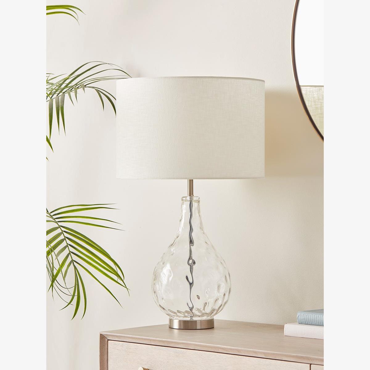 I love this table lamp for its understated elegance and tactile appeal; the dimpled glass adds a subtle texture that catches the light beautifully. It works well in both contemporary and traditional interiors, especially in neutral-toned schemes or alongside natural materials like wood and linen. For styling tips, consider using it as a bedside or side table lamp paired with minimalist accessories, or grouping it with other glass or metallic pieces for a more curated look. Its versatile design means it can effortlessly elevate a lounge or dressing area, providing both functional illumination and a touch of sophisticated charm.