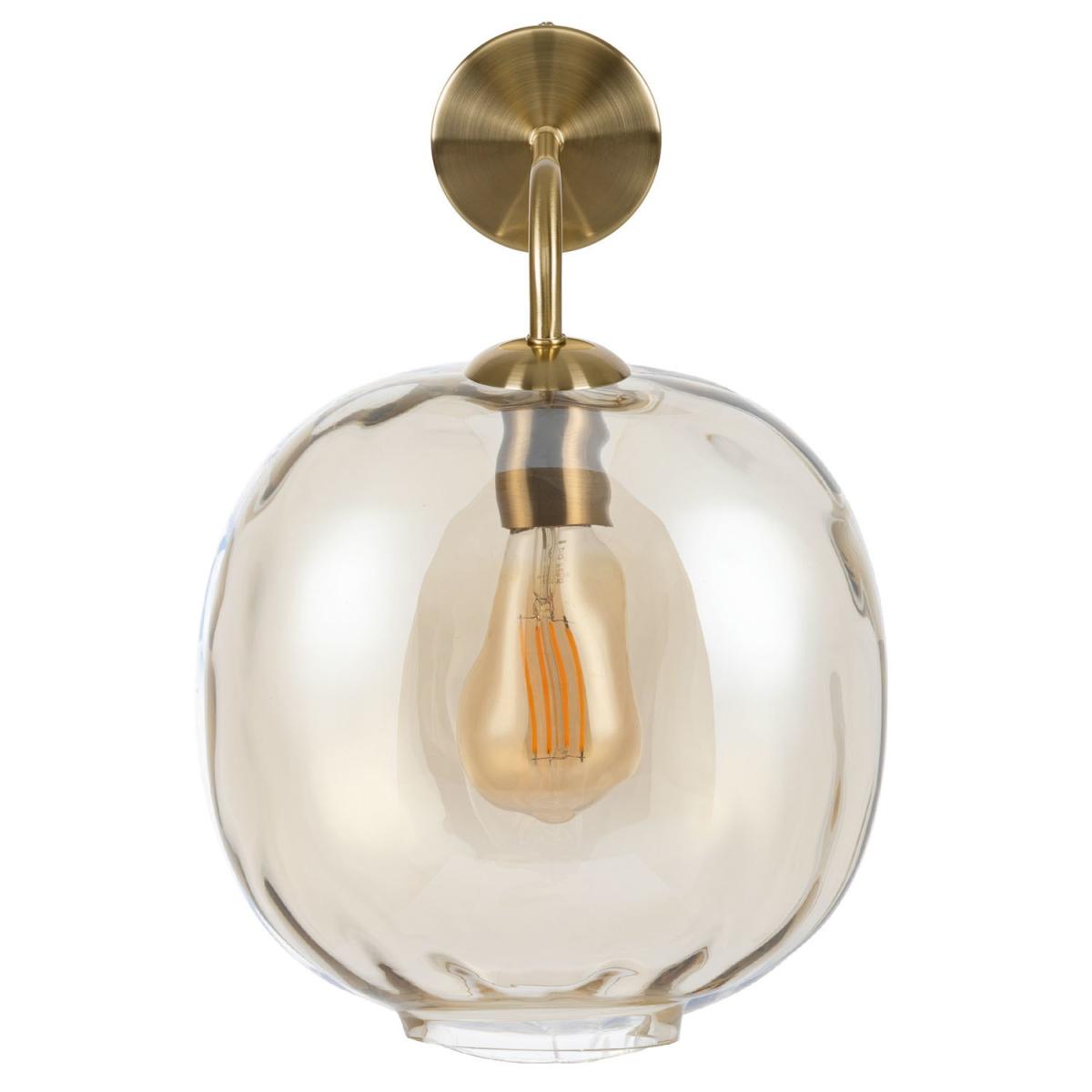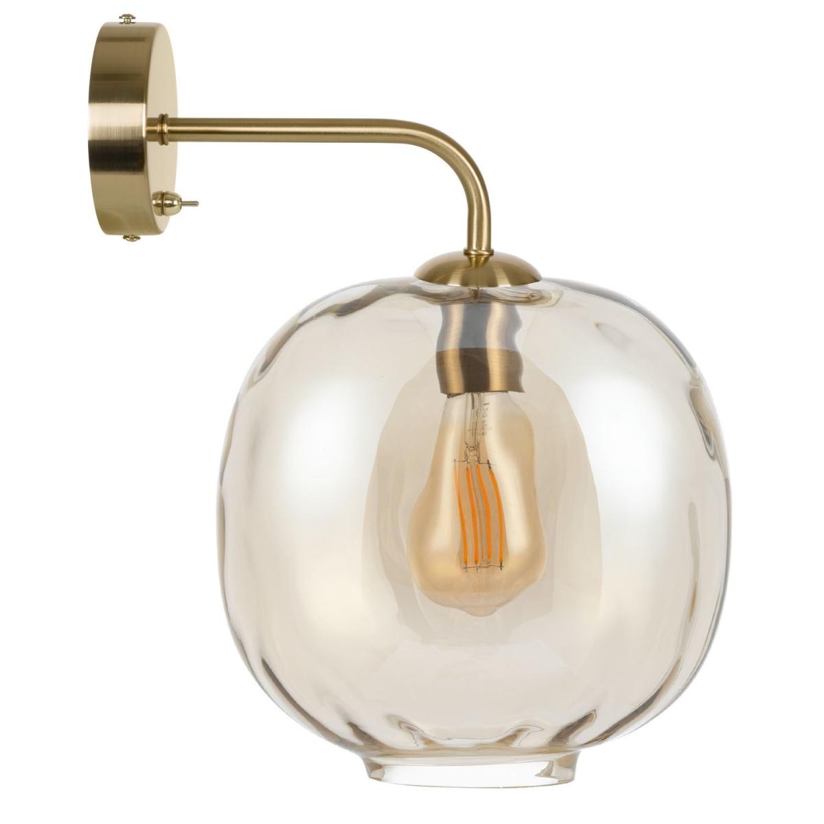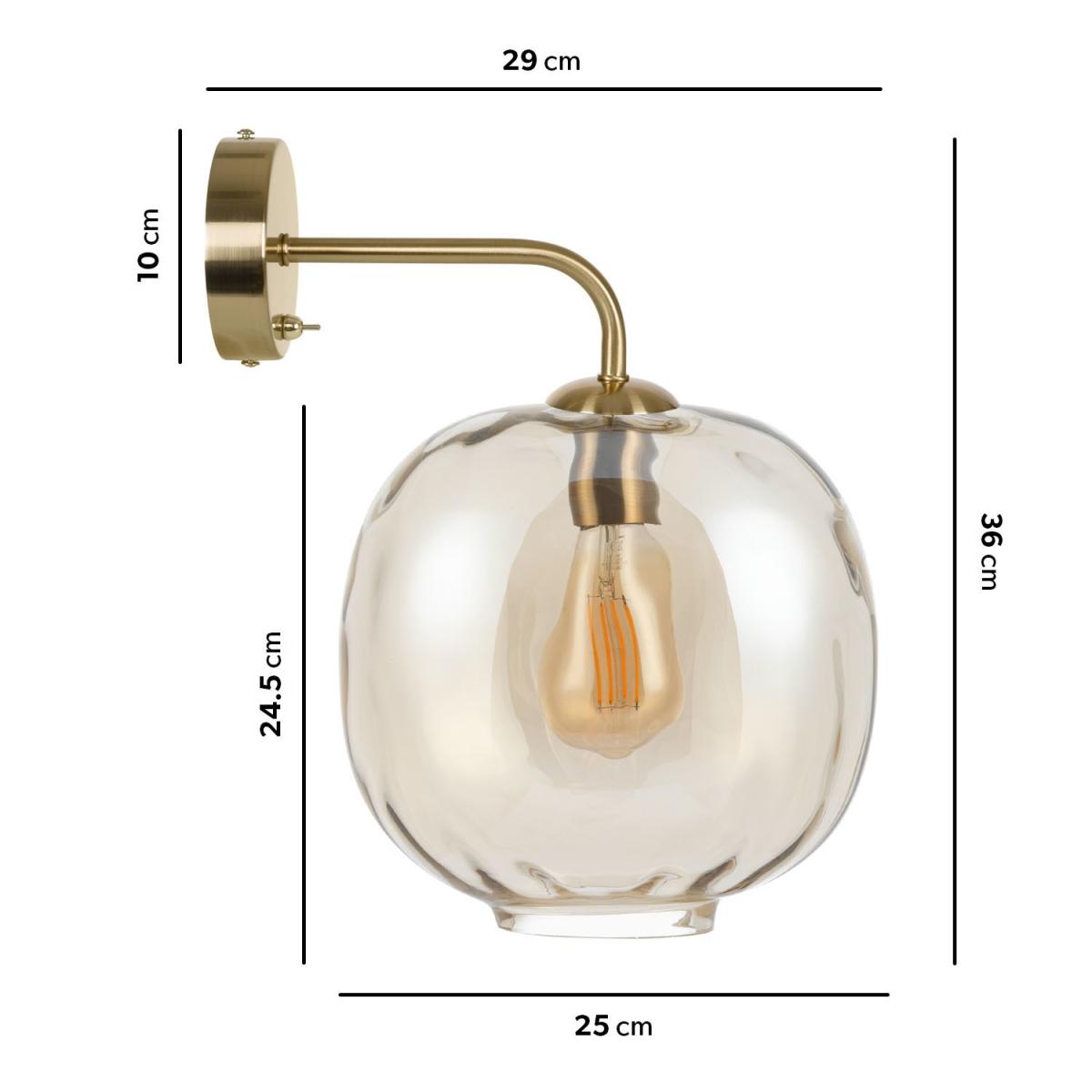 Features we love Elegant yet minimal champagne tinted wall light. Its dimpled glass shade creates an instant focal point. Complete with contrasting brushed brass accents. It’s easy to style in any living space in your home. Also comes in a smoked and; iridescent effect glass shade All about me. This wall light brings an elegant touch to your home with its dimpled glass shade. With a brushed brass fixture and champagne lustre colouring it’ll compliment any existing interior style. It would look great in your hallway bedroom or living room. It emits just the right amount of warm lighting plus it’s dimmable and LED compatible too so you’re free to add your own lighting effect. A matching ceiling light is also available. Need to know. Overall dimensions. W25 x D29 x H36 cm Shade dimensions. W25 x D25 x H24.5 cm Backplate dimensions. W10 x D2.5 x H10 cm Range. Avellino Style. Modern Fixture design. Wall Switch type. Rocker Number of lights. 1 Bulb type. E27 Maximum wattage. 40W IP rating. IP20 Colour. Champagne Finish. Glass and brushed brass metal (accents and backplate) Material. Glass metal and PVC (cable inside) LED compatible. Yes Dimmer compatible. Yes Bulb included. No Weight. 1.53kg Fixings supplied. Yes Assembly required. Yes Warranty. 1 year.