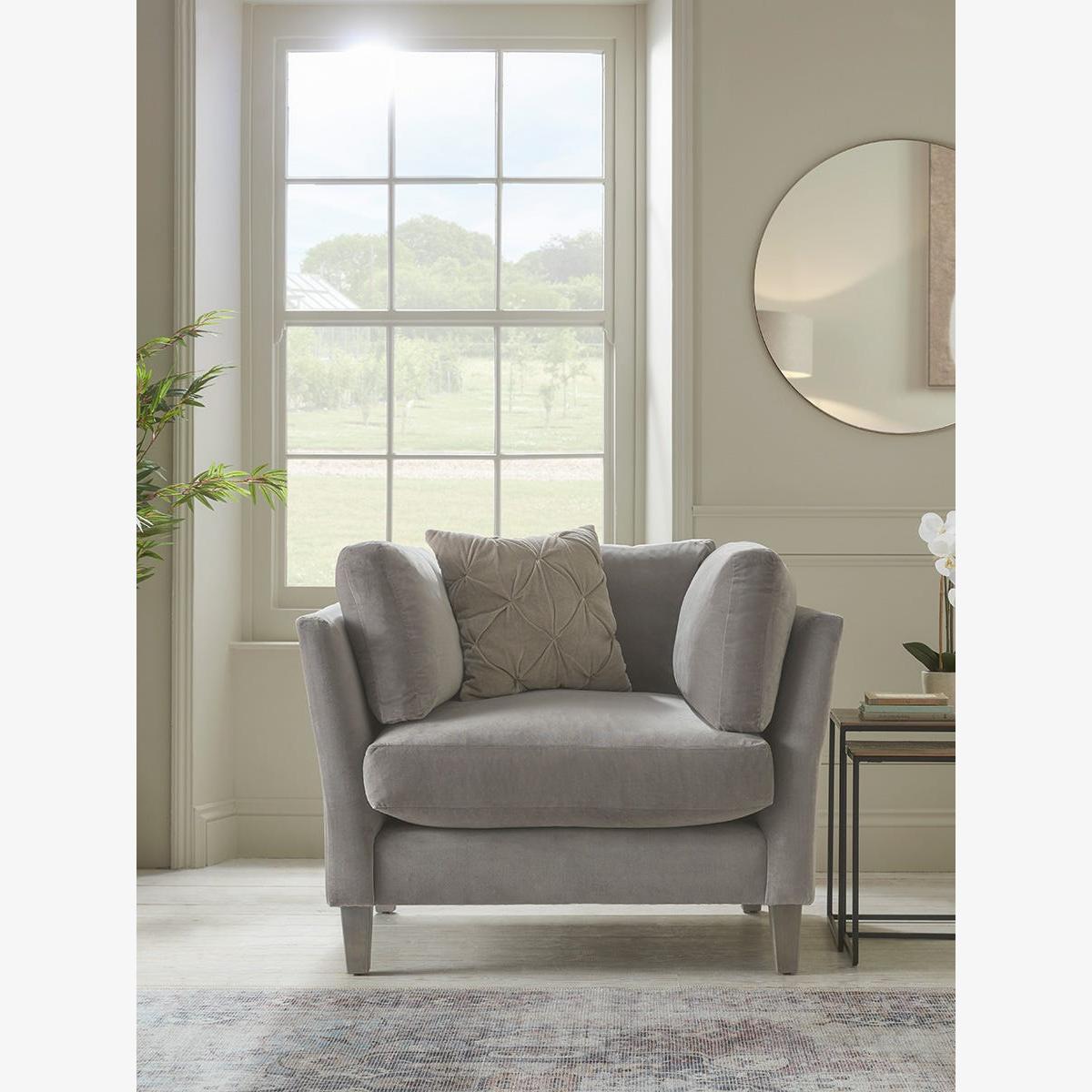 The combination of high frame and cushion surround gives the Dinan loveseat its supportive seating position, making it perfect for more structured living room layouts, while the wedge shaped solid oak feet add a contemporary flourish. The Dinan range also includes a two seater and a three seater sofa and an ottoman. Pictured here in our Dove velvet, our Dinan collection can be upholstered in a choice of 34 distinctive shades and six fabrics to suit your style. Read our Upholstery FAQs View our full Upholstery Terms and Conditions