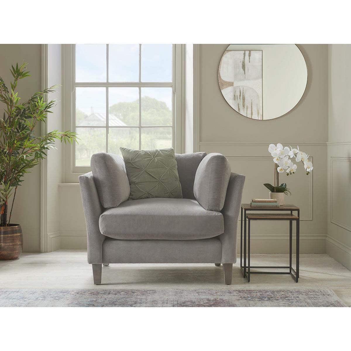 The combination of high frame and cushion surround gives the Dinan loveseat its supportive seating position, making it perfect for more structured living room layouts, while the wedge shaped solid oak feet add a contemporary flourish. The Dinan range also includes a two seater and a three seater sofa and an ottoman. Pictured here in our Dove velvet, our Dinan collection can be upholstered in a choice of 34 distinctive shades and six fabrics to suit your style. Read our Upholstery FAQs View our full Upholstery Terms and Conditions