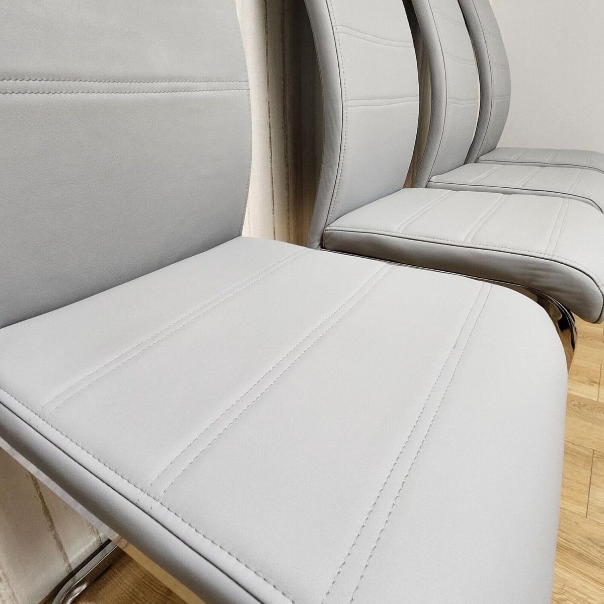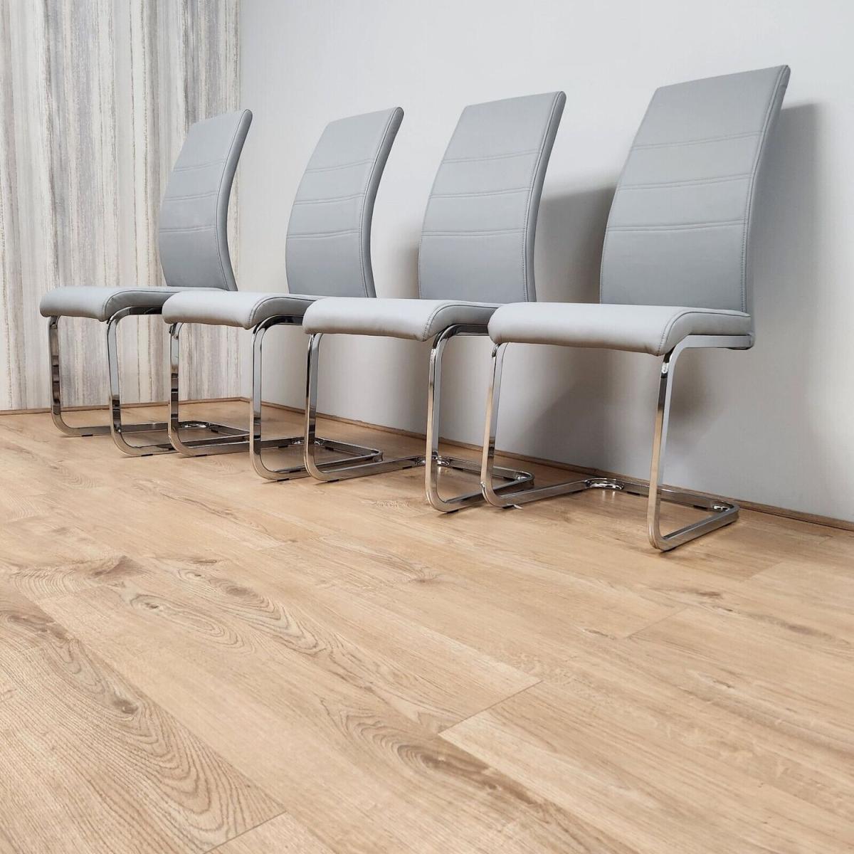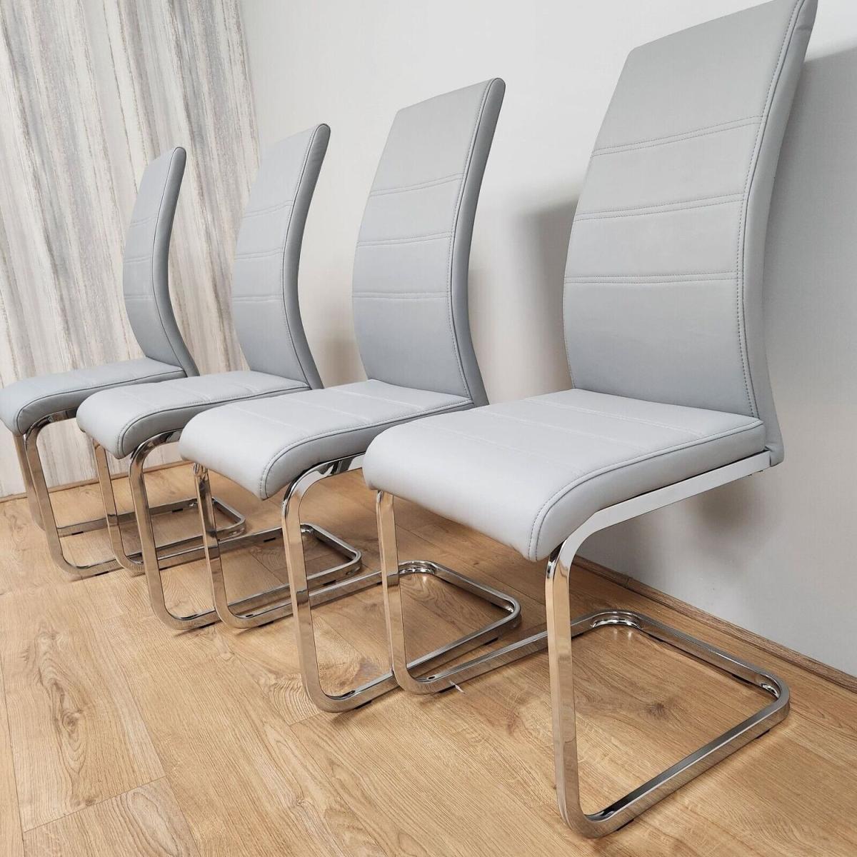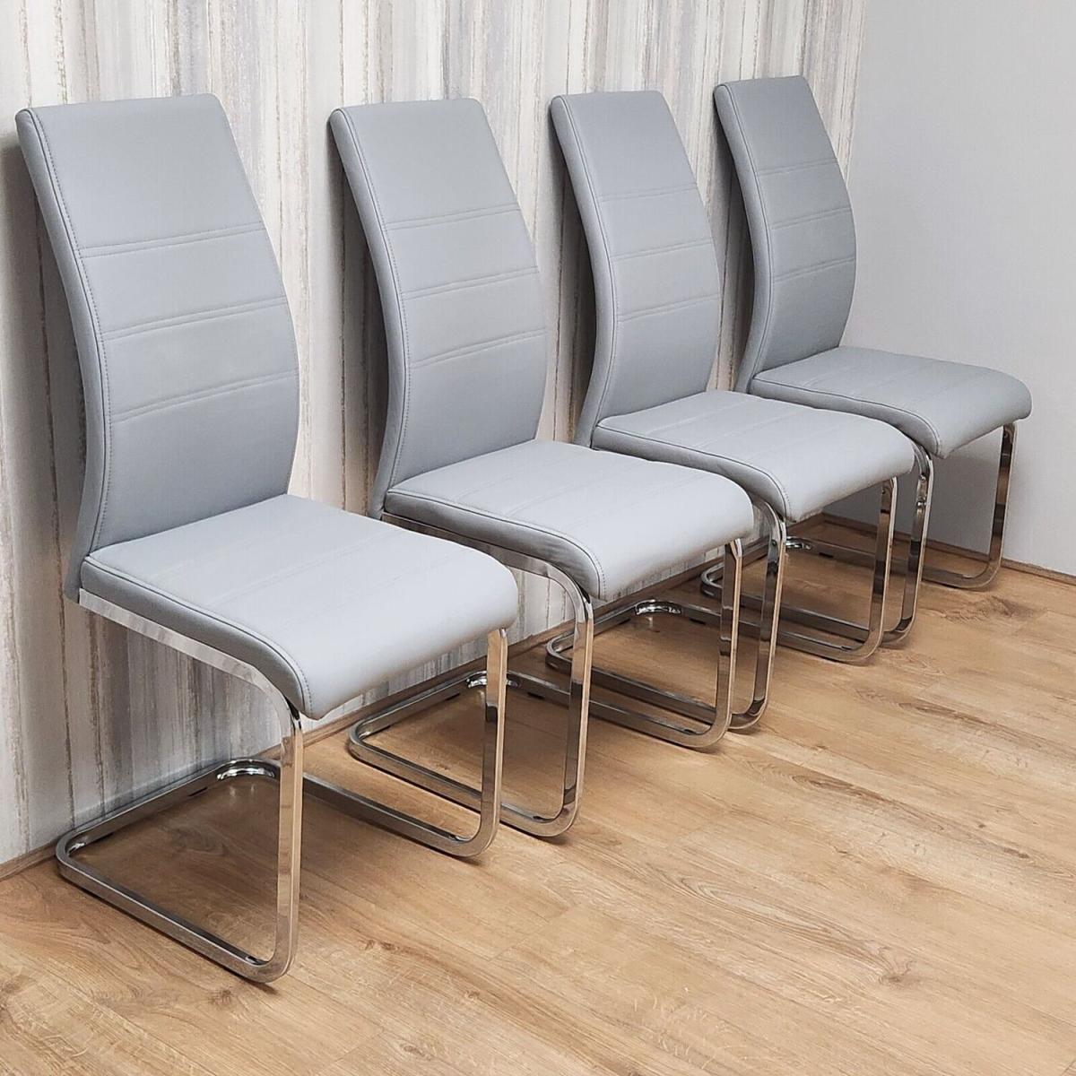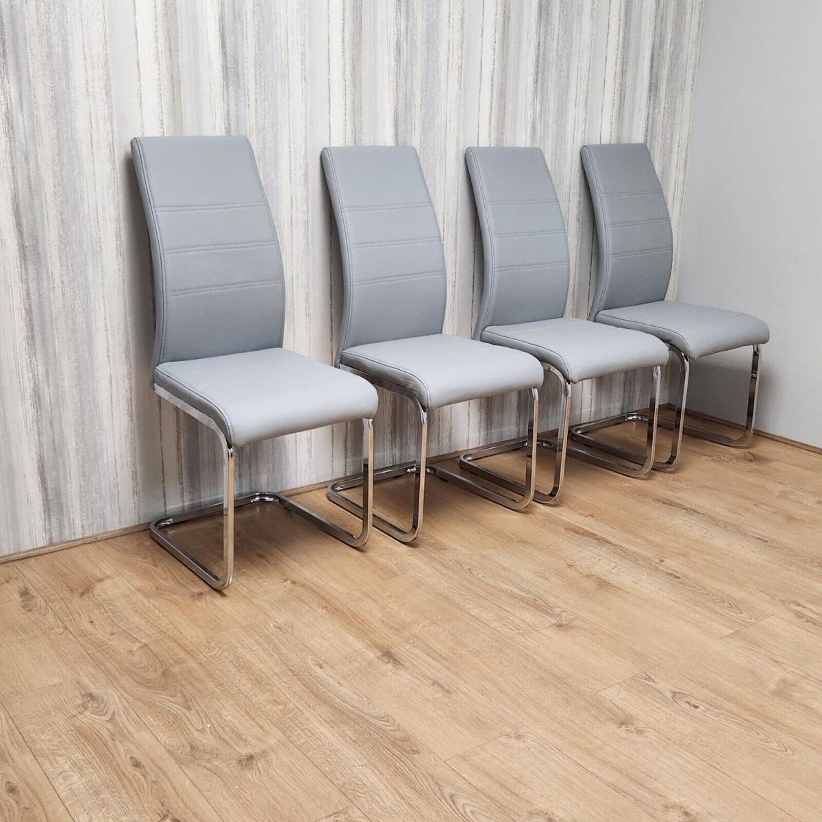Simplistic yet beautifully designed high back faux leather dining chairs. These grey chairs were designed with slight arched backs and curved chrome legs for that sleek and sophisticated look. Not only do they add the touch of class to any dining table but are also padded for that extra comfort. These chairs come as a set of 4. Chair Size: 42 X 57 X 100cm. Flat packed for easy home assembly (just need to assemble the leg frames).