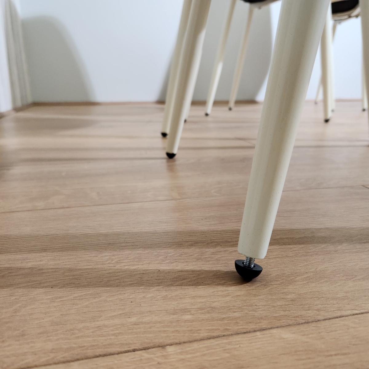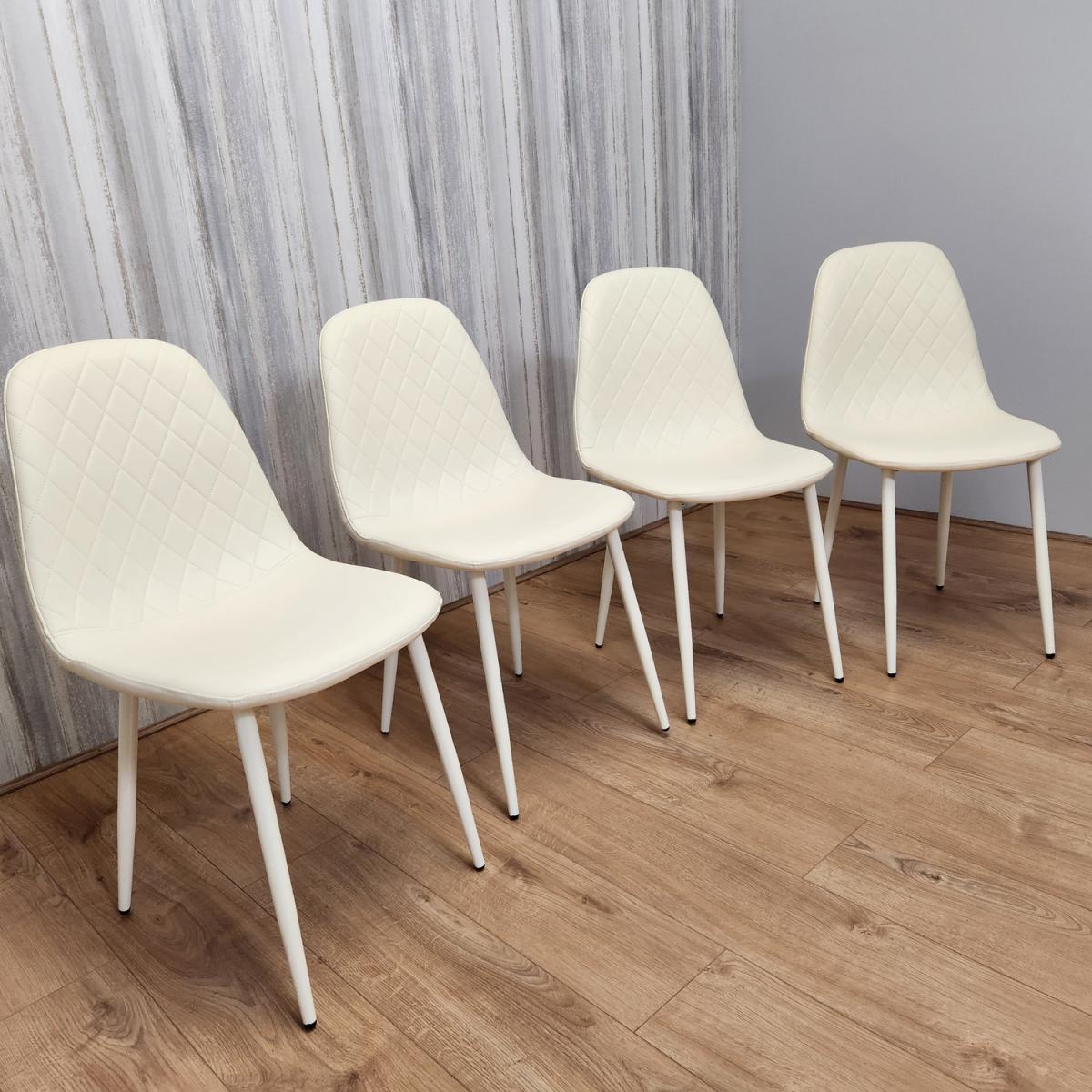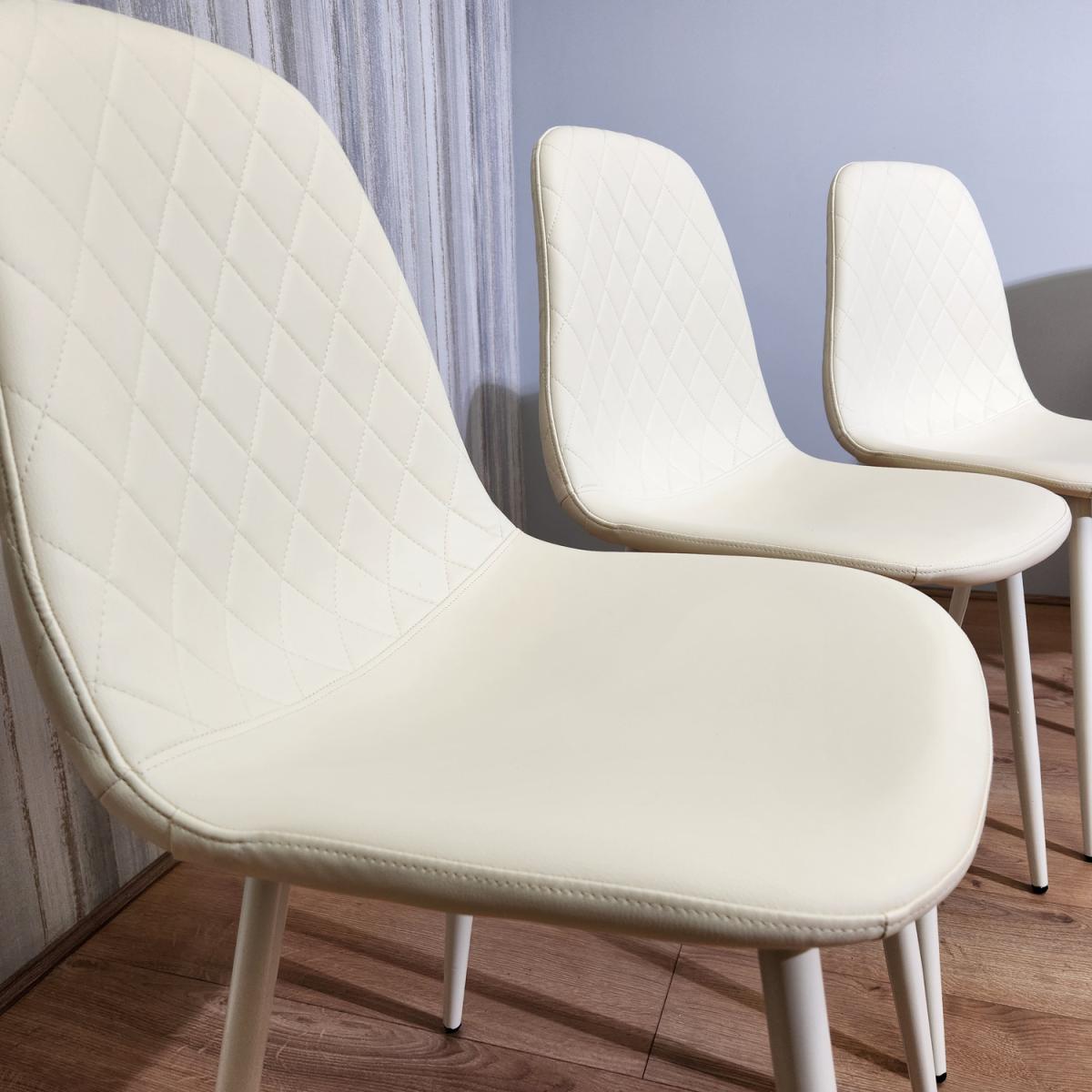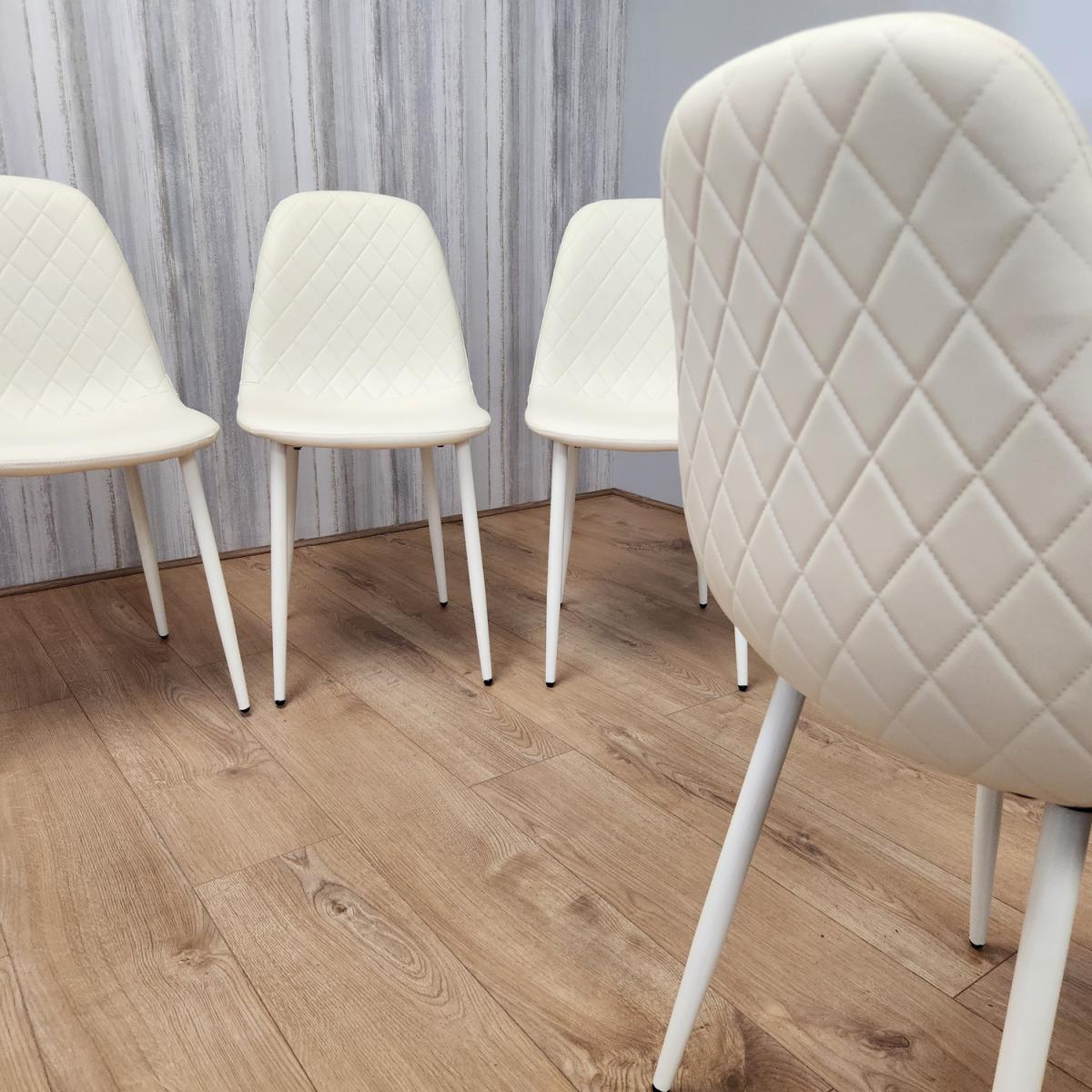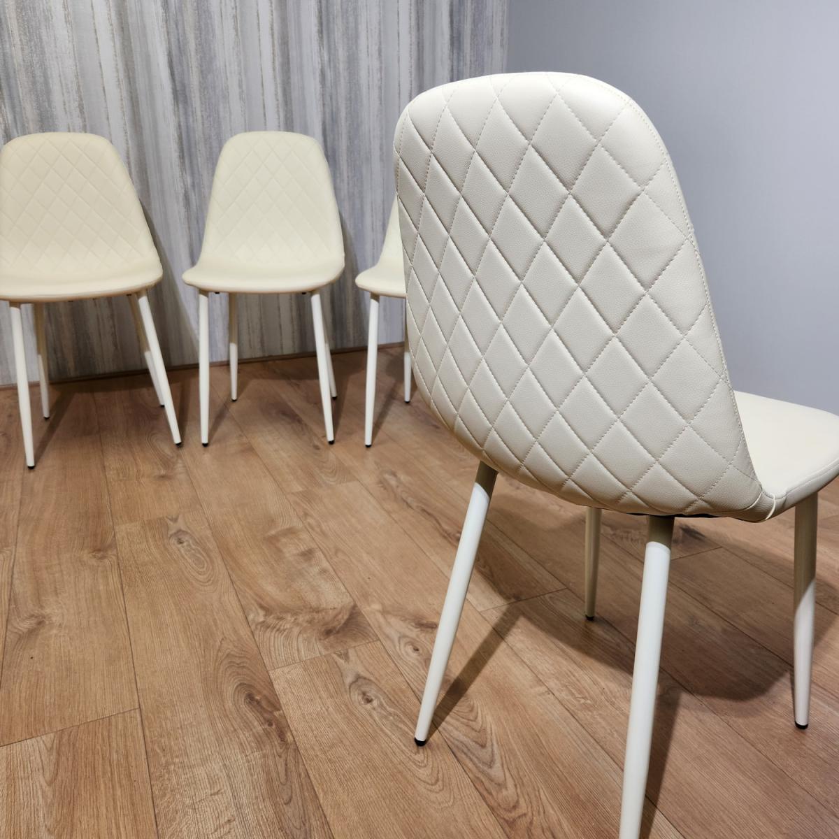 Introducing our exquisite set of four stitched leather chairs, a harmonious blend of luxury and comfort that will elevate your dining room or kitchen with timeless elegance. These chairs are meticulously designed, featuring an intricate diamond-stitched pattern on both the front and back, creating an aura of opulence and refinement that will capture your attention. Wrapped in sumptuous cream-colored leather upholstery, these chairs exude a sense of understated opulence, infusing your living space with a serene and inviting ambiance. The cream hue radiates a feeling of purity and sophistication, making these chairs a versatile addition that seamlessly complements various interior styles. Mirroring the elegance of the cream leather, the chairs are supported by graceful cream metal legs, creating a sense of fluidity and cohesion in design. The cream metal legs provide sturdy support and an elevated contemporary appeal, making them a versatile fit for both modern and transitional spaces. A notable feature of these chairs is the adjustable foot mechanism, artfully integrated to ensure a level seating experience on any surface. This feature underscores our commitment to your comfort, enabling you to fully immerse yourself in meals, conversations, and gatherings without any disruptions. Chair Size: 44. D x 52W x 85. H cm.