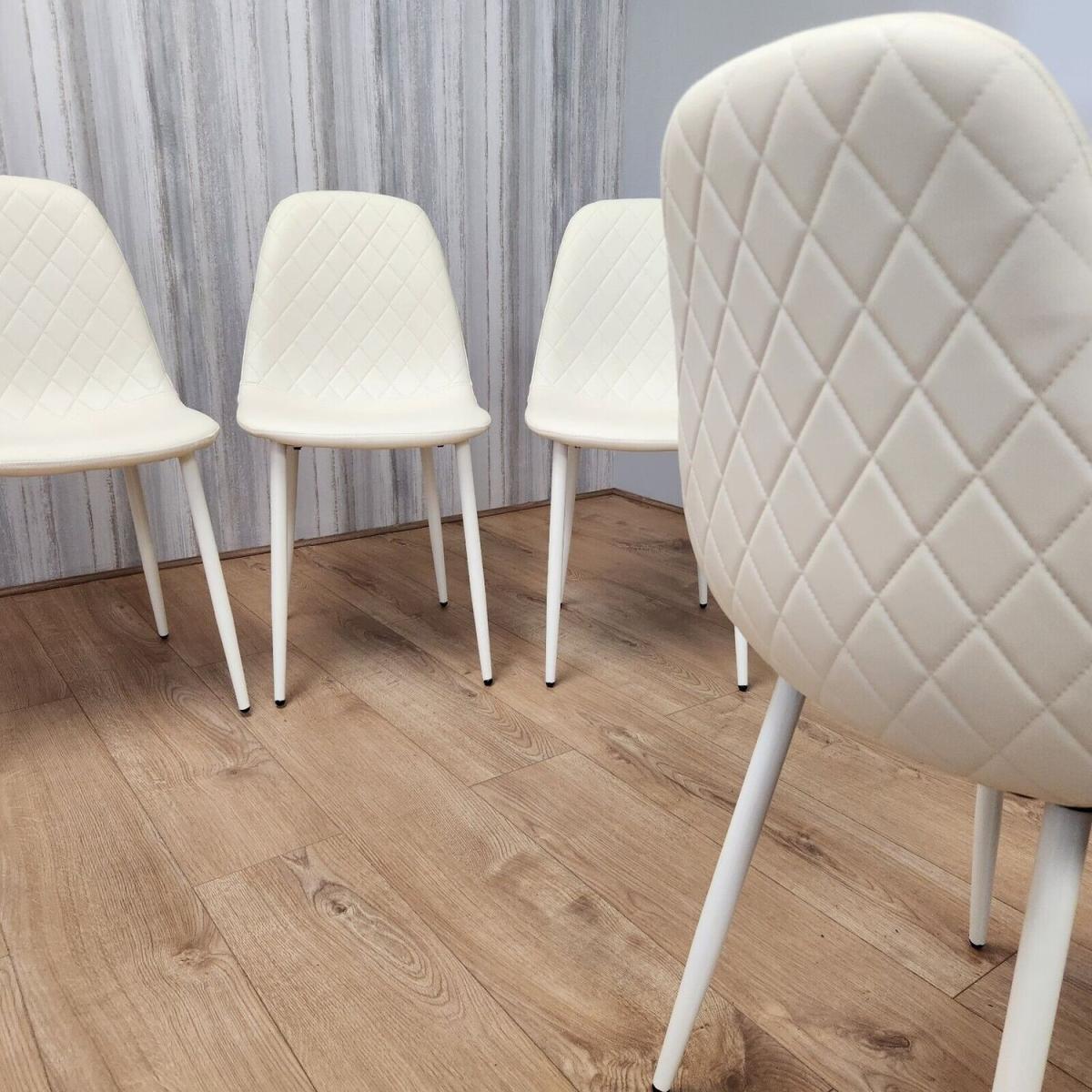 Elevate your dining experience with this set of 4 dining chairs. Upholstered in luxurious faux leather, each chair is padded for comfort and features exquisite diamond stitching on both the front and back. These chairs add a touch of elegance to any space. Conveniently flat-packed for easy home assembly, requiring only the attachment of the legs. Upgrade your dining area effortlessly with these stylish and comfortable chairs.