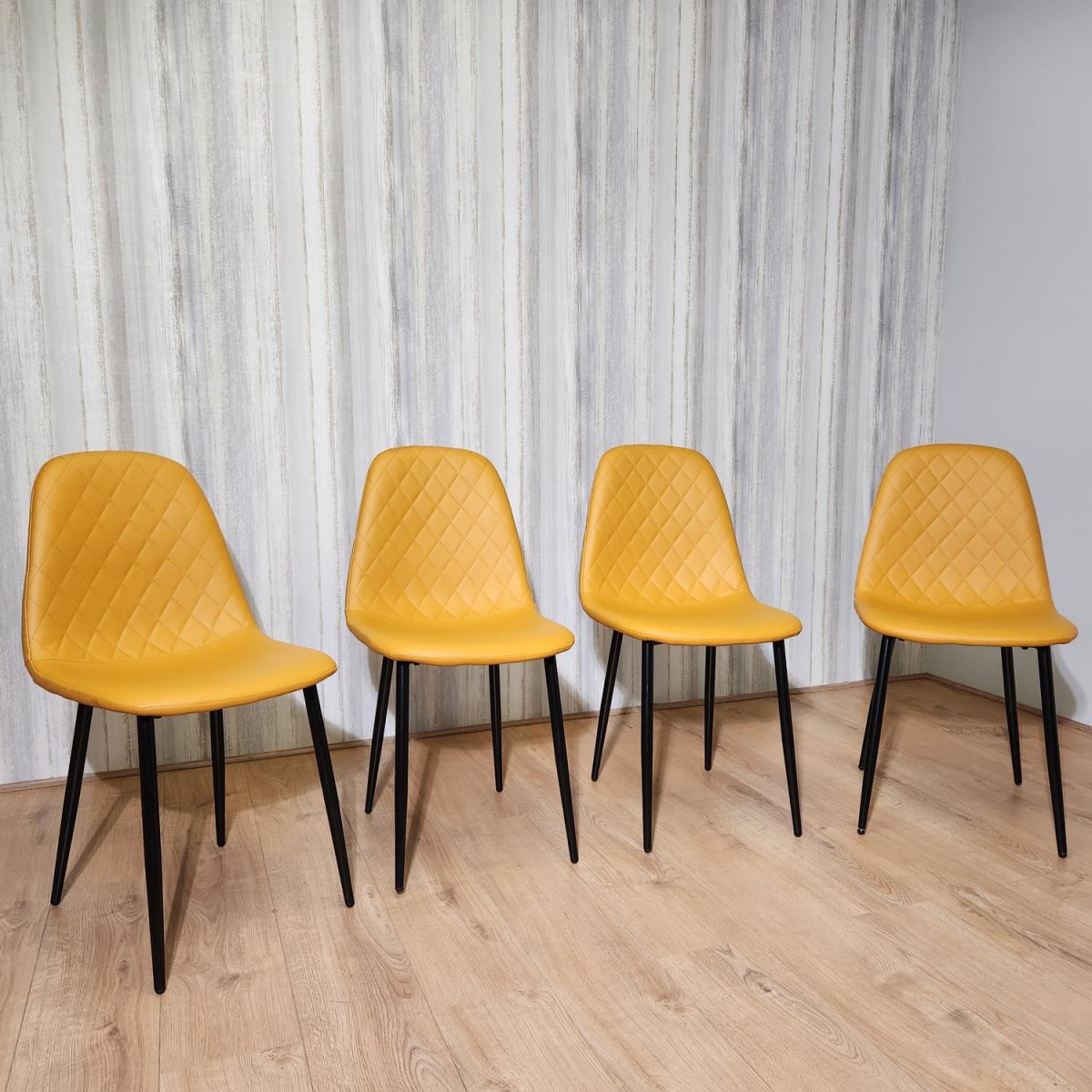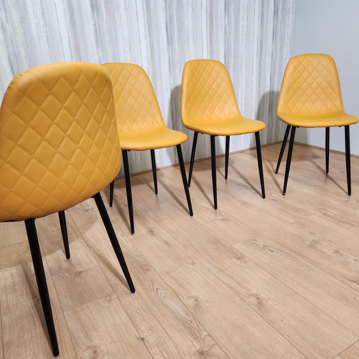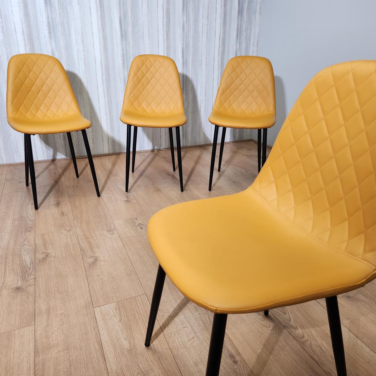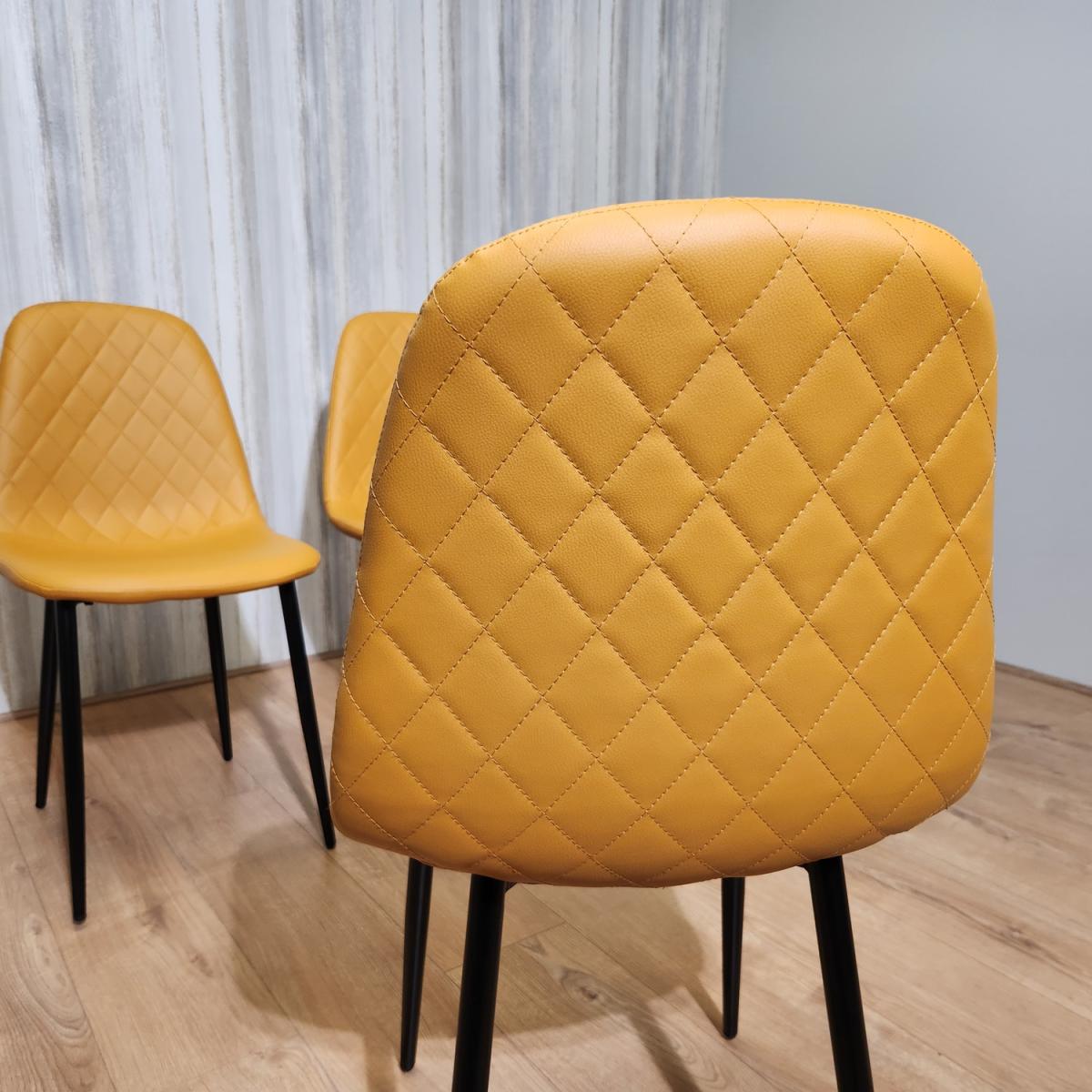 Introducing our captivating set of four stitched leather chairs, an embodiment of sophistication and comfort that will redefine your dining room or kitchen space. These chairs are meticulously designed, featuring a luxurious diamond-stitched pattern on both the front and back, creating an aura of opulence and elegance that will captivate your senses. Cloaked in rich mustard-colored leather upholstery, these chairs bring a vibrant and inviting warmth to your living area. The mustard hue adds a touch of character and uniqueness, making these chairs a standout feature that complements a range of interior styles. The diamond-stitched pattern, meticulously applied to both sides of the chairs, showcases our dedication to intricate craftsmanship. Each stitch is thoughtfully placed, resulting in a harmonious pattern that exudes both visual allure and tactile luxury. The dual-sided design ensures that these chairs can be positioned freely, allowing the captivating pattern to be admired from every angle. Complementing the striking mustard leather, the chairs are supported by sleek black metal legs that add a modern and edgy contrast. The black metal legs not only provide stability and durability but also enhance the chairs' contemporary appeal, making them a seamless fit for modern and transitional spaces alike. Transform your dining and kitchen areas with the allure of our mustard-coloured stitched leather chairs, boasting diamond stitching on both sides and supported by sleek black metal legs. Embrace the fusion of style and functionality as these chairs redefine comfort and aesthetics, making every meal and gathering a memorable experience. Chair Size: 44. D x 52W x 85. H cm.