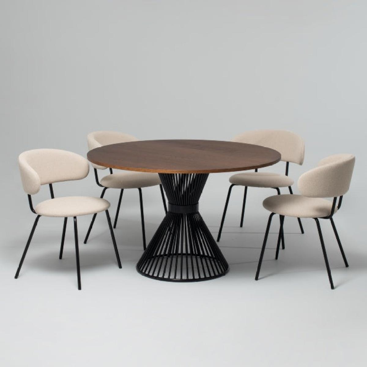 This complete dining room set includes our Ray Round Dining Table in Brown Ash and four of our Scoop Dining Chairs in Oatmeal. There has never been an easier way to impress guests or renew your dining experience. The Ray Round Dining Table has a unique ray-shaped base made up of 47 sleek, steel rods - seamlessly welded in Italy. Its circular design means it can be easily placed in living spaces small and large. Now available for the first time as a dining set, paired with four of our Scoop Dining Chairs in Oatmeal. Our distinctly shaped, Italian made Scoop chairs are soft, structured and durable. Upholstered in a recycled contemporary boucle, these chairs have a wide rounded backrest for comfort, making them the perfect addition to complete your dining experience. Also available as a set in our Whitened