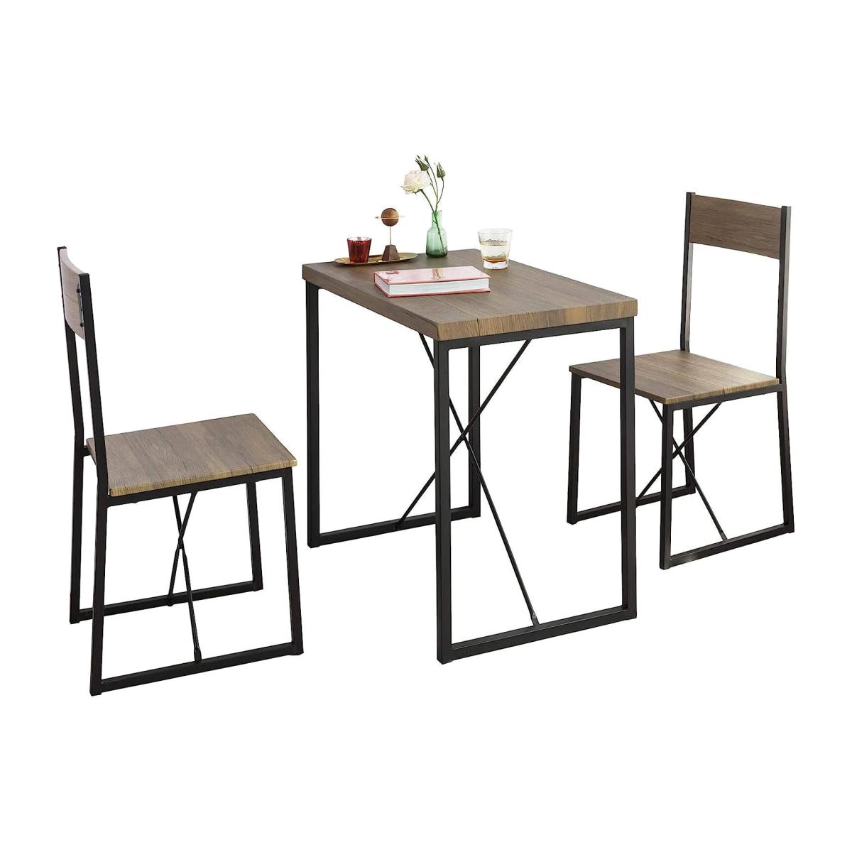 3 Pieces Dining Set- one table and two chairs - is the perfect addition to any family home. MDF tops with wooden effect. Black powder coated steel frame. Sturdy and durable. An excellent solution for the kitchen, dining room and restaurant. Practical and fashionable, this space saving dining set will provide a functional as well as relaxing place to eat and drink with friends and family.