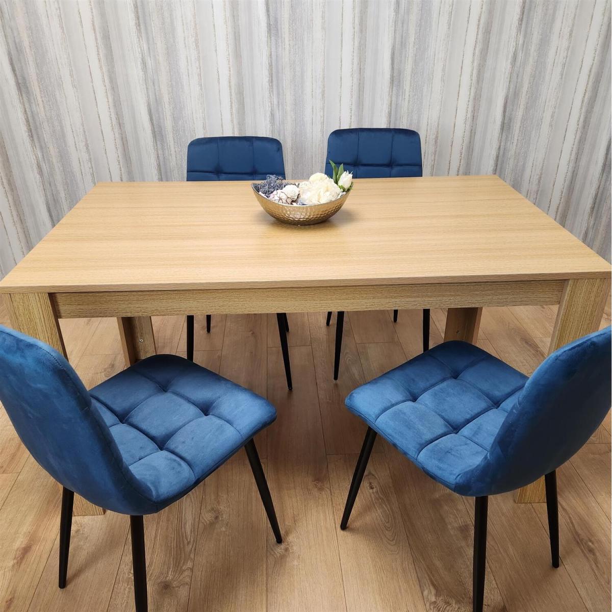 A Stunning wooden oak effect Dining Table set included set of 4 tufted velvet blue rocco chairs with slightly curved back design The dining table with oak effect. The dining chairs colour are available in green and blue with slightly curved back design for fitting with body shape. The dining table is crafted with high-quality MDF, and a melamine laminated Light Oak natural wood grain finish to ensure a durable, long-lasting tabletop. The dining chairs are made of premium velvet with metal chair legs Dimensions:The dining room chairs sizes are H87 x L59 x W44 cm. The seat height of the chair is 45 cm. Straight-forward assembly is supported by clear instructions for our dining table set.