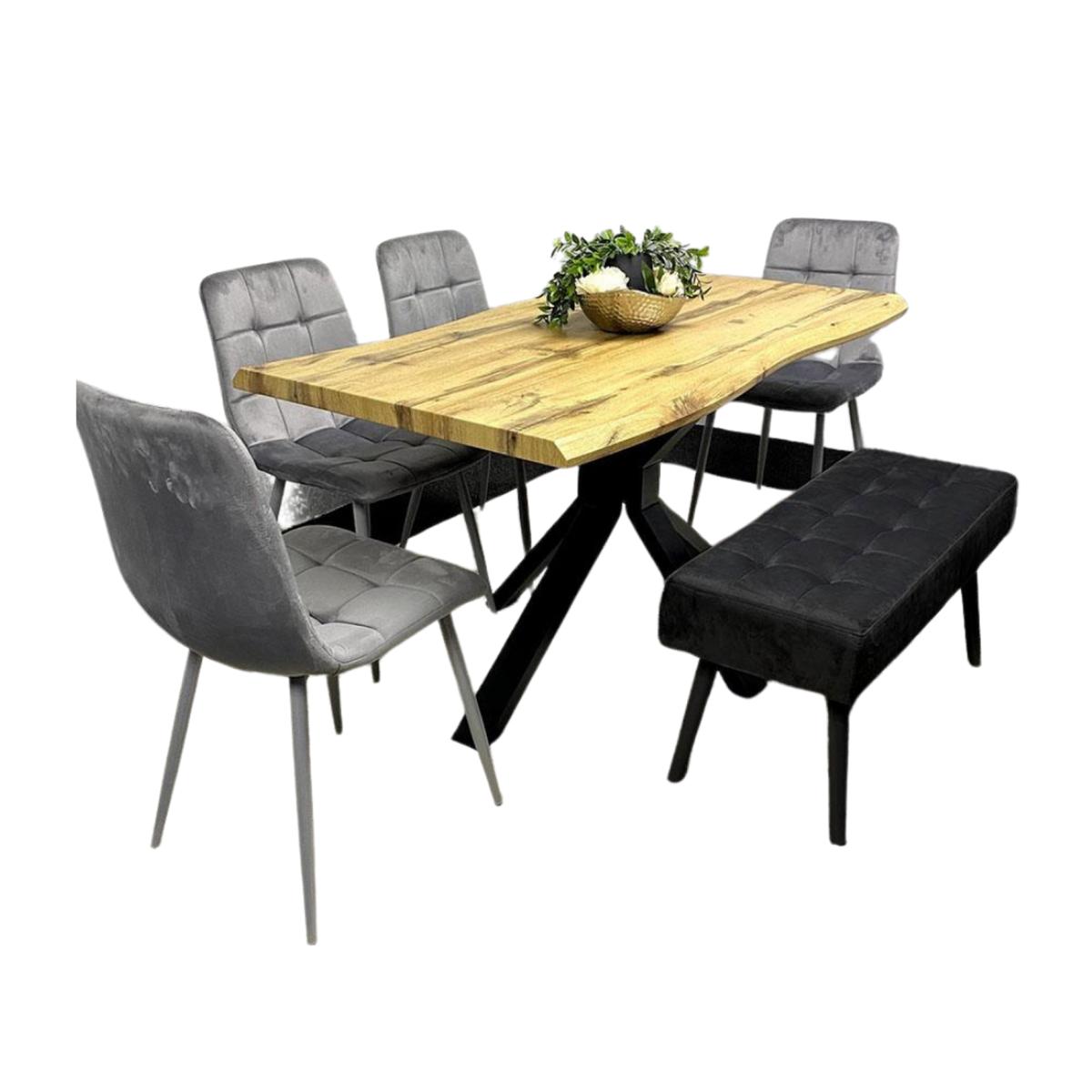 A stunning wooden rectangular brown table comes with 4 grey tufted velvet chairs and a black velvet padded bench. The dining table has durable construction - Made with a 40mm veneer curved edge and reinforced with strong X-shaped iron legs for maximum stability. The set of 4 chairs - Grey velvet chairs with tufted backs for timeless comfort. The bench has velvet comfort - A soft padded seat with stylish stitching and tufted details. Table dimensions - H75 x L117 x W77 CM, Chair dimensions - H87 cm x L59 cm x W44 cm and the seat height of these chairs is 45 cm. Bench Dimensions - L90cm x W36cm x H47cm, designed for stability and support. The dining table is sleek in design -The powder-coated iron legs offer a modern, minimalistic look while ensuring the table's strength. The chairs have floor protection - Rubber-capped legs prevent scratches while ensuring stability. The bench has a strong metal base - Sturdy legs ensure stability and long-lasting use. Easy Assembly - Hassle-free setup with clear instructions included. FEATURESThe dining set includes a table, 4 chairs and a bench. The dining table is made with a 40mm veneer curved edge and X-shaped iron legs. The dining table features a stunning brown effect.4 grey tufted velvet chairs. Rubber-capped legs provide floor protection. A black velvet padded bench. Soft padded seat with stylish stitching