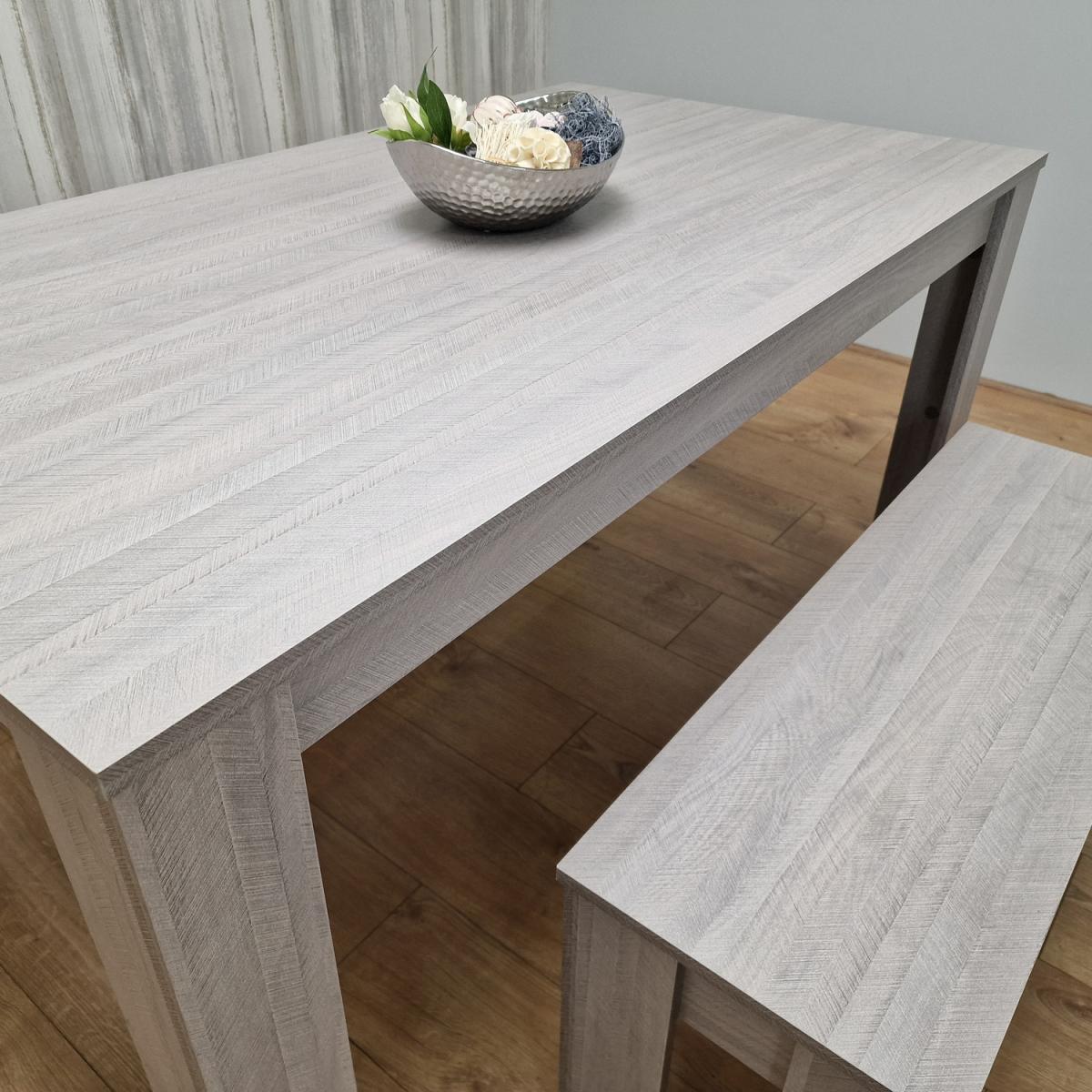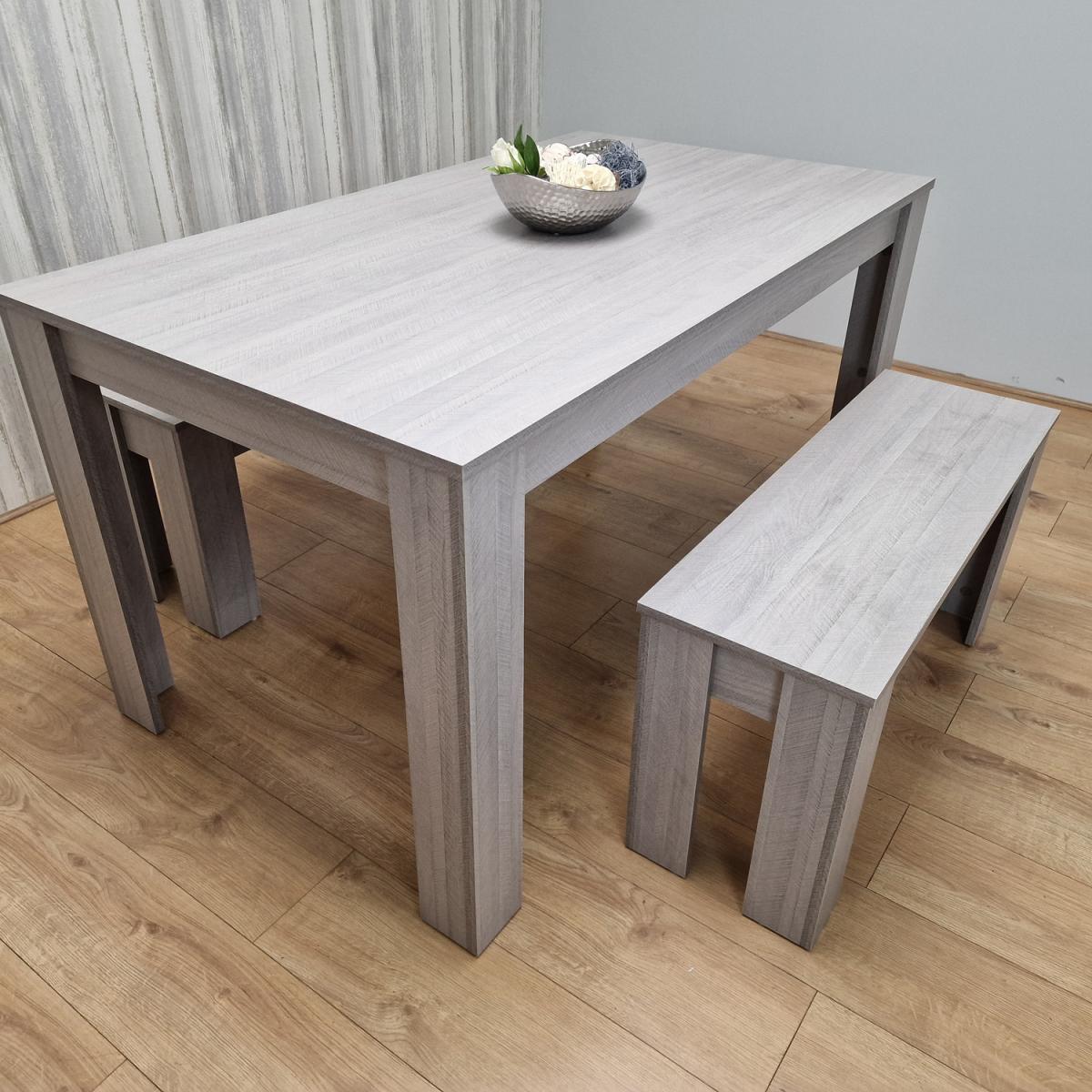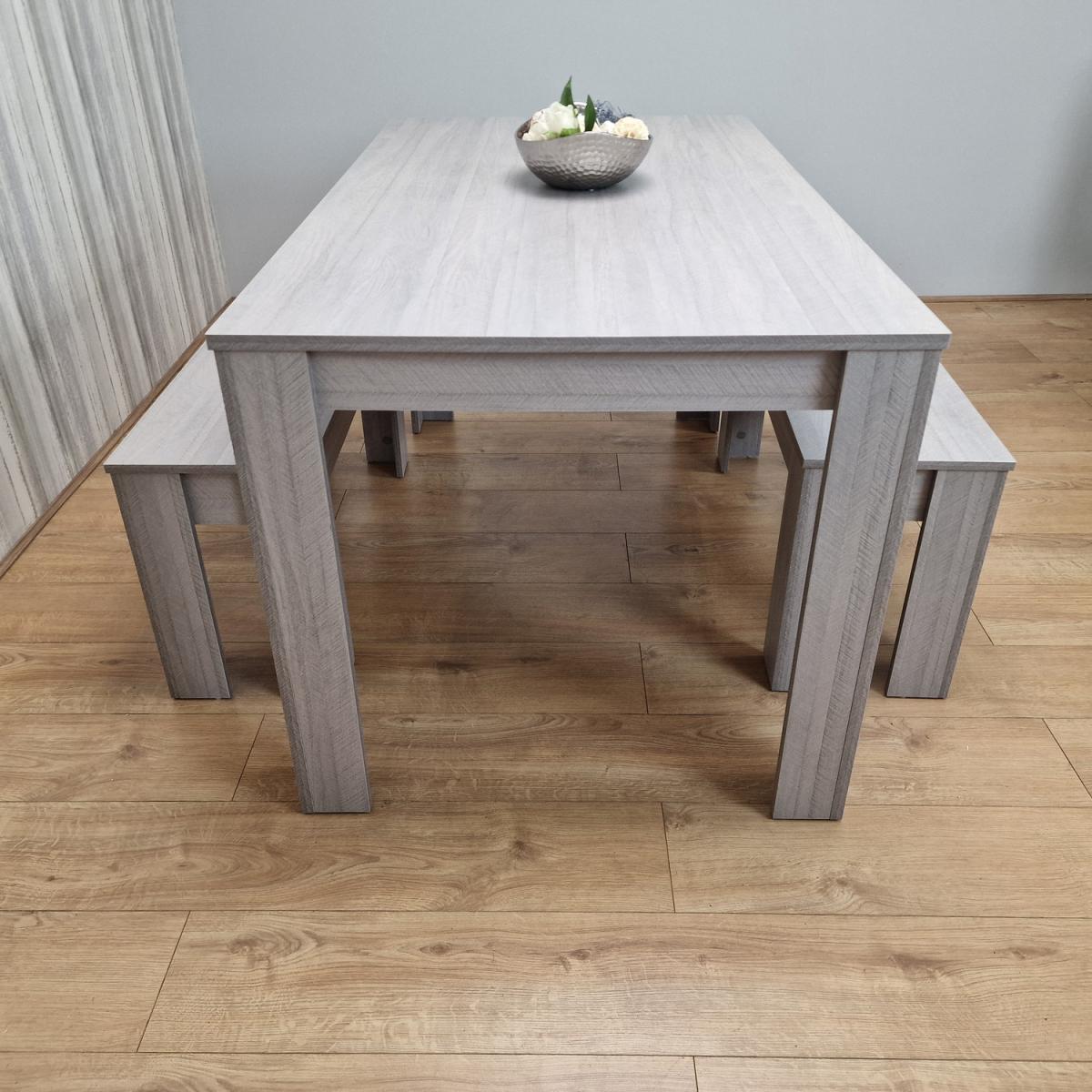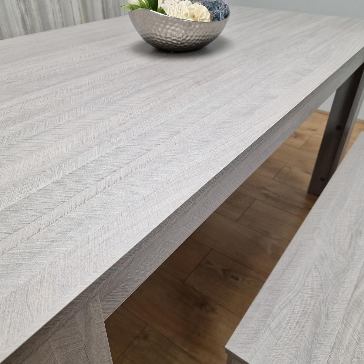 Introducing our captivating Grey Arrow Flat Pack Dining Set, where impeccable design meets convenient assembly. This ensemble is a testament to modern aesthetics and practicality, offering you a dining experience that's both visually stunning and effortlessly functional. At the core of this set lies the Grey Arrow dining table, skilfully constructed from premium Medium Density Fibreboard (MDF). The table's distinctive arrow effect surface showcases an artistic dimension that adds intrigue and sophistication to your dining space. The refined grey hue not only complements a range of interior styles but also exudes an air of elegance. Paired seamlessly with the table are two benches, meticulously crafted from the same high-quality MDF material and finished in the same elegant grey shade. This uniformity in design and colour ensures a cohesive and polished look that ties the entire set together harmoniously. The benches, thoughtfully dimensioned for comfort and functionality, are perfect for creating a relaxed and inclusive dining atmosphere. What sets our Grey Arrow Flat Pack Dining Set apart is its ease of assembly. Designed with convenience in mind, the flat pack format ensures hassle-free setup, allowing you to enjoy your new dining set in no time. The carefully crafted components and detailed instructions make assembling the set a straightforward and gratifying process. Table size : (W)117 x (D)70 x (H)75cm. Bench size : 44(W) x 59(D) x 81(H)cm.