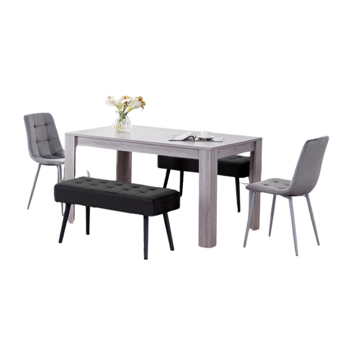A stunning wooden arrow grey design dining table set includes a set of 2 tufted velvet grey rocco chairs with a slightly curved back design, and 2 benches. The chic grey black dining bench includes a soft black velvet padded seat with stylish stitching and tufting. The dining table color is grey with an arrow grey design. The dining chairs are grey with a slightly curved back design to fit the body shape. The padded seat of the bench features elegant stitching and tufted details, giving it a modern yet cosy look. The dinner table is crafted with high-quality MDF and a melamine laminated finish to ensure a durable, long-lasting tabletop. The dining chairs are made of premium velvet with metal chair legs. With sturdy metal legs, this bench is built to last and blends easily with any decor. Dimensions The dining room chairs' sizes are H87 x L59 x W44 cm. Dining table size is H75 x L140 x W80 cm. The seat height of the chair is 45 cm. Bench size is 90cm (L) x 36cm (W) x 47cm (H). Straightforward assembly is supported by clear instructions for our dining table set. FEATURESThe dining set includes a table, 2 high-quality chairs, and 2 benches. Dining table made of high-quality MDF and a melamine laminated finish. Chairs made of premium velvet with metal chair legs. Legs prevent damage with the adjustable foot protection provided.