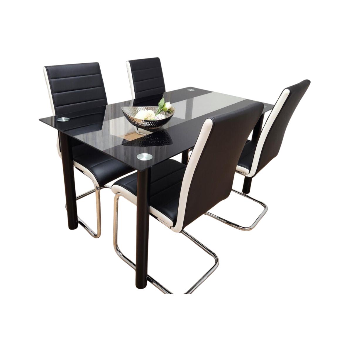 A Stunning clear glass with a beautiful black double-striped design Dining Table set includes set of 4 faux leather chairs with slight arched backs. The dining table colour is clear with black double-striped design. The dining chairs colours are black with slight arched backs. The dinner table is crafted with 8mm high-quality black tempered glass with metal legs to ensure a durable, long-lasting tabletop. The dining chairs are made of premium leather with slight arched backs and curved legs. Dimensions The dining room chairs sizes are H100 x L42 x W57 cm. Dining table size is H75 x L120 x W70 cm. The seat height of the chair is 45 cm. Straightforward assembly is supported by clear instructions for our dining table set The Dining set includes a table, 4 high-quality chairs. Dining table made of 8mm high-quality tempered glass with metal legs. Chairs material is premium leather with slight arched backs and curved legs. Legs prevent damage with the adjustable foot protection provided. Chair Size H100 x L42 x W57 cm. Table Size H75 x L120 x W70 cm. The seat height of these chairs is 45 cm. Convenient format with instructions for easy assembly.