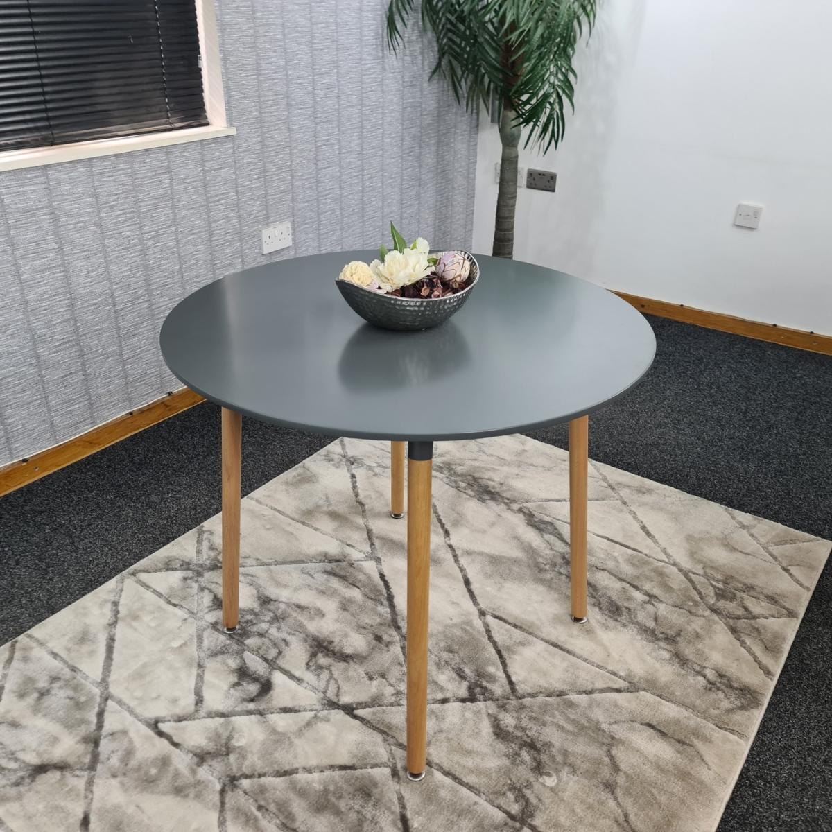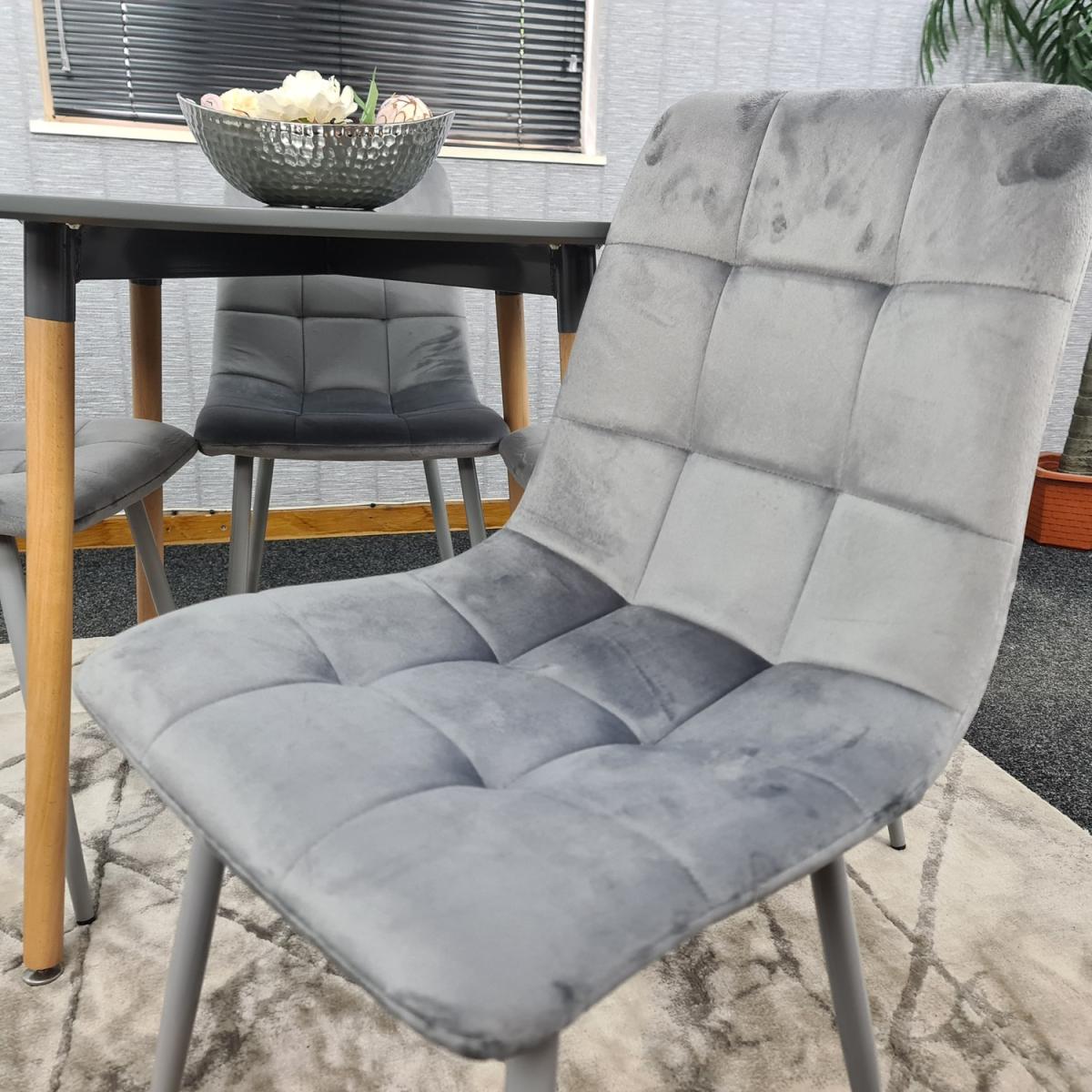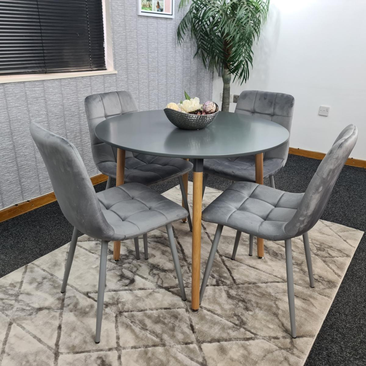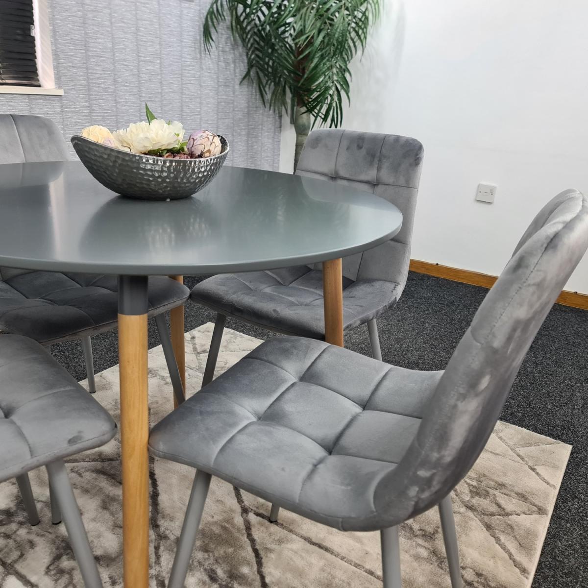 Stylish and modern grey round table and 4 grey velvet chairs set, Transform & brighten your dining area with this stunning, contemporary grey dining table with 4 grey velvet chairs. The chairs are of a modern design. The table is made from wood, transforming your dining room and looks so spectacular and unique. The item comes flat packed and requires some home assembly.