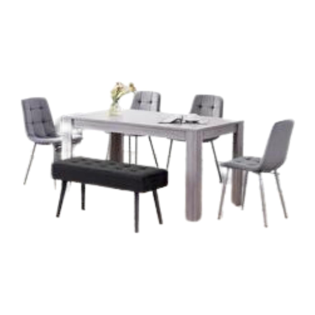 A stunning wooden arrow grey design dining table set includes a set of 4 tufted velvet grey Rocco chairs with slightly curved back design and 1 bench. The chic grey black dining bench includes a soft black velvet padded seat with stylish stitching and tufting. The dining table colour is grey with an arrow grey design. The dining chairs are grey with a slightly curved back design for fitting the body shape. The padded seat of the bench features elegant stitching and tufted details, giving it a modern yet cosy look. The dinner table is crafted with high-quality MDF and a melamine laminated finish to ensure a durable, long-lasting tabletop. The dining chairs are made of premium velvet with metal chair legs. With sturdy metal legs, this bench is built to last and blends easily with any decor. Dimensions The dining room chair sizes are H87 x L59 x W44 cm. Dining table size is H75 x L140 x W80 cm. The seat height of the chair is 45 cm. Bench size is 90cm (L) x 36cm (W) x 47cm (H). Straightforward assembly is supported by clear instructions for our dining table set. FEATURESThe dining set includes a table, 4 high-quality chairs, and 1 bench. Dining table made of high-quality MDF and a melamine laminated finish. Chairs material is premium velvet with metal chair legs. Legs prevent damage with the adjustable foot protection provided.